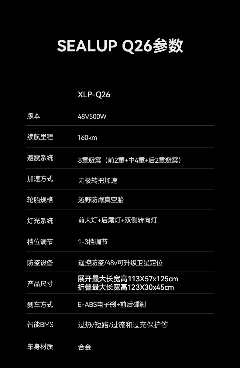 | Color Classification | Q26/48V White/National 3C Jinyuxing Motor/37.5Ah about 160 Kilometers,Q26/48V Black/National 3C Jinyuxing Motor/37.5Ah about 160 Kilometers,Q26/60V White/National 3C Jinyuxing Motor/30Ah about 160 Kilometers,Q26/60V Black/National 3C Jinyuxing Motor/30Ah about 160 Kilometers,Q26/48V Black/Dual Drive 1000W/National 3C Jinyuxing Motor/37.5Ah about 160 Kilometers,Q26/48V White/Dual Drive 1000W/National 3C Jinyuxing Motor/37.5Ah about 160 Kilometers |