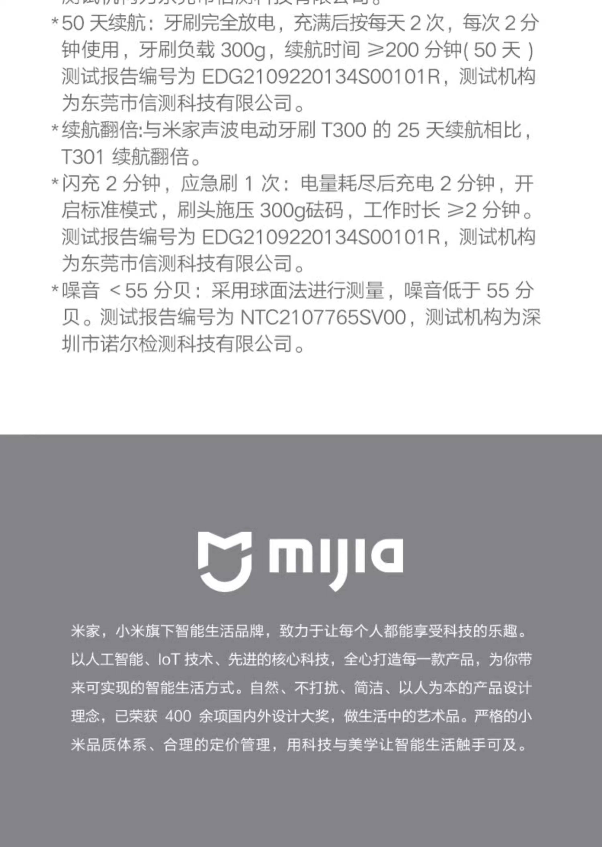 | Color Classification | [Wireless Charging] Xiaomi Electric Toothbrush T301 (Special Offer No Gifts),[Half-Year Package] Xiaomi Electric Toothbrush T301+Customized Brush Head*4,[Half-Year Package] Xiaomi Electric Toothbrush T301+Customized Brush Head*4+Wall Mount*1+Mouthwash Cup*1+Toothbrush Box*1,[One-Year Package] Xiaomi Electric Toothbrush T301+Customized Brush Head*8,[One-Year Package] Xiaomi Electric Toothbrush T301+Customized Brush Head*8+Wall Mount*1+Mouthwash Cup*1+Toothbrush Box,[T300 Half-Year Set] T300+Customized Brush Heads*6,[T300 Value Pack] T300+Customized Brush Head*6+Mouthwash Cup*1+Wall Hanging*1+Toothbrush Box*1 |