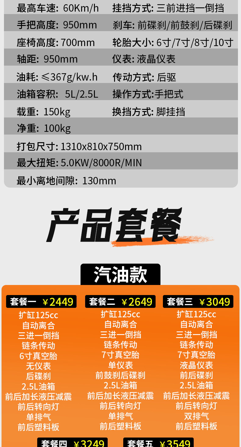 | Color Classification | Gasoline Version: Package 1,Gasoline Version: Package 2,Gasoline Version: Package Three,Gasoline Version: Package Four,Gasoline Version: Package Five,Electric Version: Package Six,Electric Version: Package 7,Electric Version: Package 8,Electric Version: Package Nine,Electric Version: Package 10,Advance Payment: Balance Payment Upon Arrival of Goods |