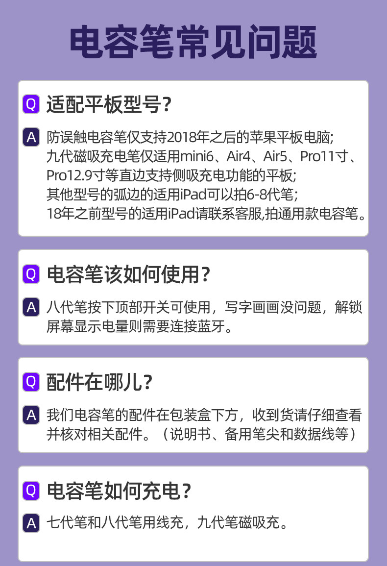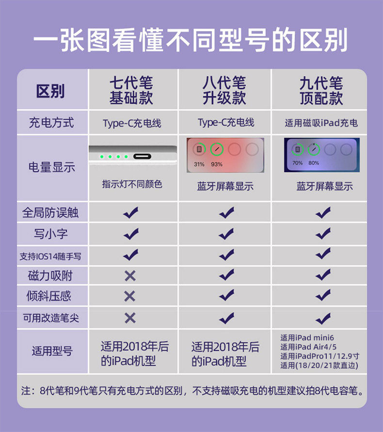 | Color Classification | ⭐Understand the Differences between Various Models with One Picture,7Th Generation Basic Model[Educational Discounts♥Full Screen Anti-Accidental Touch✔Supports Handwriting✔],8Th Generation Upgraded Model[Screen Display Power | Support Modified Pen Tip New],9Th Generation Magnetic Charging Model[Only Supports 8.3/10.9/11/12.9inch iPad],[Package]8Th Generation Upgrade +7.9inch Mini5 Paper Film,[Package]8Th Generation Upgrade +8.3inch Mini6 Paper Film,[Package]8Th Generation Upgrade +9.7inch Ipad6 Paper Film,[Package]8Th Generation Upgrade +10.2inch Ipad7/8/9 Paper Film,[Package]8Th Generation Upgrade +10.5inch Air3 Paper Film,[Package]8Th Generation Upgrade +10.9inch Air4/5 Paper Film,[Package]8Th Generation Upgraded Model + 11inch Pro Paper-Like Film,[Package]8Th Generation Upgrade +12.9inch Pro Paper Film,[Package]9Th Generation Top Model +8.3inch Mini6 Paper Film,[Package]9Th Generation Top Model +10.9inch Air4/5 Paper Film,[Package]9Th Generation Top Model + 11inch Pro Paper-Like Film,[Package]9Th Generation Top Model +12.9inch Pro Paper Film,[Package]8Th Generation Upgraded Model + 2 Ultra-Wear-Resistant Modified Pen Tips,[Package]8Th Generation Upgraded Model + 2 Transparent Bare-Feel Modified Pen Tips,[Package]8Th Generation Upgraded Model + 2 Silent Modified Pen Tips,[Package]8Th Generation Upgraded Model + 2 Transparent Syringe Modified Pen Tips,[Package]8Th Generation Upgrade +4.2 Needle Tube Modified Pen Tips |