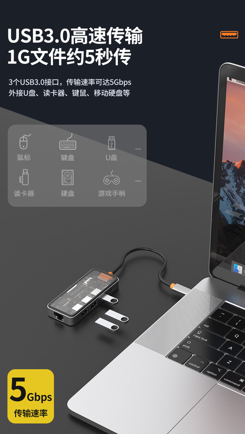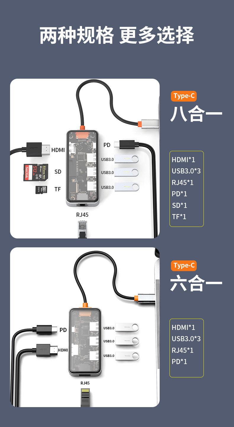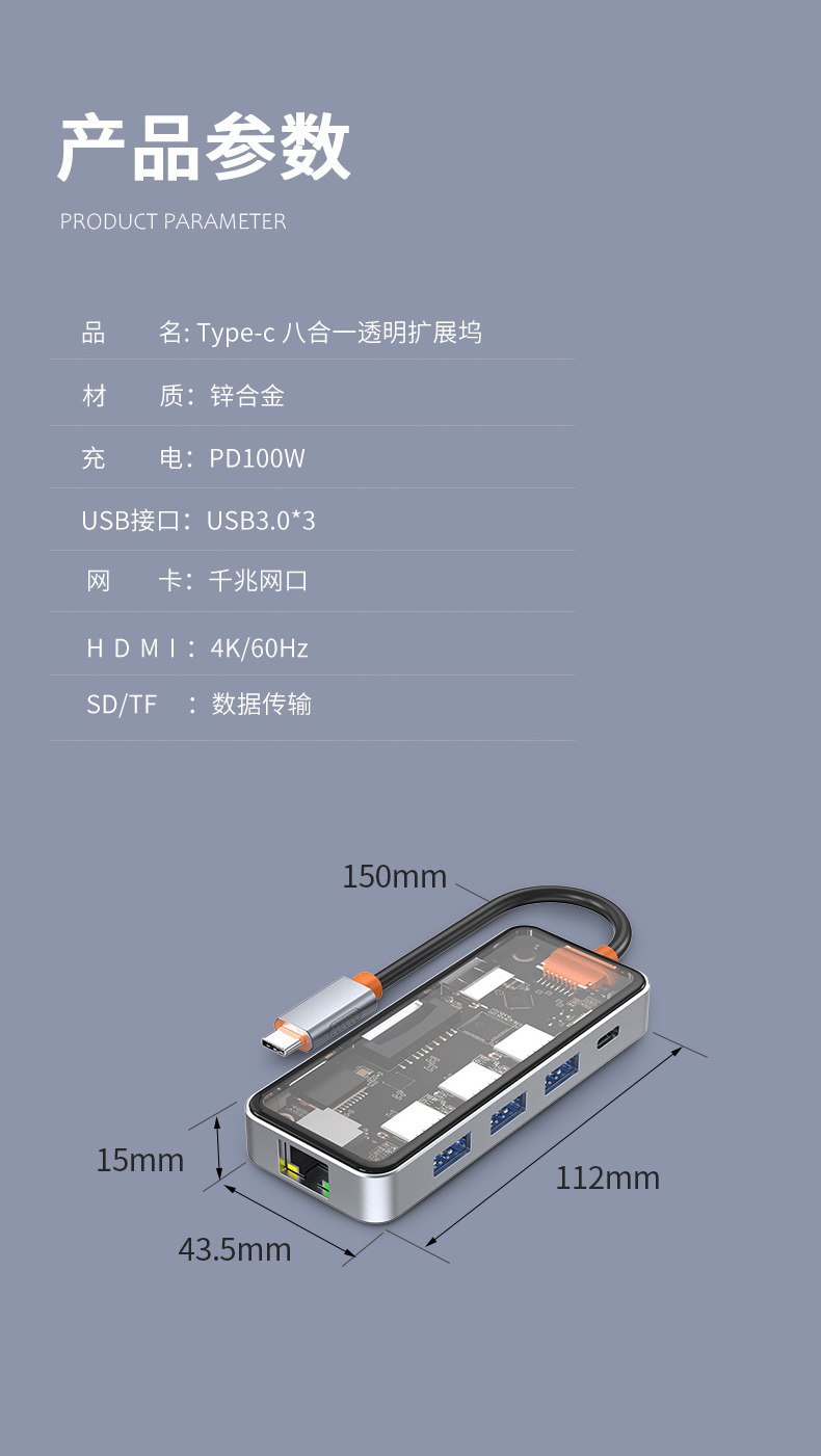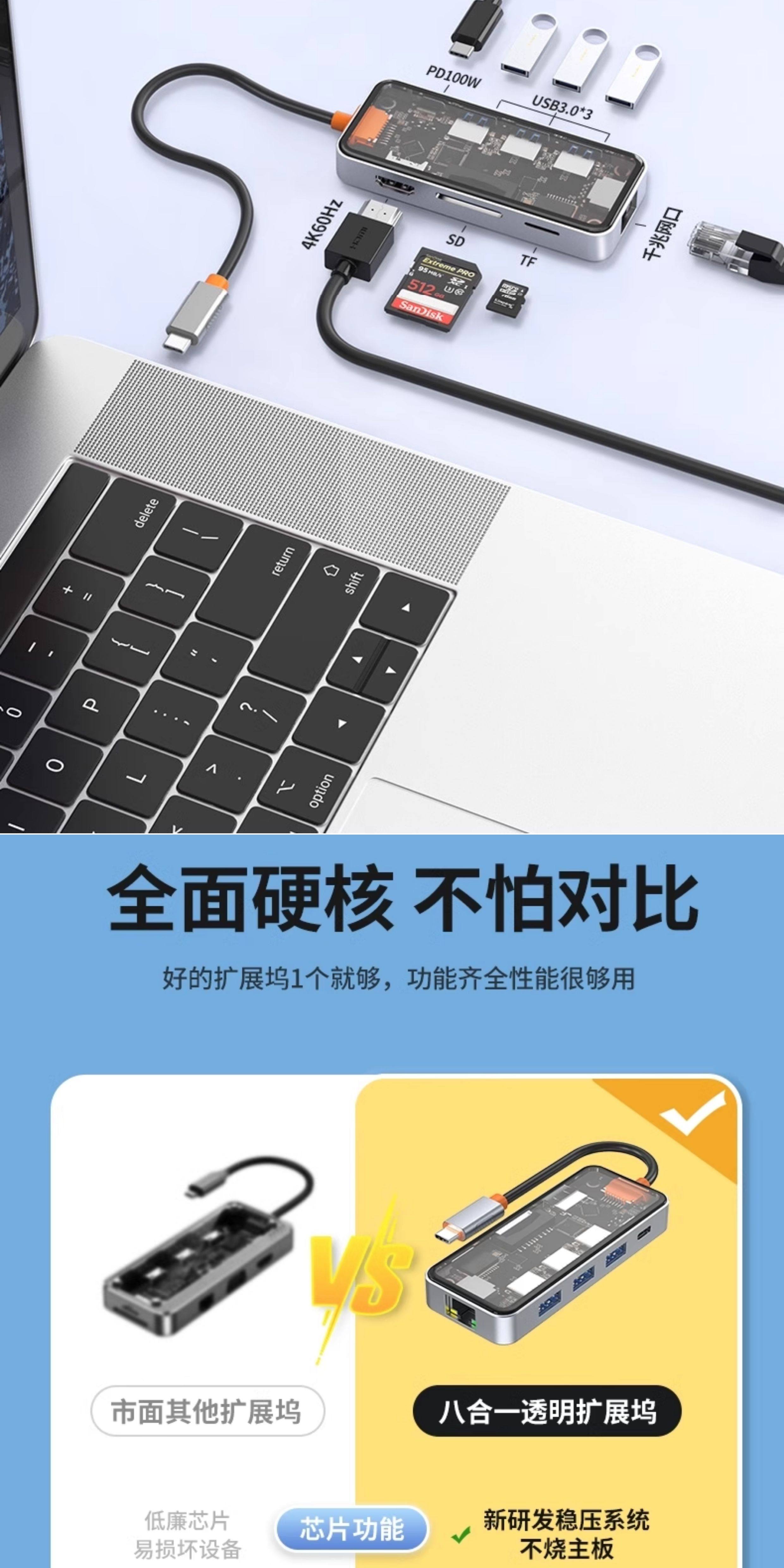 | Color Classification | 8-in-1 Transparent Model[HDMI1.4+USB3.0+USB2.0+PD+TYPEC2.0+ SD/TF2.0+RJ45100M]4K30,8-in-1 Transparent Upgraded Model[HDMI2.0+USB3.0*3+PD3.0+SD/TF2.0+RJ451000M]4K60,Eleven in One[Special Price]While Supplies Last |