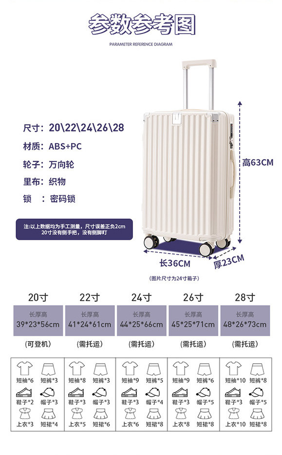 | Size | 20inch[Meets Carry-On Standards + + Luggage Cover Sticker],22inch[Strict Quality Standards + + Box Cover Stickers],24inch[Strict Quality Standards + + Box Cover Stickers],26inch[Strict Quality Standards + + Box Cover Stickers],28inch[Strict Quality Standards + + Box Cover Stickers] |