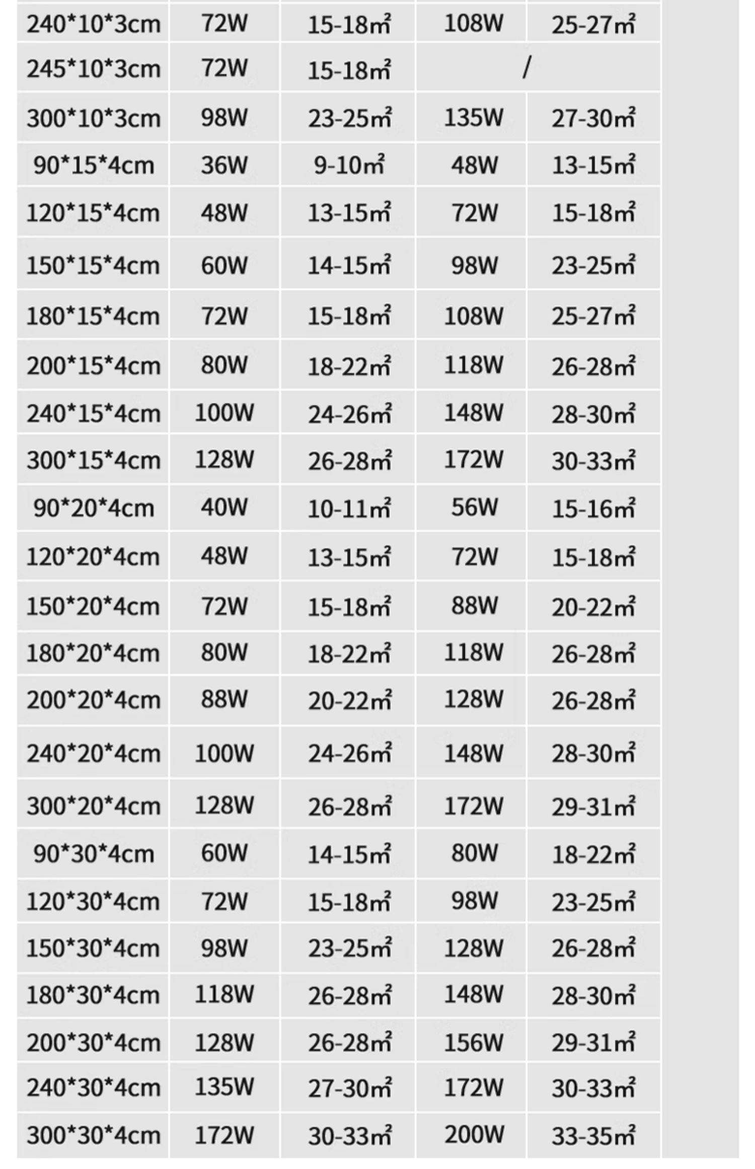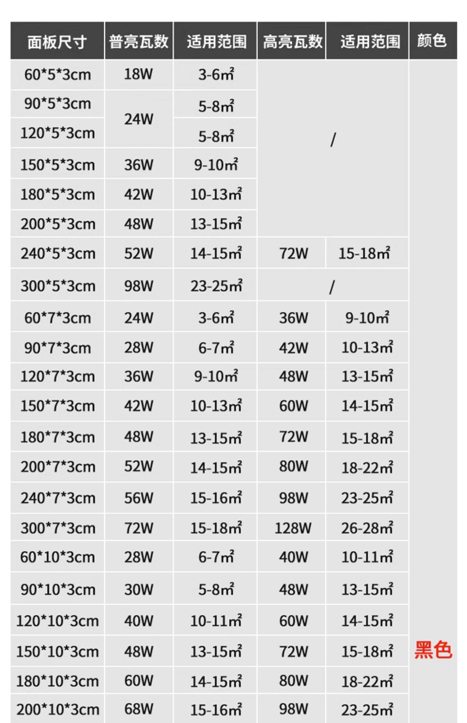 | Color Classification | Various Light Colors[Warm Light 3000K/White Light 6000K]Please Contact Customer Service for Details/Please Leave a Message When Placing an Order,[Black Shell 60*5*3cm]-18W Neutral Light,[Black Shell 90*5*3cm]-24W Neutral Light,[Black Shell 120*5*3cm]-24W Neutral Light,[Black Shell 150*5*3cm]-36W Neutral Light,[Black Shell 180*5*3cm]-42W Neutral Light,[Black Shell 200*5*3cm]-48W Neutral Light,[Black Shell 240*5*3cm]-52W Neutral Light,[Black Shell 240*5*3cm]-72W Neutral Light,[Black Shell 300*5*3cm]-98W Neutral Light,[Black Shell 60*7*3cm]-24W Neutral Light,[Black Shell 60*7*3cm]-36W Neutral Light,[Black Shell 90*7*3cm]-28W Neutral Light,[Black Shell 90*7*3cm]-42W Neutral Light,[Black Shell 120*7*3cm]-36W Neutral Light,[Black Shell 120*7*3cm]-48W Neutral Light,[Black Shell 150*7*3cm]-42W Neutral Light,[Black Shell 150*7*3cm]-60W Neutral Light,[Black Shell 180*7*3cm]-48W Neutral Light,[Black Shell 180*7*3cm]-72W Neutral Light,[Black Shell 200*7*3cm]-52W Neutral Light,[Black Shell 200*7*3cm]-80W Neutral Light,[Black Shell 300*7*3cm]-72W Neutral Light,[Black Shell 300*7*3cm]-128W Neutral Light,[Black Shell 60*10*3cm]-28W Neutral Light,[Black Shell 60*10*3cm]-40W Neutral Light,[Black Shell 90*10*3cm]-30W Neutral Light,[Black Shell 90*10*3cm]-48W Neutral Light,[Black Shell 120*10*3cm]-40W Neutral Light,[Black Shell 120*10*3cm]-60W Neutral Light,[Black Shell 150*10*3cm]-48W Neutral Light,[Black Shell 150*10*3cm]-72W Neutral Light,[Black Shell 180*10*3cm]-60W Neutral Light,[Black Shell 180*10*3cm]-80W Neutral Light,[Black Shell 200*10*3cm]-68W Neutral Light,[Black Shell 200*10*3cm]-98W Neutral Light,[Black Shell 240*10*3cm]-72W Neutral Light,[Black Shell 240*10*3cm]-108W Neutral Light,[Black Shell 300*10*3cm]-98W Neutral Light,[Black Shell 300*10*3cm]-72W Neutral Light,[Black Shell 90*15*4cm]-36W Neutral Light,[Black Shell 90*15*4cm]-48W Neutral Light,[Black Shell 120*15*4cm]-48W Neutral Light,[Black Shell 120*15*4cm]-72W Neutral Light,[Black Shell 150*15*4cm]-60W Neutral Light,[Black Shell 150*15*4cm]-98W Neutral Light,[Black Shell 180*15*4cm]-72W Neutral Light,[Black Shell 180*15*4cm]-108W Neutral Light,[Black Shell 200*15*4cm]-80W Neutral Light,[Black Shell 200*15*4cm]-118W Neutral Light,[Black Shell 240*15*4cm]-100W Neutral Light,[Black Shell 240*15*4cm]-148W Neutral Light,[Black Shell 300*15*4cm]-128W Neutral Light,[Black Shell 300*15*4cm]-172W Neutral Light,[Black Shell 90*20*4cm]-40W Neutral Light,[Black Shell 90*20*4cm]-56W Neutral Light,[Black Shell 120*20*4cm]-48W Neutral Light,[Black Shell 120*20*4cm]-72W Neutral Light,[Black Shell 150*20*4cm]-72W Neutral Light,[Black Shell 150*20*4cm]-88W Neutral Light,[Black Shell 180*20*4cm]-80W Neutral Light,[Black Shell 180*20*4cm]-118W Neutral Light,[Black Shell 200*20*4cm]-88W Neutral Light,[Black Shell 200*20*4cm]-128W Neutral Light,[Black Shell 240*20*4cm]-100W Neutral Light,[Black Shell 240*20*4cm]-148W Neutral Light,[Black Shell 300*20*4cm]-128W Neutral Light,[Black Shell 300*20*4cm]-172W Neutral Light,[Black Shell 90*30*4cm]-60W Neutral Light,[Black Shell 90*30*4cm]-80W Neutral Light,[Black Shell 120*30*4cm]-72W Neutral Light,[Black Shell 120*30*4cm]-98W Neutral Light,[Black Shell 150*30*4cm]-98W Neutral Light,[Black Shell 150*30*4cm]-128W Neutral Light,[Black Shell 180*30*4cm]-118W Neutral Light,[Black Shell 180*30*4cm]-148W Neutral Light,[Black Shell 200*30*4cm]-128W Neutral Light,[Black Shell 200*30*4cm]-156W Neutral Light,[Black Shell 240*30*4cm]-135W Neutral Light,[Black Shell 240*30*4cm]-172W Neutral Light,[Black Shell 300*30*4cm]-172W Neutral Light,[Black Shell 300*30*4cm]-200W Neutral Light,Supports Non-Standard Personalized Sizes, Please Contact Customer Service |