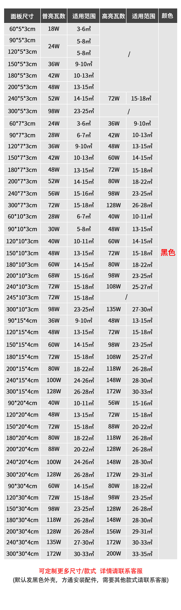 | Color Classification | Want Other Light Colors/Colors - Please Leave a Message,[Black Shell 60*5*3cm]-18W Warm Light,[Black Shell 90*5*3cm]-24W Warm Light,[Black Shell 120*5*3cm]-24W Warm Light,[Black Shell 150*5*3cm]-36W Warm Light,[Black Shell 180*5*3cm]-42W Warm Light,[Black Shell 200*5*3cm]-48W Warm Light,[Black Shell 300*5*3cm]-98W Warm Light,[Black Shell 60*7*3cm]-24W Warm Light,[Black Shell 60*7*3cm]-36W Warm Light,[Black Shell 90*7*3cm]-28W Warm Light,[Black Shell 90*7*3cm]-42W Warm Light,[Black Shell 120*7*3cm]-36W Warm Light,[Black Shell 120*7*3cm]-48W Warm Light,[Black Shell 150*7*3cm]-42W Warm Light,[Black Shell 150*7*3cm]-60W Warm Light,[Black Shell 180*7*3cm]-48W Warm Light,[Black Shell 180*7*3cm]-72W Warm Light,[Black Shell 200*7*3cm]-52W Warm Light,[Black Shell 200*7*3cm]-80W Warm Light,[Black Shell 300*7*3cm]-72W Warm Light,[Black Shell 300*7*3cm]-128W Warm Light,[Black Shell 60*10*3cm]-28W Warm Light,[Black Shell 60*10*3cm]-40W Warm Light,[Black Shell 90*10*3cm]-30W Warm Light,[Black Shell 90*10*3cm]-48W Warm Light,[Black Shell 120*10*3cm]-40W Warm Light,[Black Shell 120*10*3cm]-60W Warm Light,[Black Shell 150*10*3cm]-48W Warm Light,[Black Shell 150*10*3cm]-72W Warm Light,[Black Shell 180*10*3cm]-60W Warm Light,[Black Shell 180*10*3cm]-80W Warm Light,[Black Shell 200*10*3cm]-68W Warm Light,[Black Shell 200*10*3cm]-98W Warm Light,[Black Shell 240*10*3cm]-72W Warm Light,[Black Shell 240*10*3cm]-108W Warm Light,[Black Shell 300*10*3cm]-98W Warm Light,[Black Shell 90*15*4cm]-36W Warm Light,[Black Shell 90*15*4cm]-48W Warm Light,[Black Shell 120*15*4cm]-48W Warm Light,[Black Shell 120*15*4cm]-72W Warm Light,[Black Shell 150*15*4cm]-60W Warm Light,[Black Shell 150*15*4cm]-98W Warm Light,[Black Shell 180*15*4cm]-72W Warm Light,[Black Shell 180*15*4cm]-108W Warm Light,[Black Shell 200*15*4cm]-80W Warm Light,[Black Shell 200*15*4cm]-118W Warm Light,[Black Shell 240*15*4cm]-100W Warm Light,[Black Shell 240*15*4cm]-148W Warm Light,[Black Shell 300*15*4cm]-128W Warm Light,[Black Shell 300*15*4cm]-172W Warm Light,[Black Shell 90*20*4cm]-40W Warm Light,[Black Shell 90*20*4cm]-56W Warm Light,[Black Shell 120*20*4cm]-48W Warm Light,[Black Shell 120*20*4cm]-72W Warm Light,[Black Shell 150*20*4cm]-72W Warm Light,[Black Shell 150*20*4cm]-88W Warm Light,[Black Shell 180*20*4cm]-80W Warm Light,[Black Shell 180*20*4cm]-118W Warm Light,[Black Shell 200*20*4cm]-88W Warm Light,[Black Shell 200*20*4cm]-128W Warm Light,[Black Shell 240*20*4cm]-100W Warm Light,[Black Shell 240*20*4cm]-148W Warm Light,[Black Shell 300*20*4cm]-128W Warm Light,[High Black Shell 300*20*4cm]-172W Warm Light,[Black Shell 90*30*4cm]-60W Warm Light,[Black Shell 90*30*4cm]-80W Warm Light,[Black Shell 120*30*4cm]-72W Warm Light,[Black Shell 120*30*4cm]-98W Warm Light,[Black Shell 150*30*4cm]-98W Warm Light,[Black Shell 150*30*4cm]-128W Warm Light,[Black Shell 180*30*4cm]-118W Warm Light,[Black Shell 180*30*4cm]-148W Warm Light,[Black Shell 200*30*4cm]-128W Warm Light,[Black Shell 200*30*4cm]-156W Warm Light,[Black Shell 240*30**4cm]-135W Warm Light,[Black Shell 240*30*4cm]-172W Warm Light,[Black Shell 300*30*4cm]-172W Warm Light,[Black Shell 300*30*4cm]-200W Warm Light,Supports Non-Standard Personalized Sizes, Please Contact Customer Service |