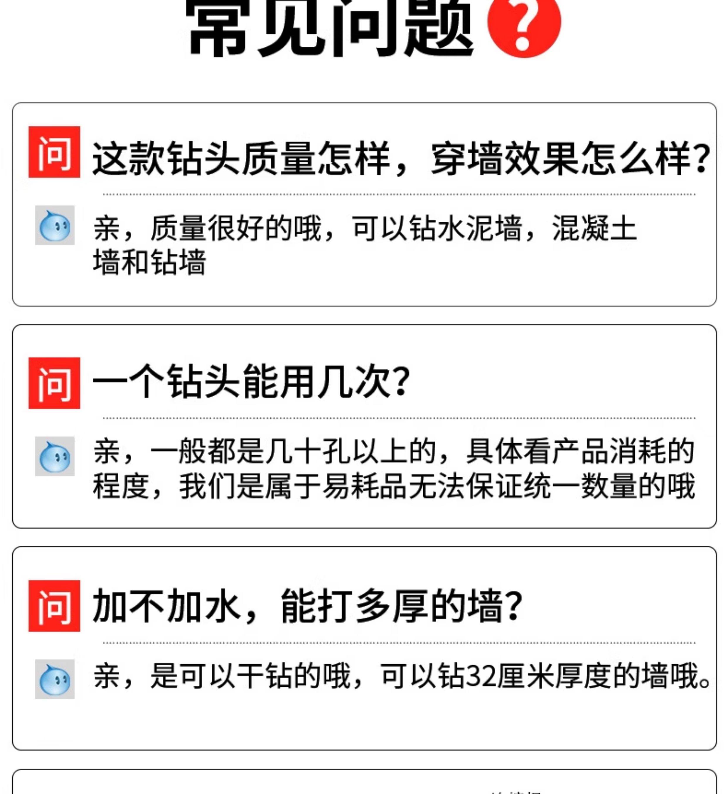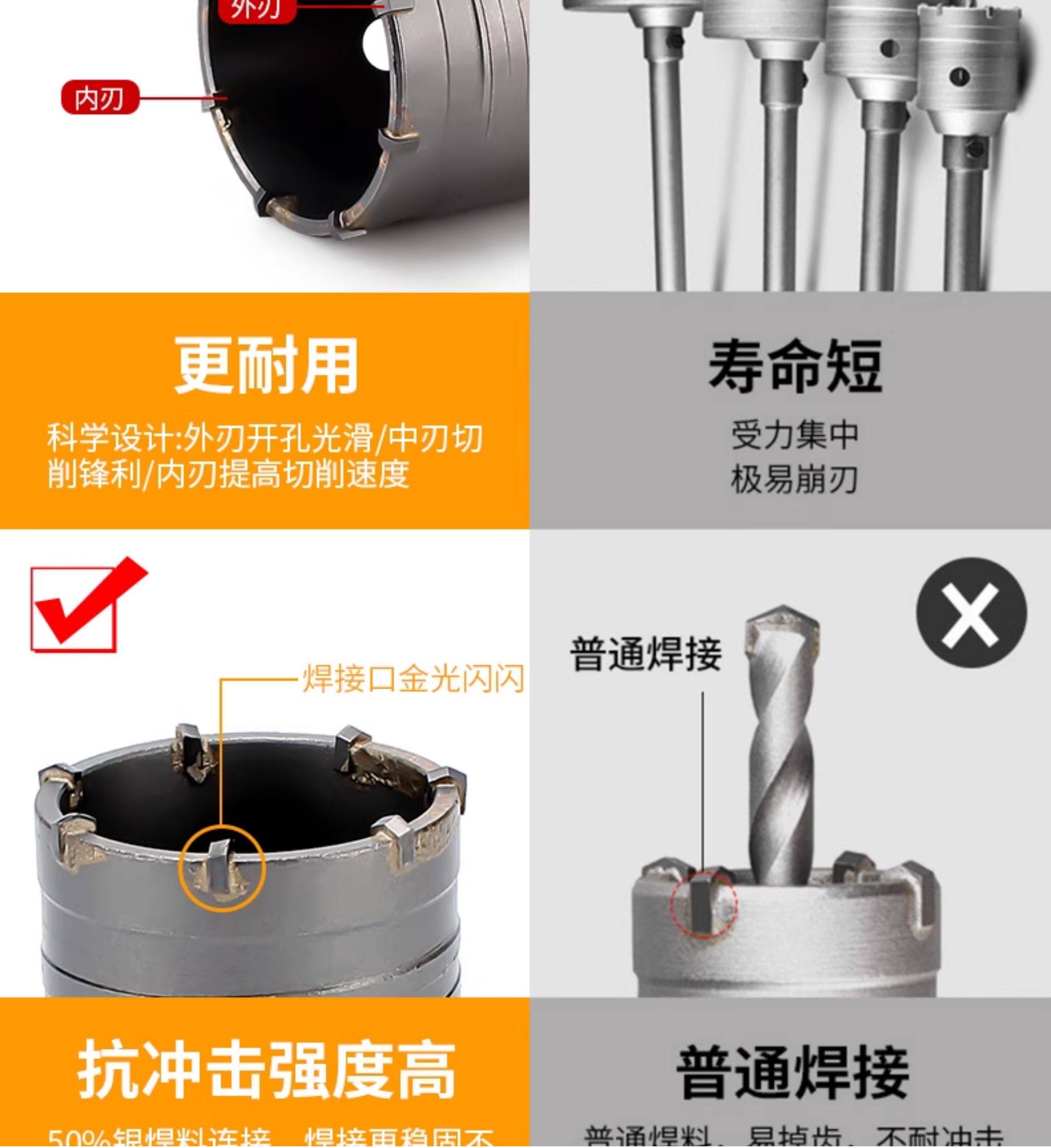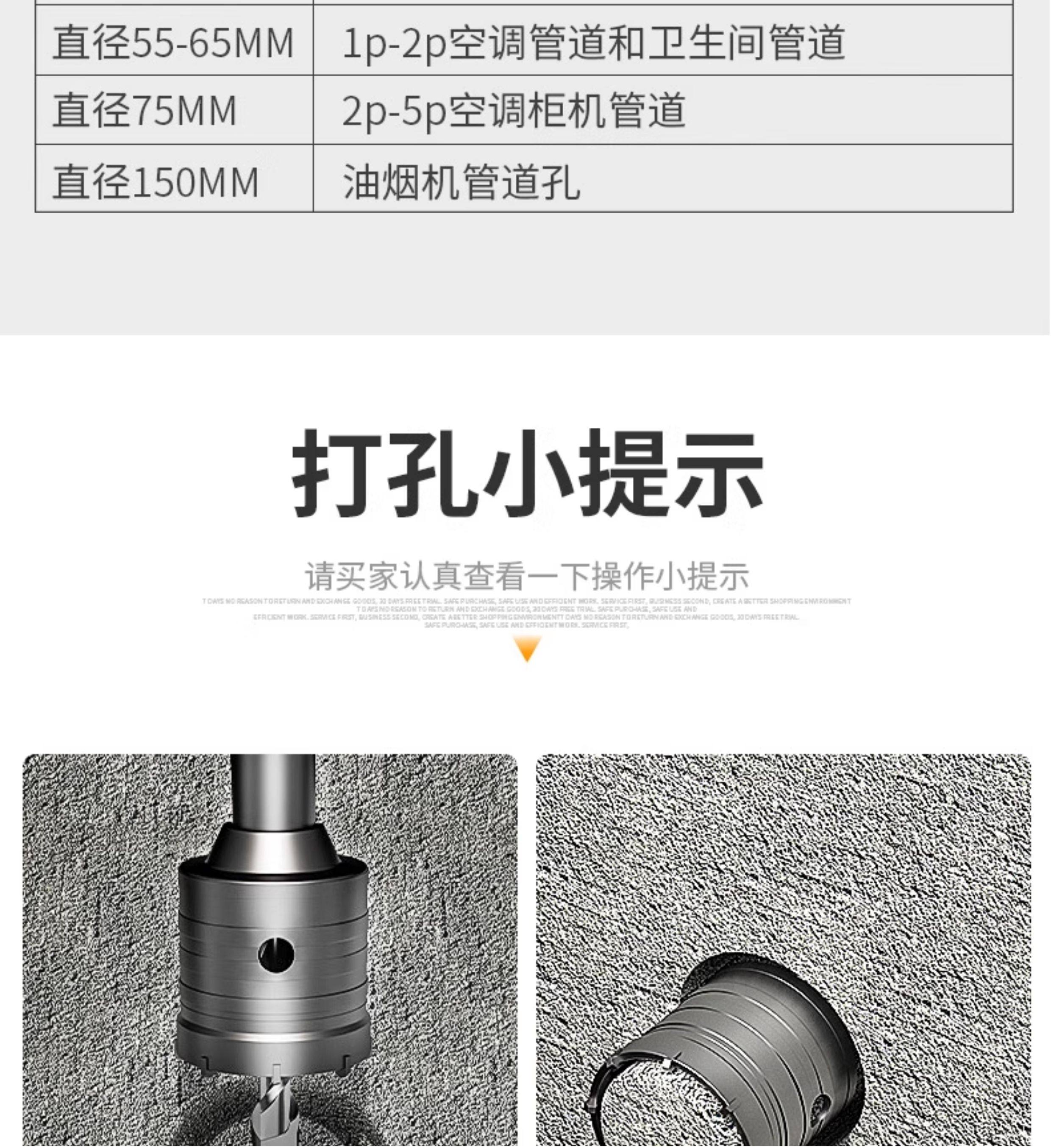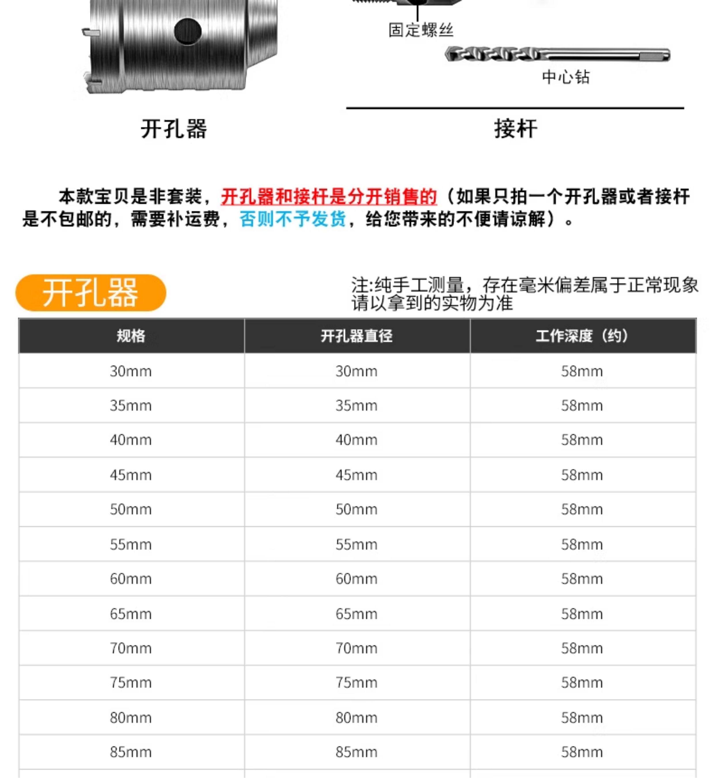 | Color Classification | Square Handle 30mm Wall Piercing Set [4 Tubes],Square Handle 35mm Wall Piercing Set [6-Point Tube],Square Handle 40mm Wall Piercing Set [1inch Tubes],Square Handle 45mm Wall Piercing Set,Square Handle 50mm Wall Piercing Set,Square Handle 55mm Wall Piercing Set [1.5inch Tubes],Square Handle 60mm Wall-Mounted Set [1P Wall-Mounted Air Conditioner],Square Handle 65mm Wall-Mounted Set [1P-1.5P Wall-Mounted Air Conditioner],Square Handle 70mm Wall-Mounted Set [1P-2P Wall-Mounted Air Conditioner],Square Handle 75mm Wall Penetration Set [2P-5P Cabinet Air Conditioner/Bathroom Exhaust Pipe],Square Handle 80mm Wall Piercing Set [Heating Furnace Smoke Pipe],Square Handle 85mm Wall Piercing Set,Square Handle 90mm Wall Piercing Set,Square Handle 95mm Wall Piercing Set,Square Handle 100mm Wall Piercing Set,Square Handle 105mm Wall Piercing Set,Square Handle 110mm Wall Piercing Set [Bathroom Exhaust Pipe/86 Wire Box Hole Opener],Square Handle 115mm Wall Piercing Set [86 Wire Box Hole Opener],Square Handle 120mm Wall Piercing Set [86 Wire Box Hole Opener],Round Handle 30mm Wall Piercing Set [4-Point Tube],Round Handle 35mm Wall Piercing Set [6-Point Tube],Round Handle 40mm Wall Piercing Set [1inch Tubes],Round Handle 45mm Wall Piercing Set,Round Handle 50mm Wall Piercing Set,Round Handle 55mm Wall Piercing Set [1.5inch Tubes],Round Handle 60mm Wall Piercing Set [1P Air Conditioner],Round Handle 65mm Wall Piercing Set [1P-1.5P Wall-Mounted Air Conditioner],Round Handle 70mm Wall Piercing Set [1P-2P Wall-Mounted Air Conditioner],Round Handle 75mm Wall Penetration Set [2P-5P Cabinet Air Conditioner/Bathroom Exhaust Pipe],Round Handle 80mm Wall Piercing Set [Heating Furnace Smoke Pipe],Round Handle 85mm Wall Piercing Set,Round Handle 90mm Wall Piercing Set,Round Handle 95mm Wall Piercing Set,Round Handle 100mm Wall Piercing Set,Round Handle 105mm Wall Piercing Set,Round Handle 110mm Wall Piercing Set [Bathroom Exhaust Pipe/86 Wire Box Hole Opener],Round Handle 115mm Wall Piercing Set [86 Wire Box Hole Opener],Round Handle 120mm Wall Piercing Set [86 Wire Box Hole Opener] |