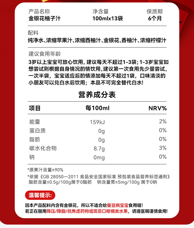 | Taste | 【Get Your Lunar New Year Shopping Started!】Menglan Collaboration Honeysuckle & Pomelo Juice Gift Box - 13 Sachets,Honeysuckle and Grapefruit Juice Gift Box 13 Bags + Children's Hawthorn Juice Gift Box 13 Bags,Honeysuckle and Grapefruit Juice Gift Box 13 Bags* [2 Boxes],[Gift Box] Honeysuckle Grapefruit Juice (100Ml/Bag*22 Bags),[Free 1 Bag] Honeysuckle Grapefruit Juice (100Ml/Bag*12 Bags) [Not in Gift Box],[Limited Release] Menglan Collaboration Gift Box - 13 Bags |