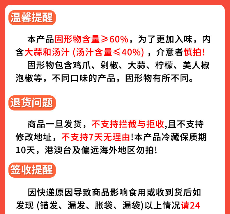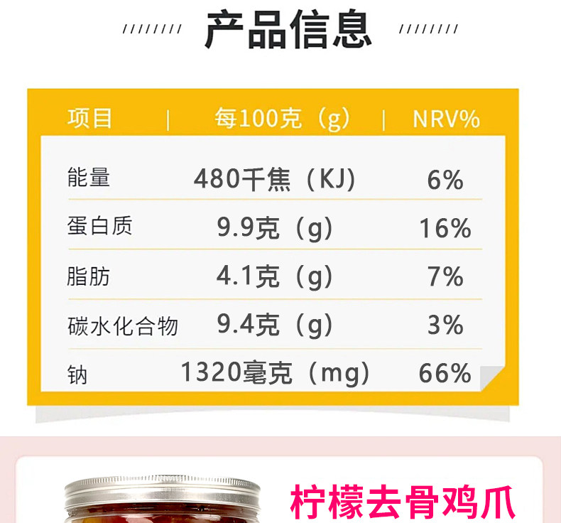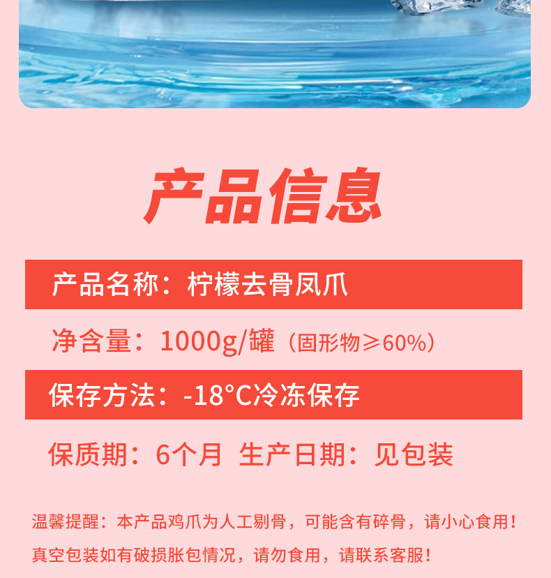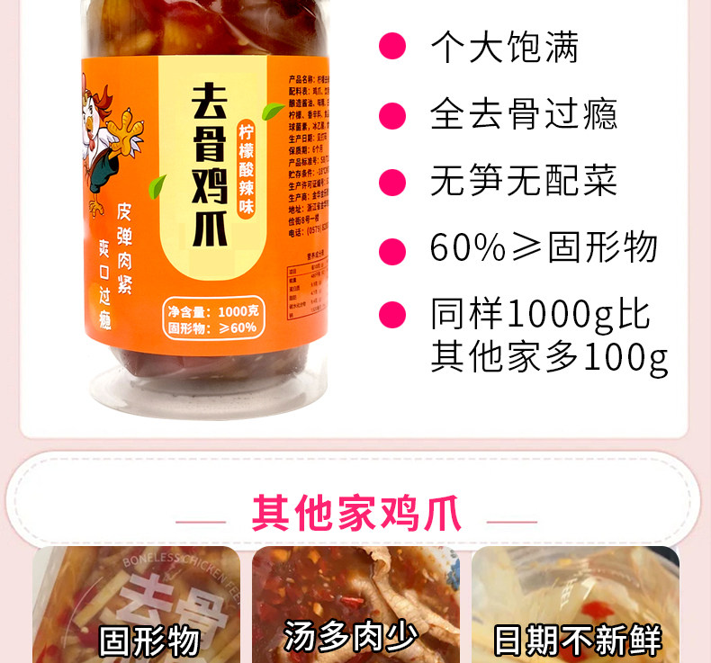 | Taste | Lemon Hot and Sour Chicken Feet 1000g*1 Can,Sichuan Pepper Spicy Chicken Feet 1000g * 1 Can,Garlic Boneless Chicken Feet 1000g*1 Can,Lemon Hot and Sour Chicken Feet 500g*2 Cans,Lemon Hot and Sour Chicken Feet 1500g (500G+1000G) 2 Cans in Total,Lemon Hot and Sour Chicken Feet 1000g*2 Cans,Lemon Hot and Sour Chicken Feet 500g*4 Cans |