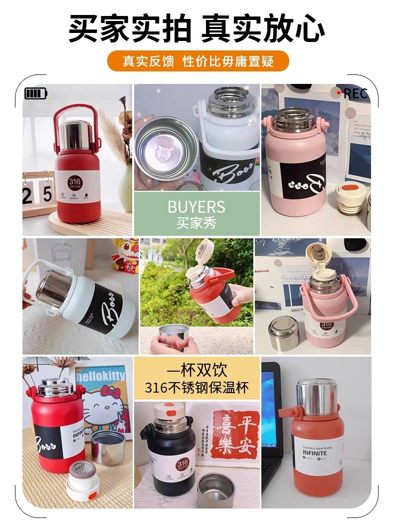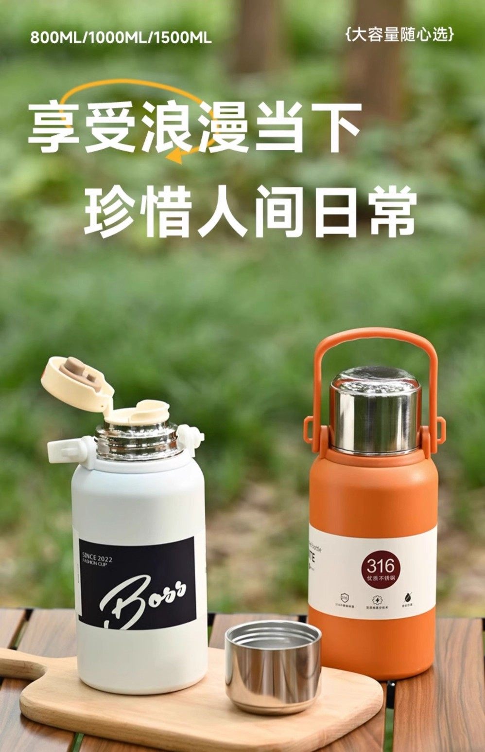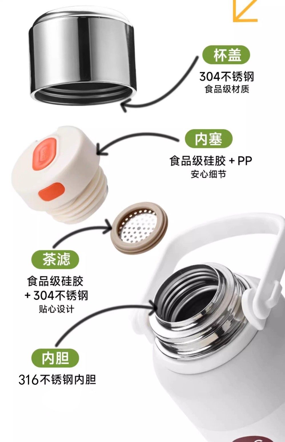 | Color Classification | Obsidian Black Stone 800ml [with Tea Separator],[Anti-Fall] Chinese Red 800ml [with Tea Separator],[Antibacterial] Chinese Red 800ml [with Tea Separator + Strap],[Antibacterial] Army Green 800ml [with Tea Separator + Strap],[Antibacterial] Coral Pink 800ml [with Tea Separator + Strap],[Antibacterial] Sun Orange 800ml [with Tea Separator + Strap],[Antibacterial] Crescent White 800ml [with Tea Separator + Strap],[Antibacterial] Obsidian Black Stone 800ml [Includes Tea Separator + Strap],-Crescent White 800ml [Including Tea Separator + Strap + Cup Cover],Crescent White 1000ml [with Tea Separator + Strap],China Red 1000ml [Includes Tea Infuser + Carrying Strap],Coral Pink 1000ml [Includes Tea Infuser + Carrying Strap],Army Green 1000ml [Includes Tea Infuser + Carrying Strap],Obsidian Black Stone 1000ml [Includes Tea Infuser + Carrying Strap],Sun Orange 1000ml [with Tea Separator + Strap],Obsidian Black Stone 1500ml [Includes Tea Infuser + Carrying Strap],-Military Green 1500ml [Including Tea Separator + Strap],China Red 1500ml [Includes Tea Infuser + Carrying Strap],Coral Pink 1500ml [Includes Tea Infuser + Carrying Strap],Sun Orange 1500ml [with Tea Separator + Strap],Crescent White 1500ml [with Tea Separator + Strap],316-Crescent White 1000ml [Includes Tea Separator + Strap + Cup Cover],316-Sun Orange 1000ml [Includes Tea Separator + Strap + Cup Cover],316-Yao Black Stone 1500ml [Including Tea Separator + Strap + Cup Cover],316-Military Green 1500ml [Including Tea Separator + Strap + Cup Cover],316-China Red 1500ml [Including Tea Separator + Strap + Cup Cover],316-Coral Pink 1500ml [Includes Tea Separator + Strap + Cup Cover],316-Sun Orange 1500ml [Includes Tea Separator + Strap + Cup Cover],316-Crescent White 1500ml [Includes Tea Separator + Strap + Cup Cover],316-Insulated Tea Maker 450Ml-Black,316-Insulated Tea Maker 450Ml-White |