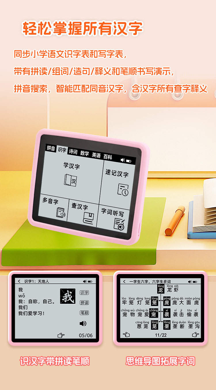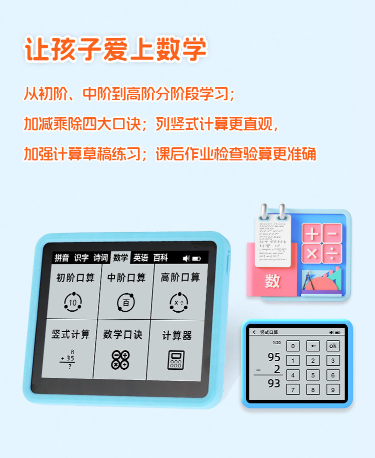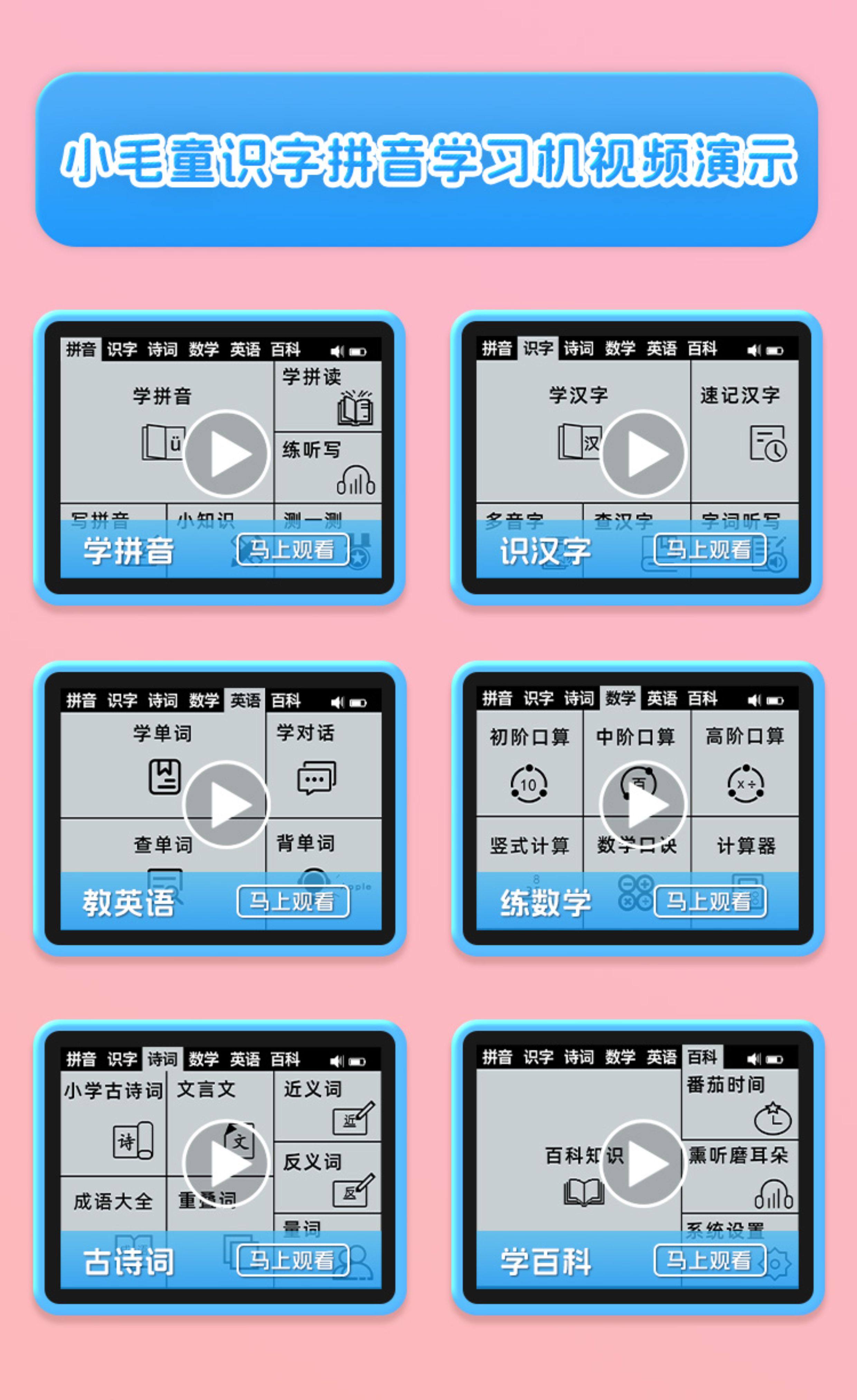 | Color Classification | Standard Blue / Includes Pinyin, Spelling, Literacy, Ancient Poems, Idioms, Vocabulary, Encyclopedia, Dictation, and Writing,Standard Pink / Includes Pinyin, Spelling, Literacy, Ancient Poems, Idioms, Vocabulary, Encyclopedia, Dictation, and Writing,[Upgrade Chinese, Mathematics and English]Blue/Includes Standard Version Features + English/Mathematics,[Upgrade Chinese, Mathematics and English]Pink/Includes Standard Version Features + English/Mathematics,[Newly Upgraded Chinese, Math, and English]Blue 32G/Including All Functions of the Upgraded Version + E-Book,[Newly Upgraded Chinese, Math, and English]Pink 32G/Including All Functions of the Upgraded Version + E-Book |