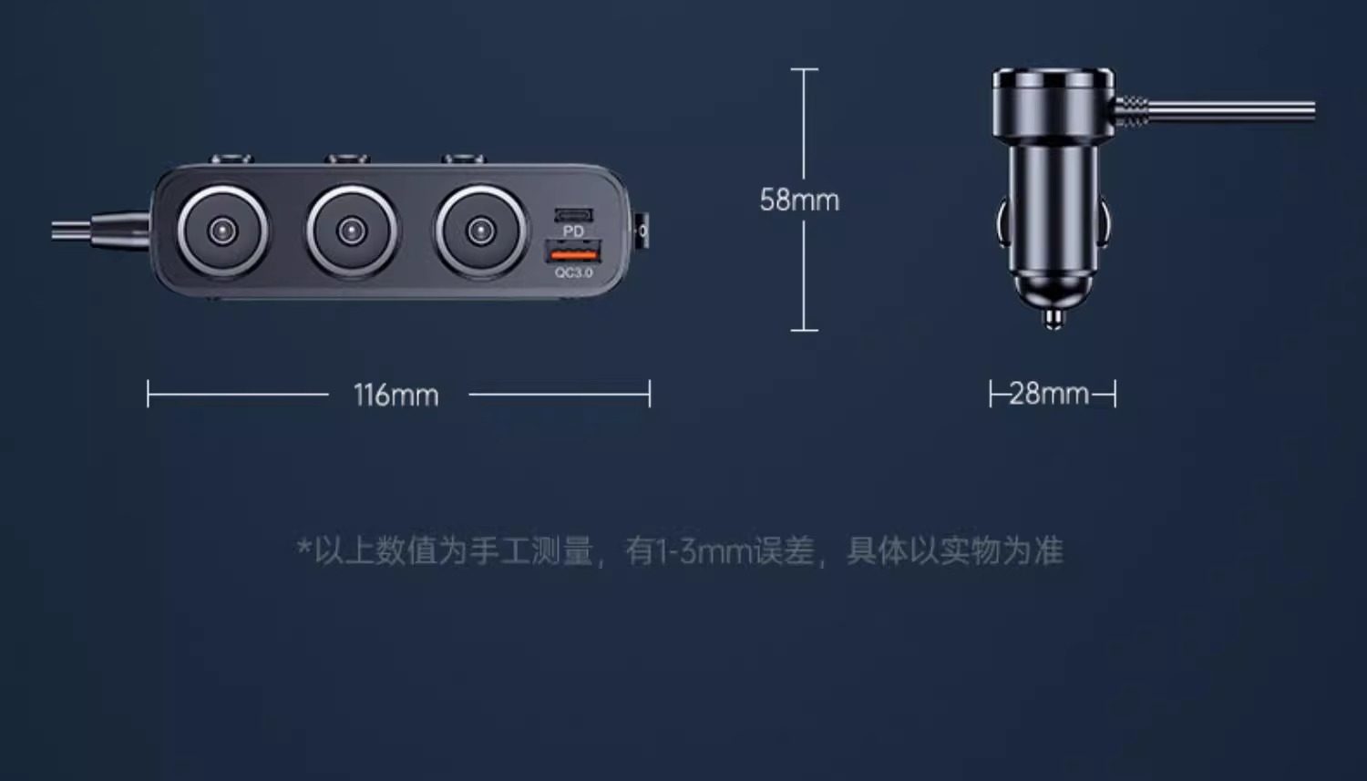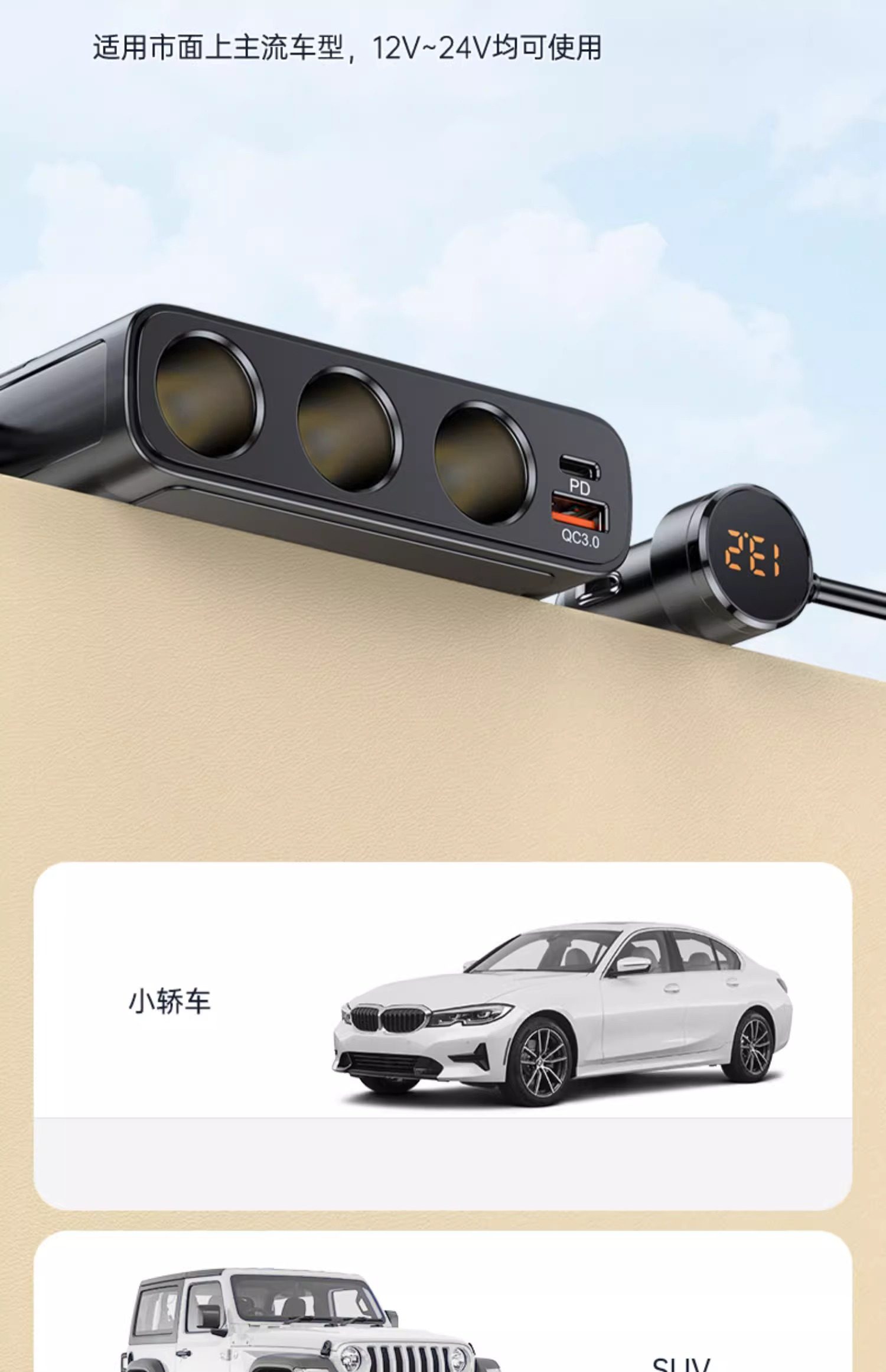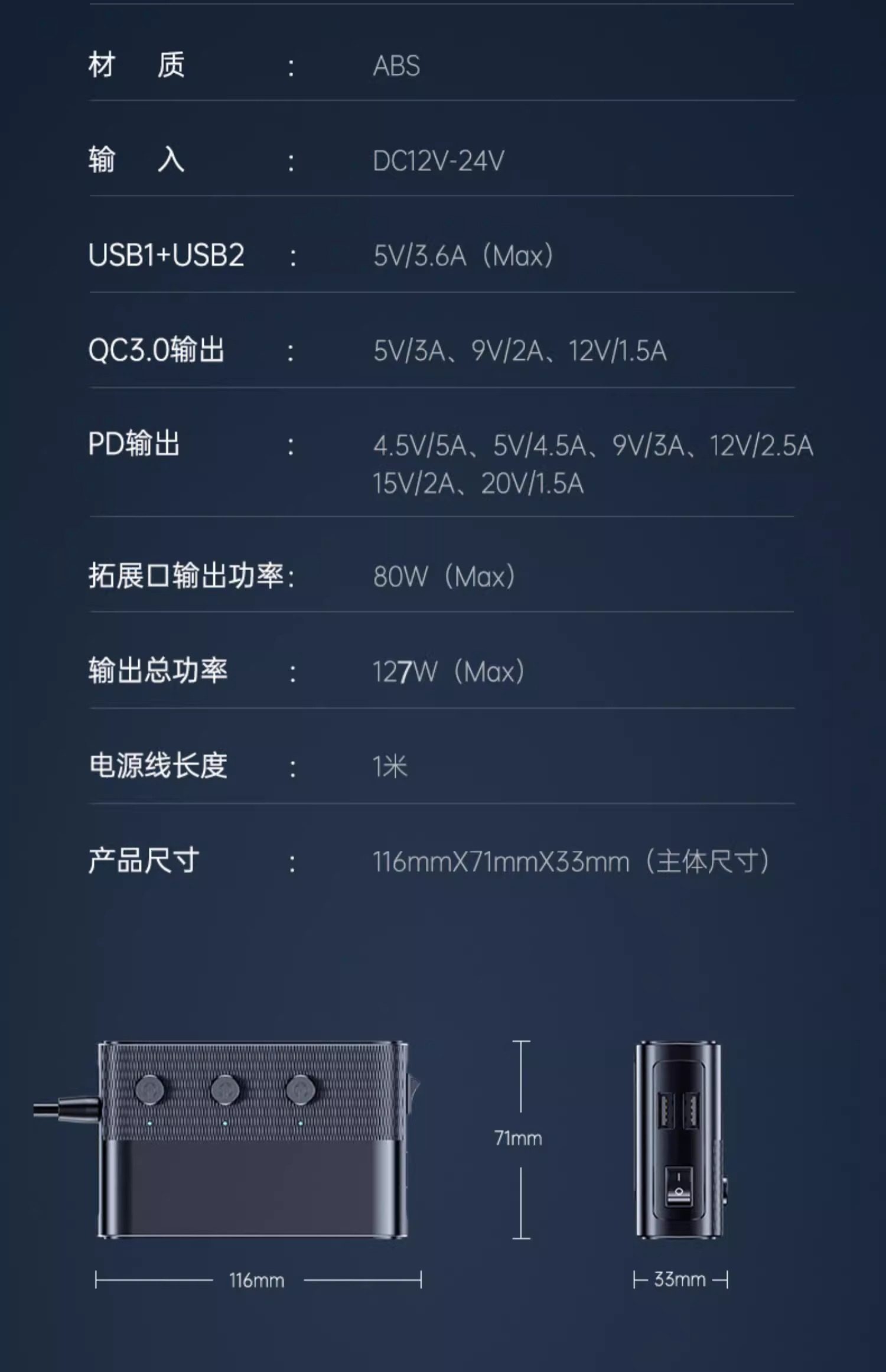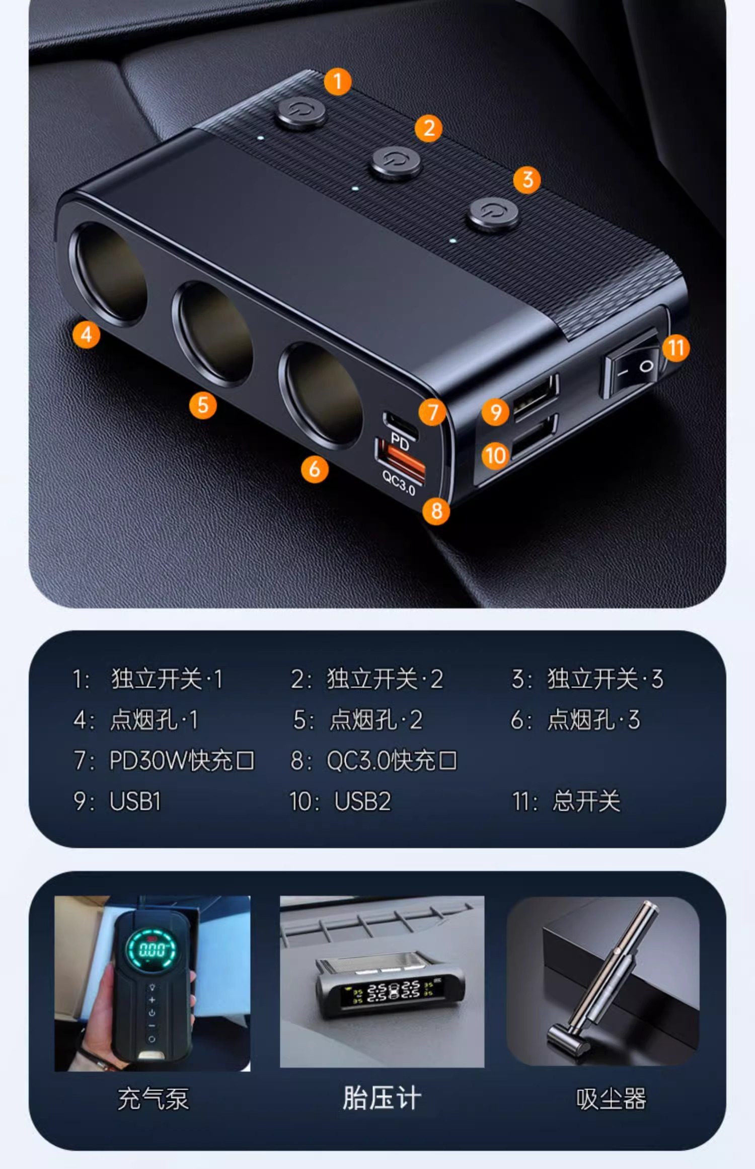 | Color Classification | Piano Black[Independent Switch +127W+Pd Fast Charging],Piano Black + 6A Fast Charging Cable,Piano Black + Pd Braided Fast Charging Cable,Piano Black + Colorful Fast Charging Three-In-One Light,Platinum Version[Upgrade 171W + Independent Switch + Pd Fast Charging],Platinum Edition + Pd Fast Charging Cable + Geek Cable,Standard Model[No Switch * One to Four * Supports Cigarette Lighting],Standard Model +12V Cigarette Lighter,Standard Model + 12V Cigarette Lighter + Geek Three-In-One Line,High-Power Vehicle-Mounted Refrigerator + Heated Seat Cushion,226W (Max) - Supreme Model (Qc Fast Charge + Digital Display + Independent Switch),228W (Max) - Top-Of-The-Line Model (Retractable Cable + Qc Fast Charge + Independent Switch + Pd Fast Charge),261W[Platinum Version Cup Charger] |
