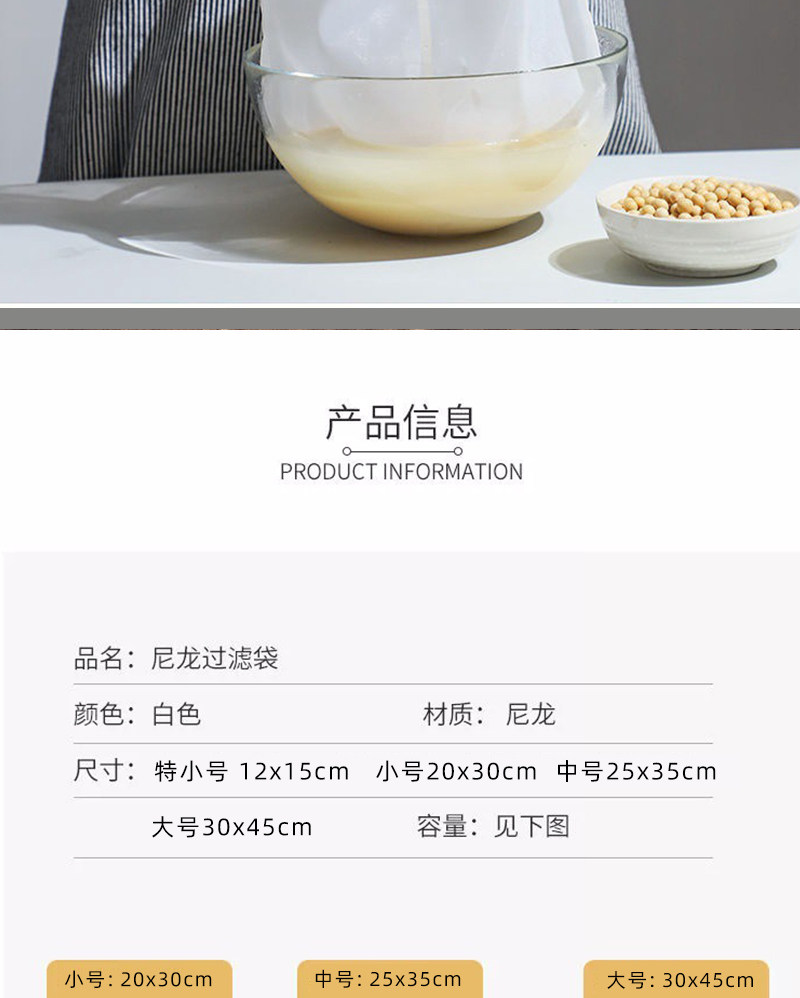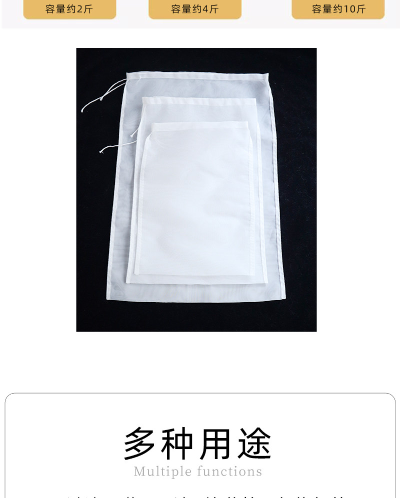| Color Classification | Large + Medium + Small[Three Packs in Total]Nylon Filter Bag,2 Pack Small Size 20X30Cm[Filter Soy Milk, Juice, Squeeze Vegetable Stuffing, Etc. for Home],2 Pack Medium Size 25X35Cm[Filter Soy Milk, Wine, Vegetable Stuffing, Etc],2 Pack Large Size 30X45Cm[Filter Hot Soy Milk, Juice, Wine, Etc],1 Pack Small Size 20X30Cm[Filter Soy Milk, Squeeze Vegetable Stuffing, Juice, Rice Wine, Etc],1 Pack Large Size 30X45Cm[Squeeze Vegetable Stuffing, Filter Juice, Soy Milk, Wine, Rice Wine, Etc],1 Pack Medium Size 25X35Cm[Squeeze Vegetable Stuffing, Filter Juice, Soy Milk, Wine, Rice Wine, Etc],3 Pack Small Size 20X30Cm[Filter Soy Milk, Juice, Squeeze Vegetable Stuffing, Etc. for Home],3 Pack Medium Size 25X35Cm[Squeeze Vegetable Stuffing, Filter Juice, Soy Milk, Wine, Rice Wine, Etc],3 Pack Large Size 30X45Cm[Squeeze Vegetable Stuffing, Filter Juice, Soy Milk, Wine, Rice Wine, Etc],4 Pack Small Size 20X30Cm[Filter Soy Milk, Juice, Vegetable Stuffing, Wine, Etc],4 Pack Medium Size 25X35Cm[Filter Soy Milk, Juice, Vegetable Stuffing, Wine, Etc],4 Pack Large Size 30X45Cm[Filter Soy Milk, Juice, Vegetable Stuffing, Wine, Etc],Nylon Filter Bags 2 Medium + 2 Large[4 Pieces in Total],Nylon Filter Bags 2 Small + 2 Medium[4 Pieces in Total],Nylon Filter Bags 2 Small + 2 Large[4 Pieces in Total],1 Pack Extra Small Size 12X15Cm[The Size Is Small,Not Recommended for General Use,Make Tea Bags and Medicine Bags],10 Extra Small 12X15Cm Tea Bags, Medicine Bags, Marinade Bags] |