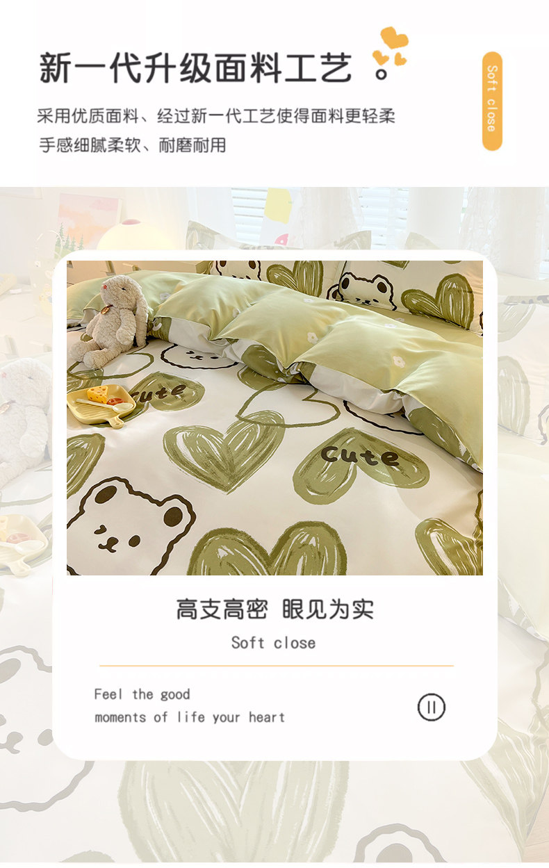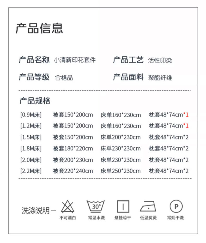 | Applicable Bed Size | Single Piece of Quilt Cover [150X200Cm Recommended to Take 2 Sets for Replacement],Single Piece of Quilt Cover [180X220Cm Recommended to Take 2 Sets for Replacement],Single Piece of Quilt Cover [200X230Cm Recommended to Take 2 Sets for Replacement],1.2m Bed Three-Piece Set [Quilt Cover 150*200, Free 1 Sheet + Single Pillowcase],1.5m Bed Four-Piece Set [Quilt Cover 150X200, Free 1 Sheet + Pair of Pillowcases],1.8m Bed Four-Piece Set [Quilt Cover 180X220, Free 1 Sheet + Pair of Pillowcases],2.0m Bed Four-Piece Set [Quilt Cover 200X230, Free 1 Sheet + Pair of Pillowcases],1.2m Bed Four-Piece Set [Quilt Cover 150*200, Free 1 Pillow Core + 1 Sheet + Single Pillowcase],1.5m Bed Six-Piece Set [Quilt Cover 150X200, Free 2 Pillow Cores + 1 Sheet + a Pair of Pillowcases],1.8m Bed Six-Piece Set [Quilt Cover 180X220, Free 2 Pillow Cores + 1 Sheet + a Pair of Pillowcases],2.0m Bed Six-Piece Set [Quilt Cover 200X230, Free 2 Pillow Cores + 1 Sheet + a Pair of Pillowcases] |