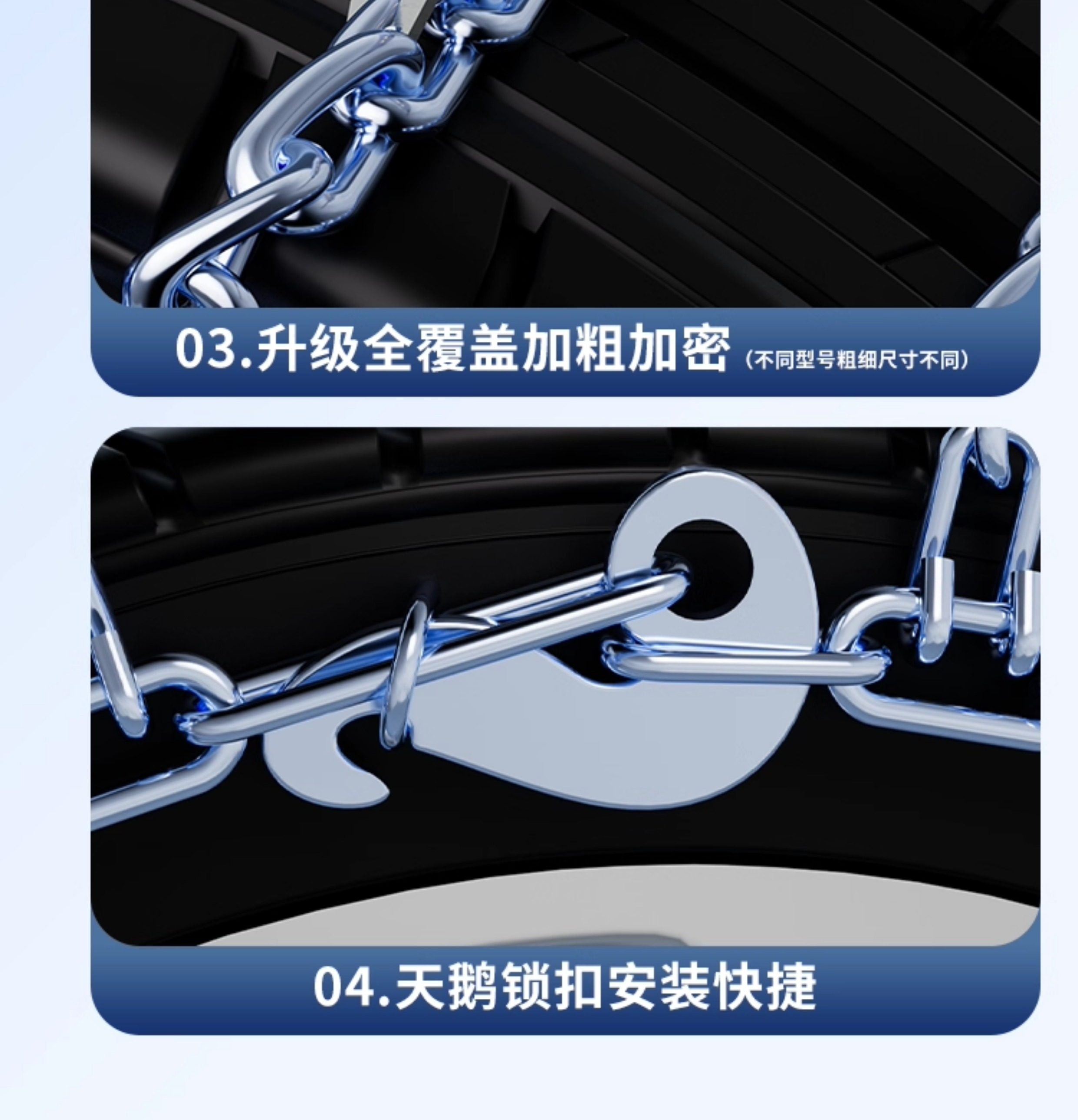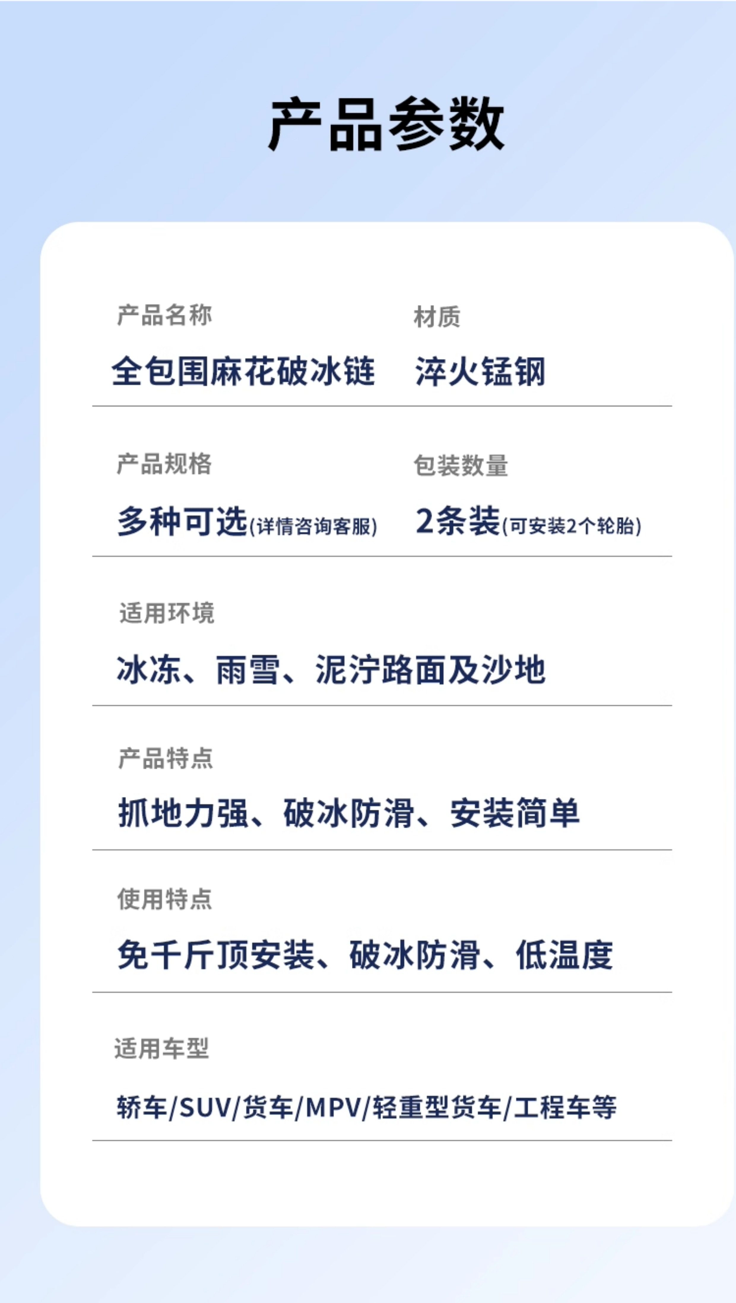 | Color Classification | Audi A3[205/55R16 Ice Breaking Steel Chain★2 Rounds],Audi A3[225/40R18 Ice Breaking Steel Chain★2 Rounds],Audi A3[225/45R17 Ice Breaking Steel Chain★2 Rounds],Audi A4L[205/60R16 Ice Breaking Steel Chain★2 Rounds],Audi A4L[225/50R17 Ice Breaking Steel Chain★2 Rounds],Audi A4L[245/35R19]Icebreaker Steel Chain★2 Rounds,Audi A4L[245/40R18 Ice Breaking Steel Chain ★ 2 Rounds],Audi A4L[225/55R17 Ice Breaking Steel Chain★2 Rounds],Audi A5[225/50R17 Ice Breaking Steel Chain★2 Rounds],Audi A5[245/40R18 Ice Breaking Steel Chain★2 Rounds],Audi A6L[205/60R16 Ice Breaking Steel Chain★2 Rounds],Audi A6L[225/50R17 Ice Breaking Steel Chain★2 Rounds],Audi A6L[225/55R16 Ice Breaking Steel Chain★2 Rounds],Audi A6L[225/55R17 Ice Breaking Steel Chain★2 Rounds],Audi A6L[225/55R18 Ice Breaking Steel Chain★2 Rounds],Audi A6L[245/45R18 Ice Breaking Steel Chain ★ 2 Rounds],Audi A6L[245/45R19 Ice Breaking Steel Chain★2 Rounds],Audi A6L[255/40R20 Ice Breaking Steel Chain★2 Rounds],Audi A6L[255/45R20 Ice Breaking Steel Chain★2 Rounds],Audi A6L[255/40R19 Ice Breaking Steel Chain★2 Rounds],Audi A8L[235/55R18 Ice Breaking Steel Chain★2 Rounds],Audi A8L[265/40R20 Ice Breaking Steel Chain★2 Rounds],Audi Q2L[215/50R18 Ice Breaking Steel Chain★2 Rounds],Audi Q2L[215/55R17 Ice Breaking Steel Chain★2 Rounds],Audi Q3[235/50R18 Ice Breaking Steel Chain★2 Rounds],Audi Q3[235/50R19 Ice Breaking Steel Chain★2 Rounds],Audi Q3[235/55R17 Ice Breaking Steel Chain★2 Rounds],Audi Q3[235/55R18 Ice Breaking Steel Chain★2 Rounds],Audi Q5/Q5L[235/55R19 Ice Breaking Steel Chain★2 Rounds],Audi Q5L[235/60R18 Ice Breaking Steel Chain★2 Rounds],Audi Q5L[255/45R20 Ice Breaking Steel Chain★2 Rounds],Audi Q5[235/65R17 Ice Breaking Steel Chain★2 Rounds],Audi Q7[255/55R18 Ice Breaking Steel Chain★2 Rounds],Audi Q7[255/55R19 Ice Breaking Steel Chain★2 Rounds],Audi Q7[265/50R19 Ice Breaking Steel Chain★2 Rounds],Three Wheel Motorcycle[135/80R12] |