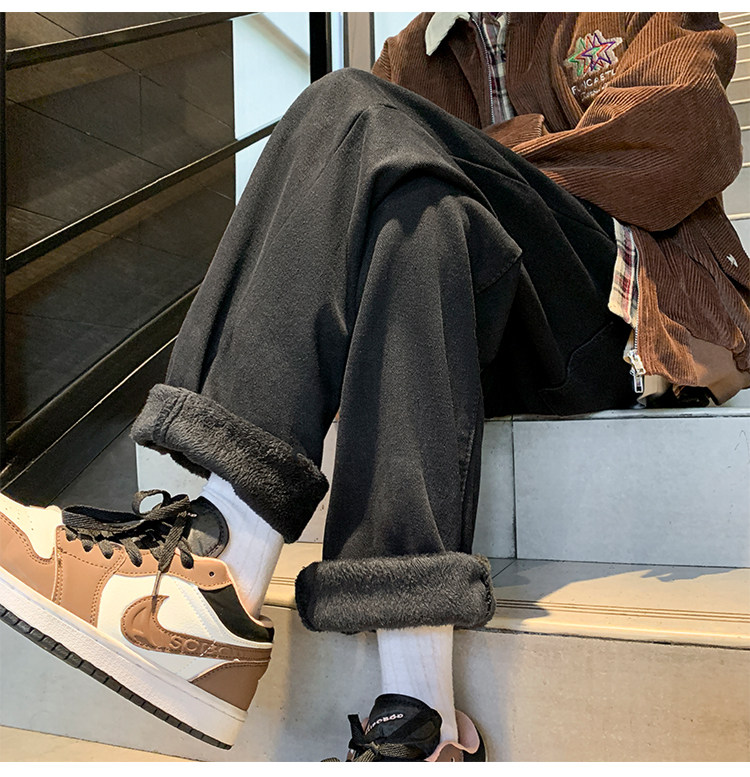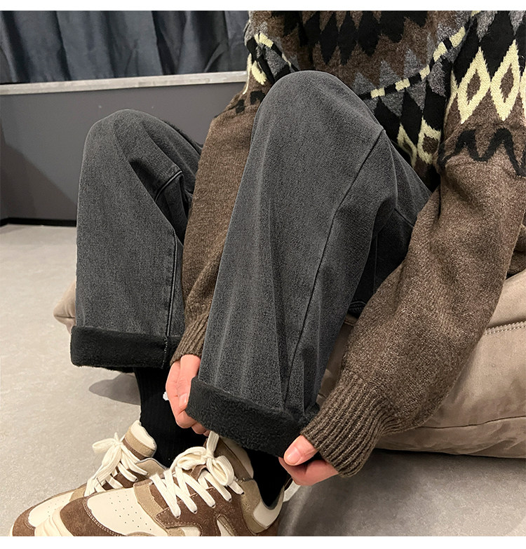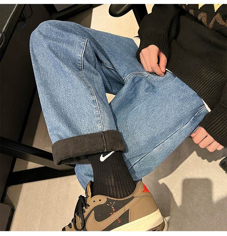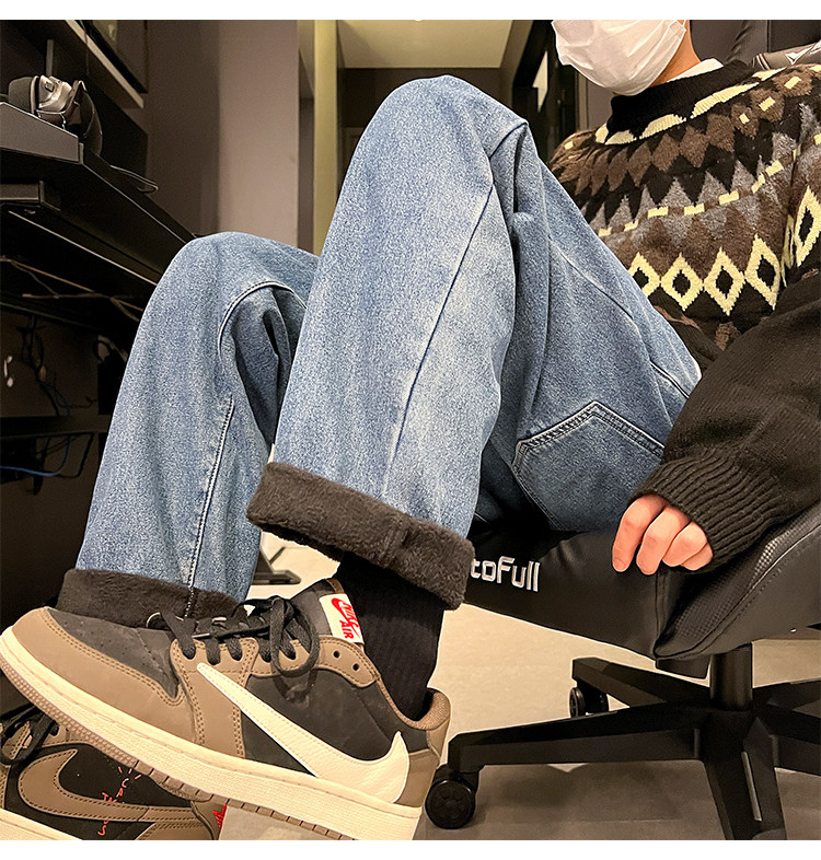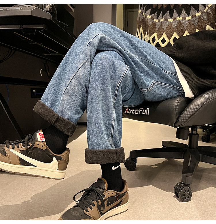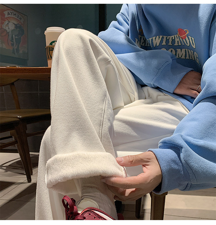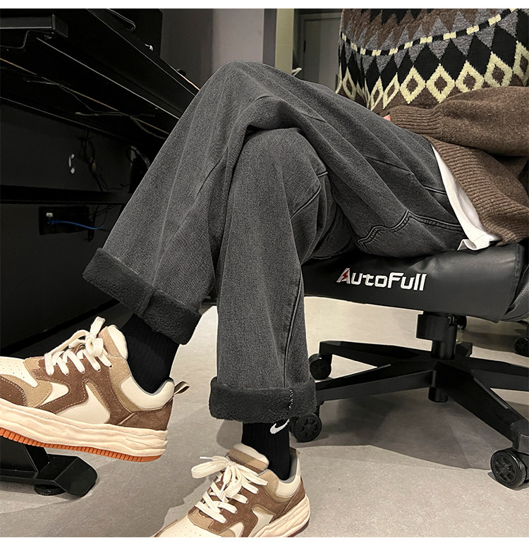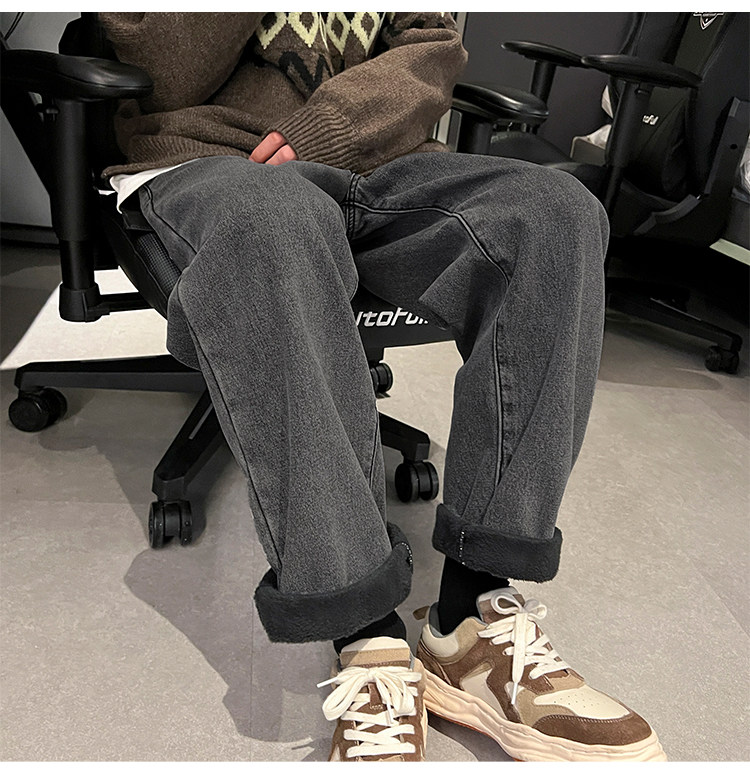 White Fleece-Lined Jeans for Men, Winter Loose Straight-Leg Pants, Casual Versatile Youth Trendy Wide-Leg Trousers