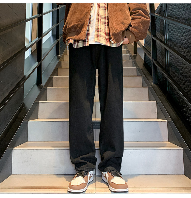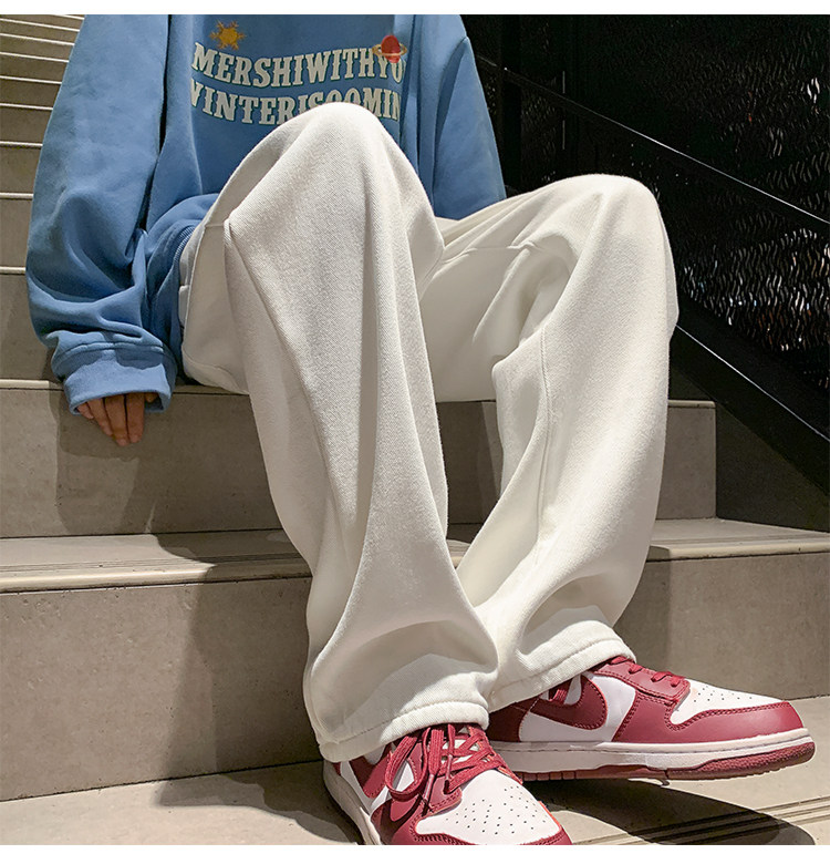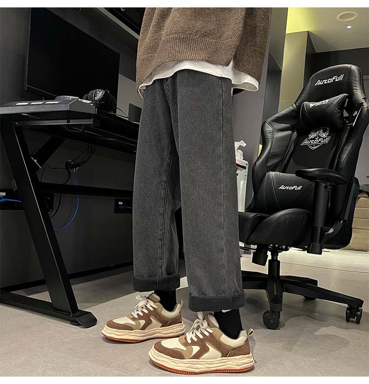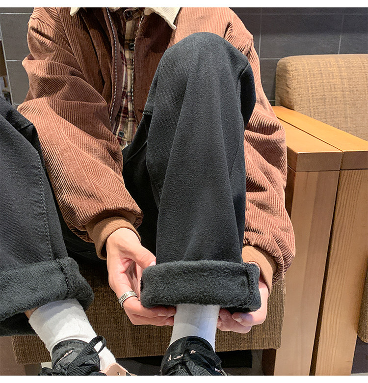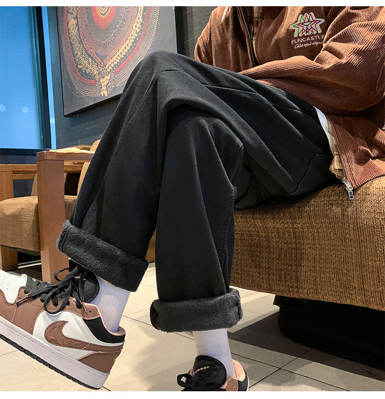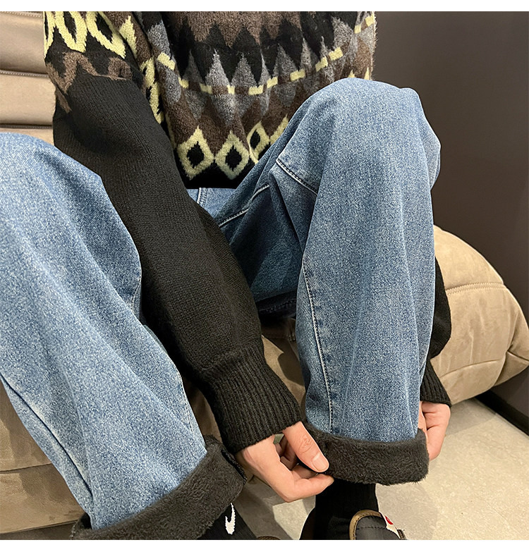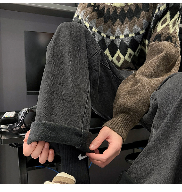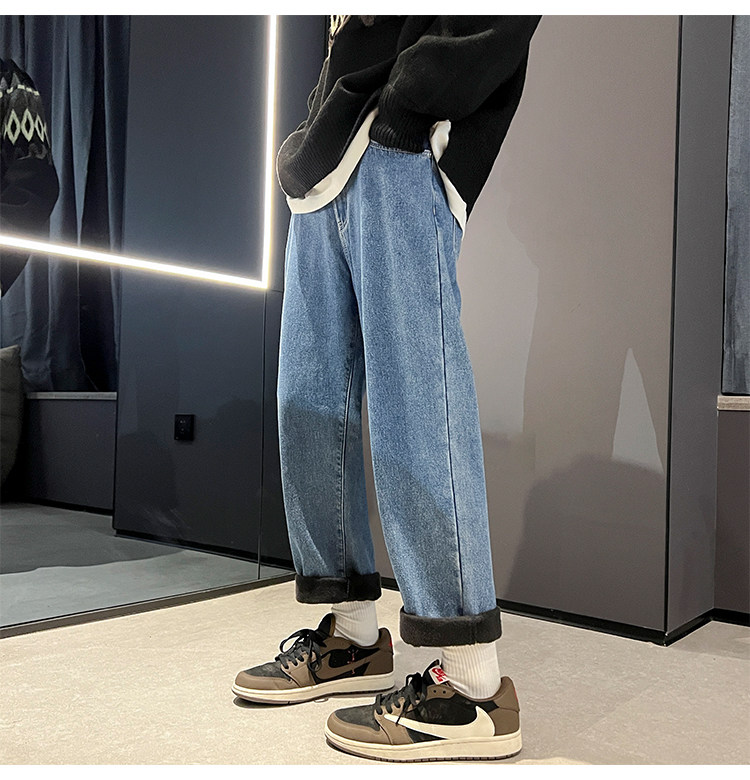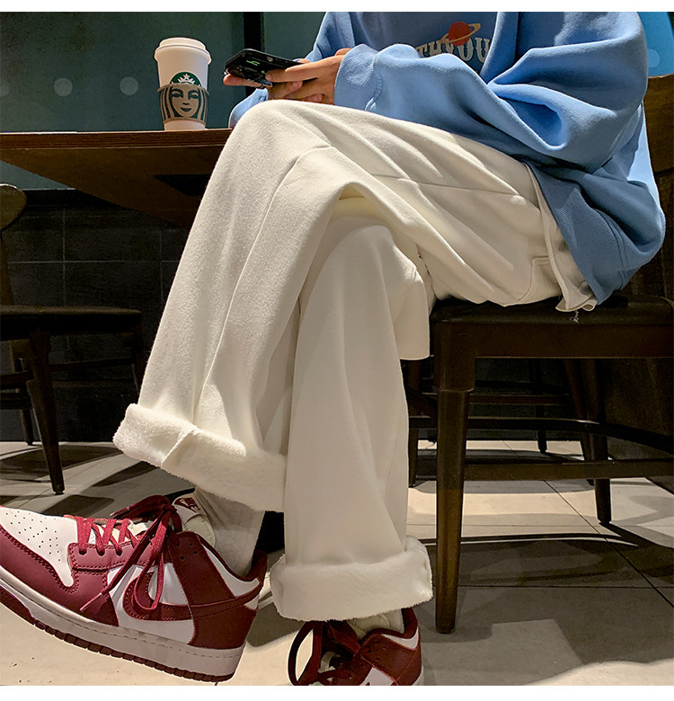 White Fleece-Lined Jeans for Men, Winter Loose Straight-Leg Pants, Casual Versatile Youth Trendy Wide-Leg Trousers