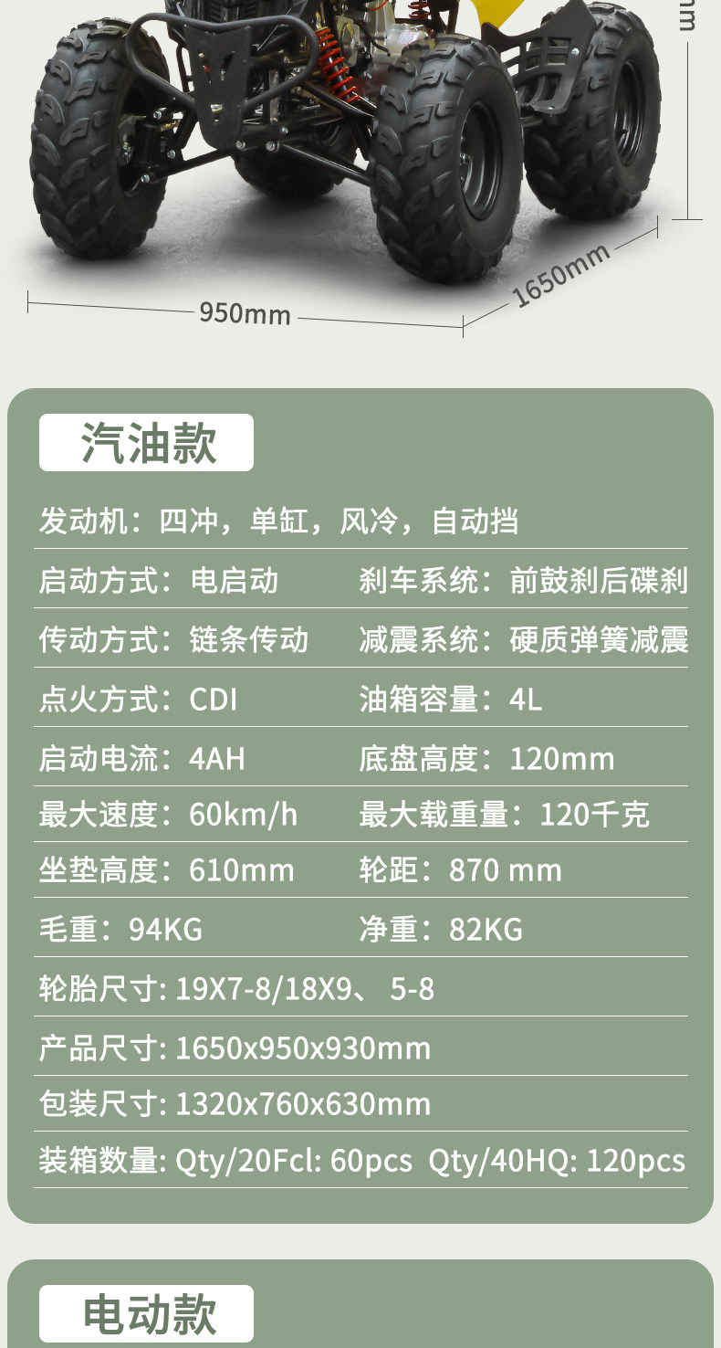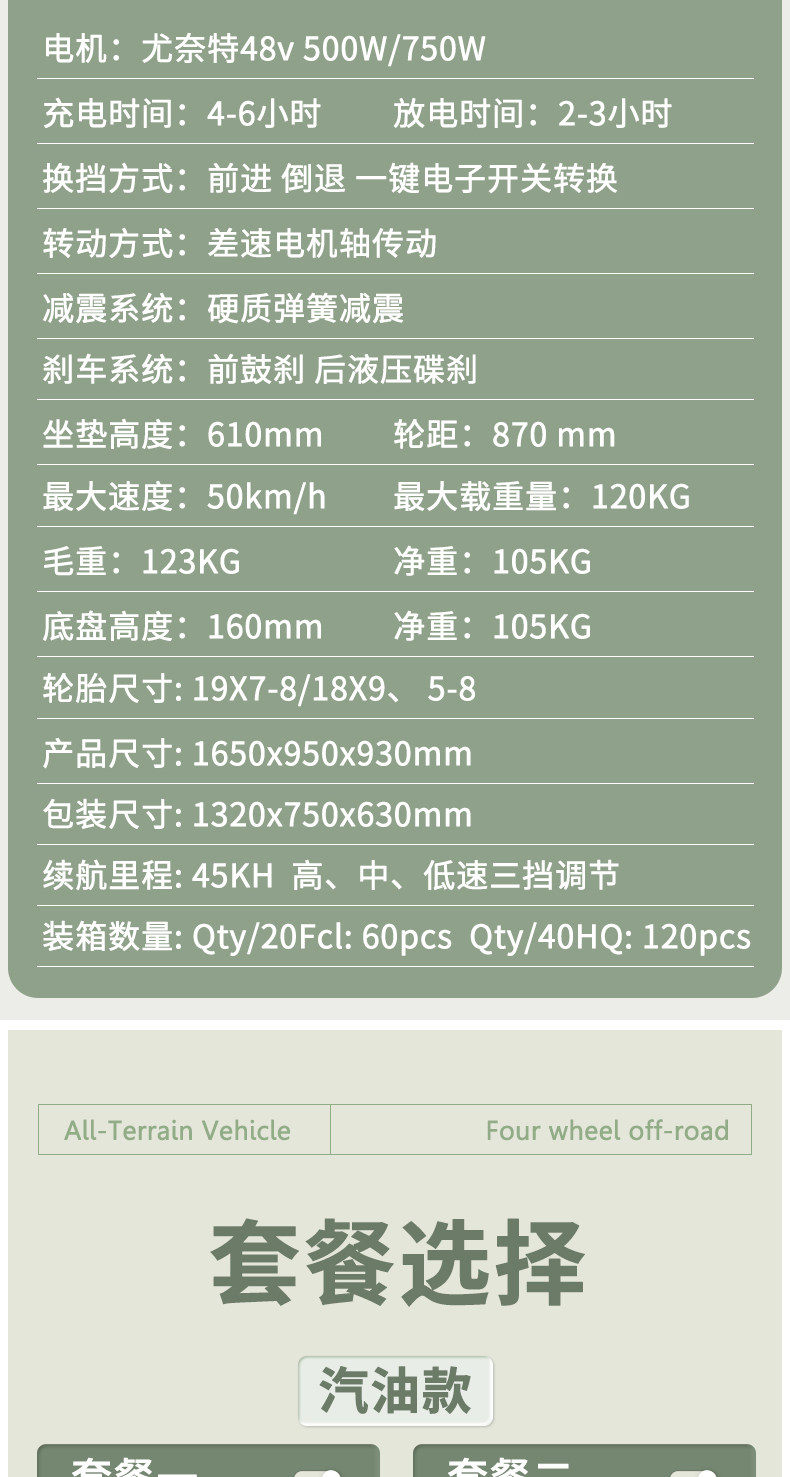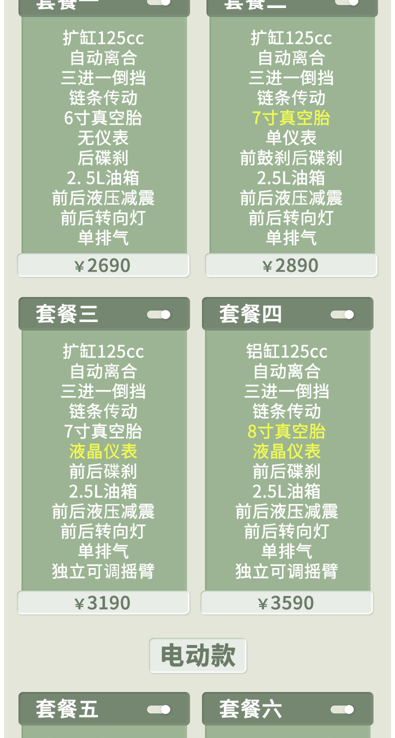 | Color Classification | Gasoline Model: Package 1/Cylinder Expansion 125Cc/Automatic Clutch,Gasoline Model: Package 2/Cylinder Expansion 125Cc/ 7inch Tubeless Tires,Gasoline Model: Package Three/Cylinder Expansion 125Cc/Lcd Instrument,Gasoline Model: Package 4/Cylinder Expansion 125Cc/ 8inch Tubeless Tires,Electric Model: Package Five/48V500W/ 6inch Tubeless Tires,Electric Model: Package Six/48V750W/ 7inch Tubeless Tires,Electric Model: Package 7/48V750W/ 8inch Tubeless Tires,Electric Model: Package 8/60V750W/Enlarged Battery |