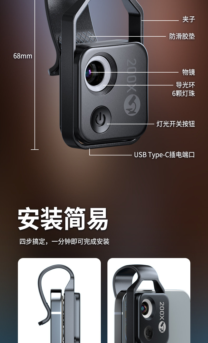 Pickogen Mobile Phone Microscope Lens 200X High-Definition Magnifying Glass for Professional Photography of Diamonds, Waist Codes, Porcelain, Antiques, Jewelry, and Luxury Goods, Specialized Super Macro Suitable for Apple and Huawei