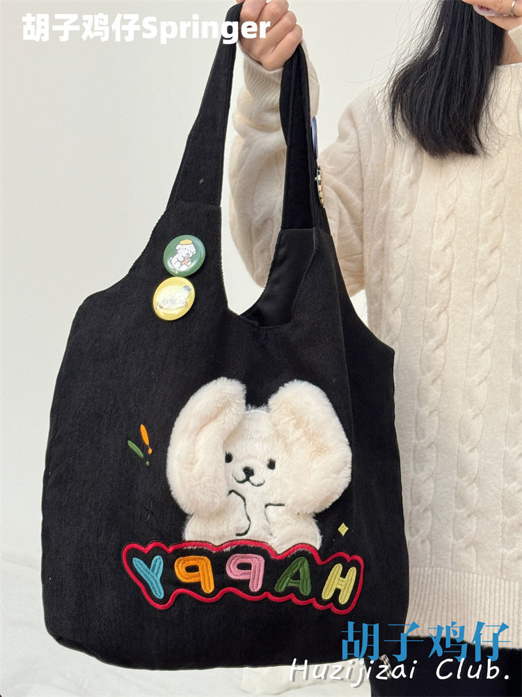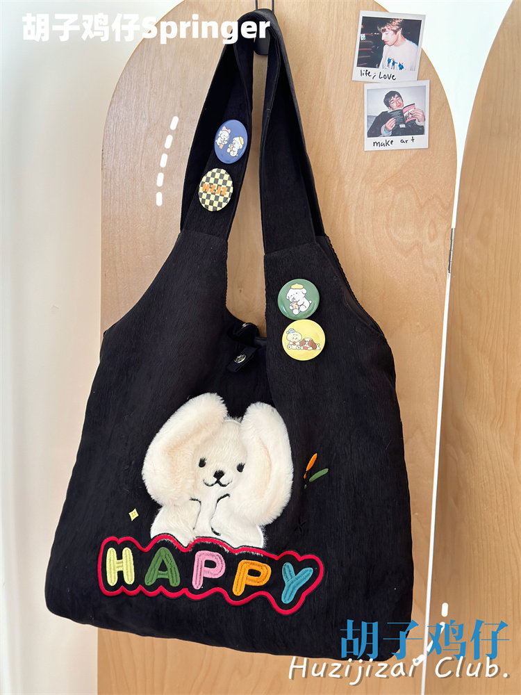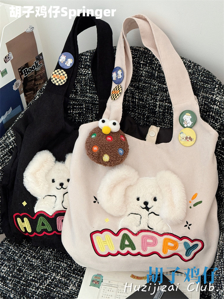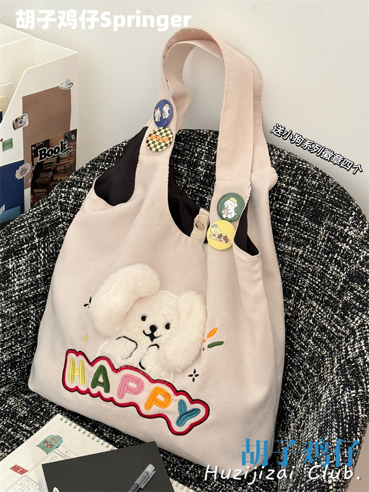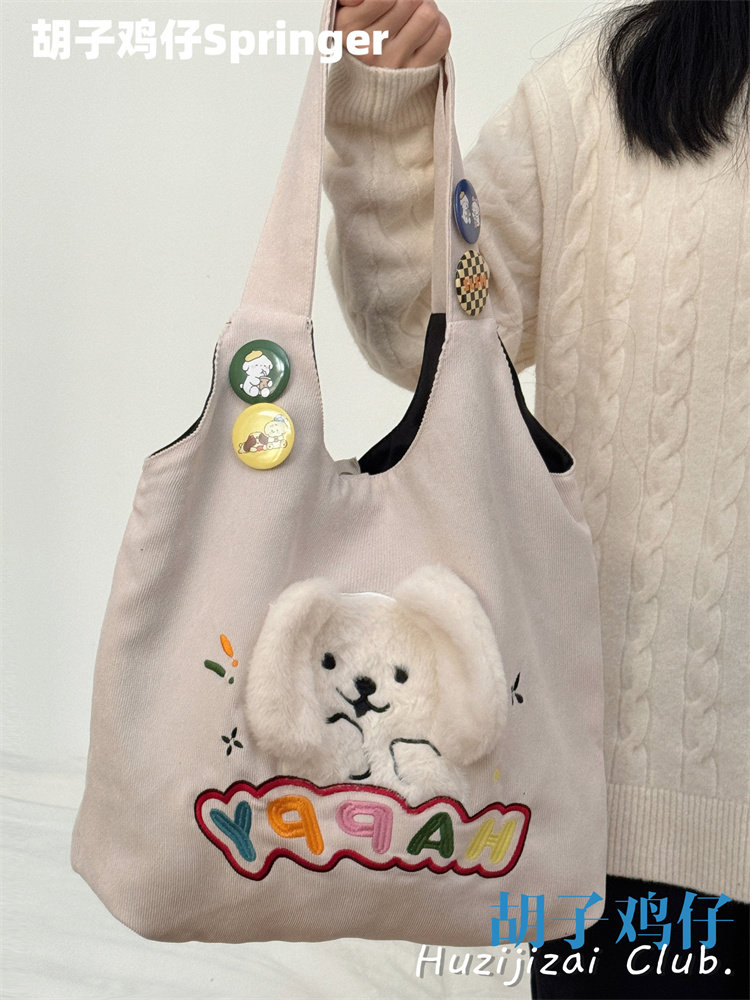 Japanese-Style Cartoon Cute Puppy Shoulder Bag for Girls, Soft Girl Student Large-Capacity Handbag Corduroy Bag