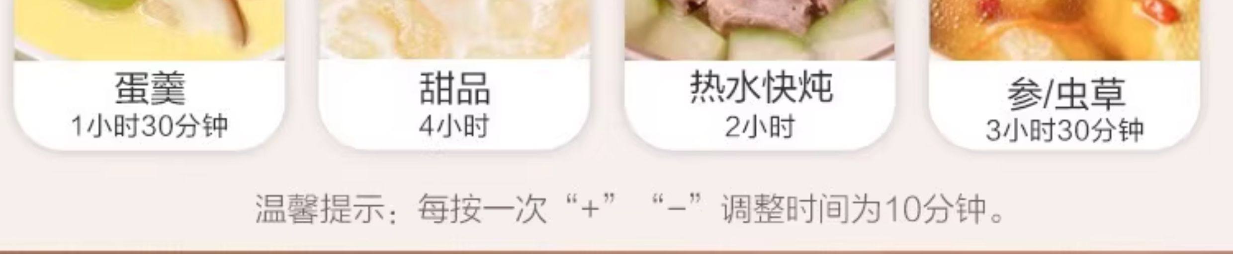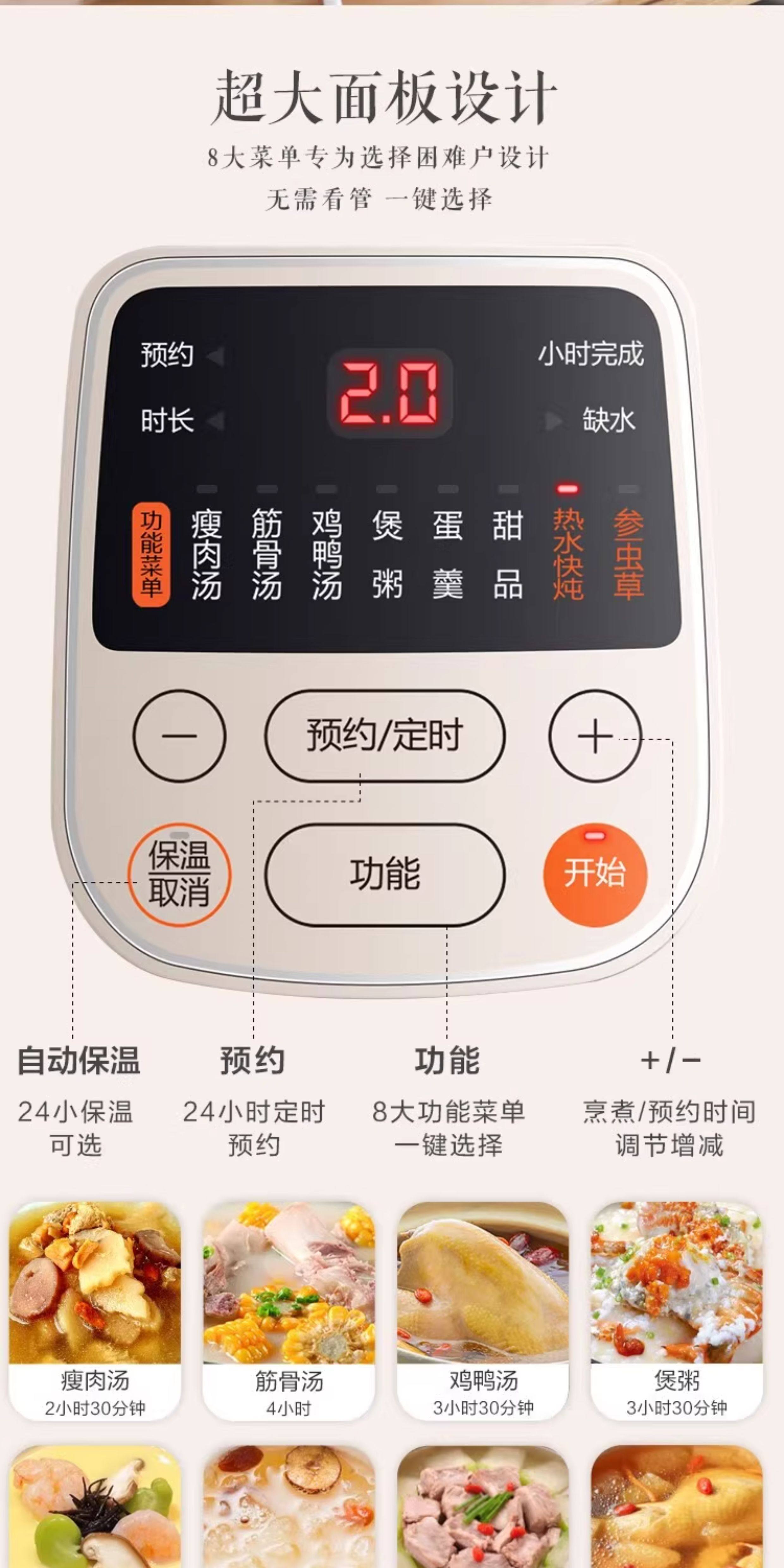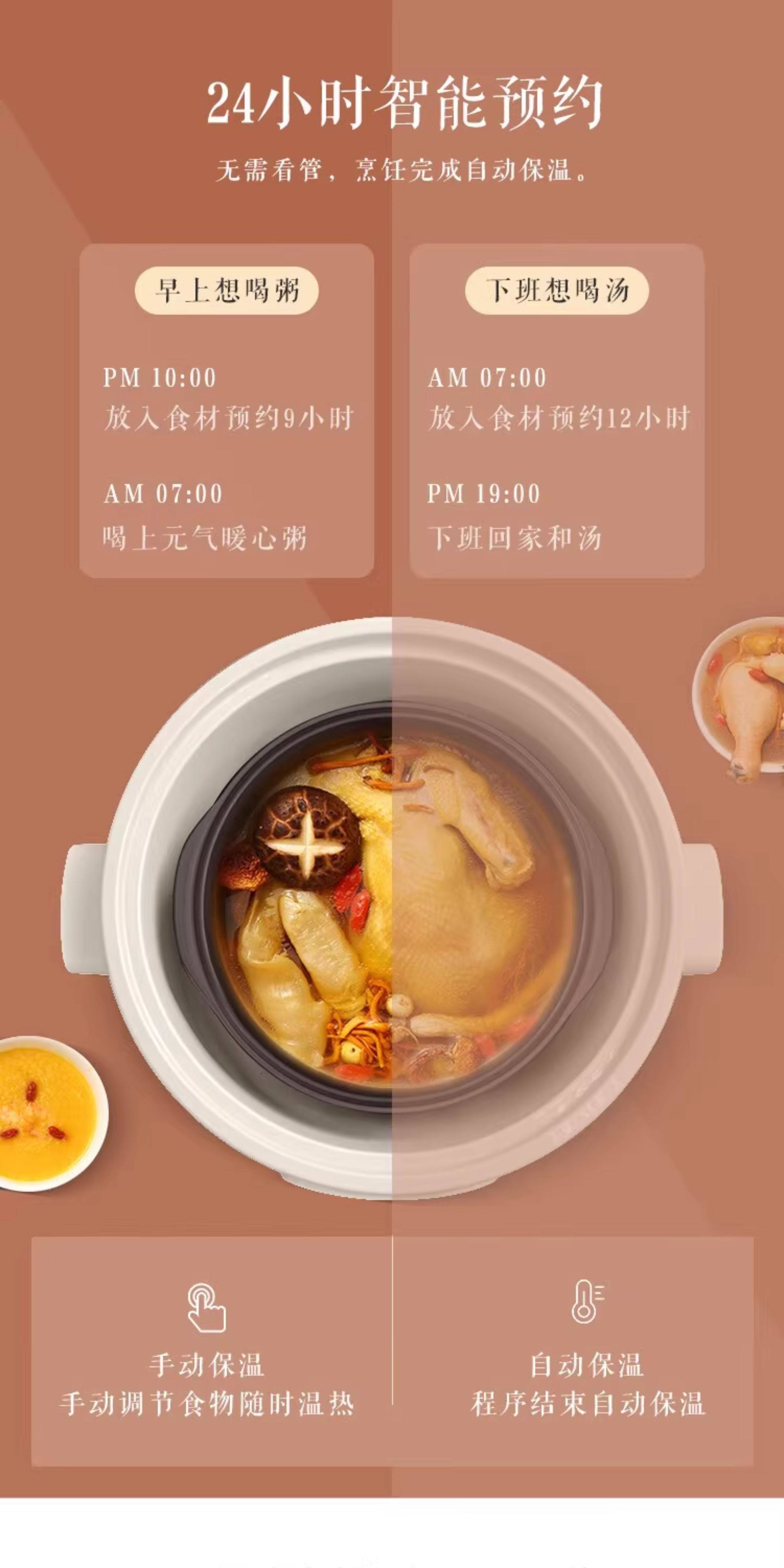 | Menu Function | Stewed/Braised Pork,Cook Multigrain Porridge,Stewed Fish Maw,Cooking Complementary Foods,Cook White Porridge,Make Nutritious Soup,Bird's Nest,Stewed Desserts |