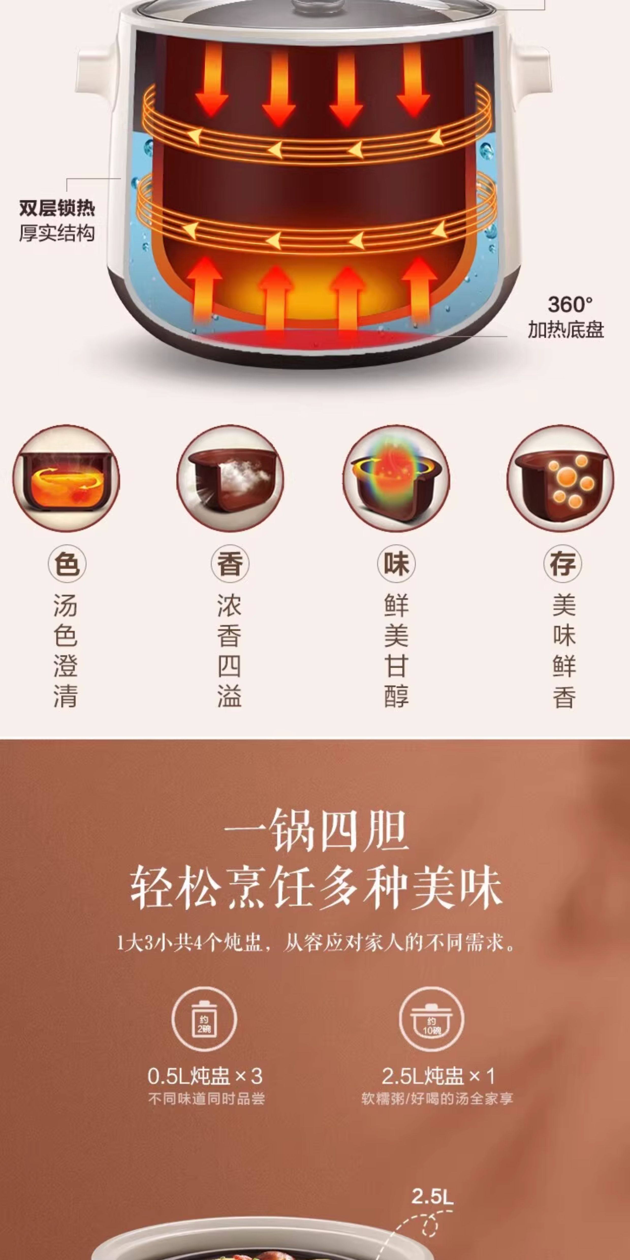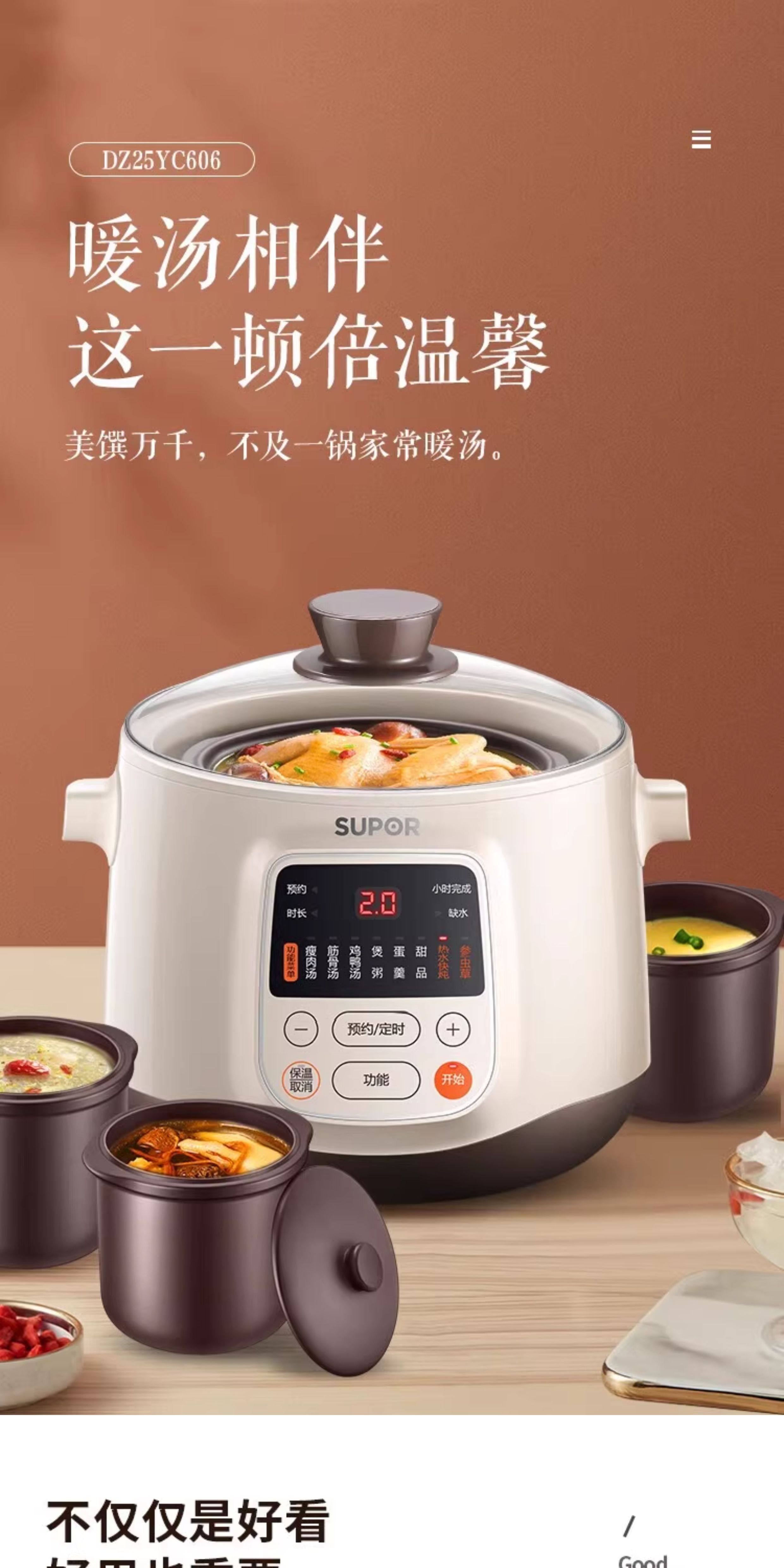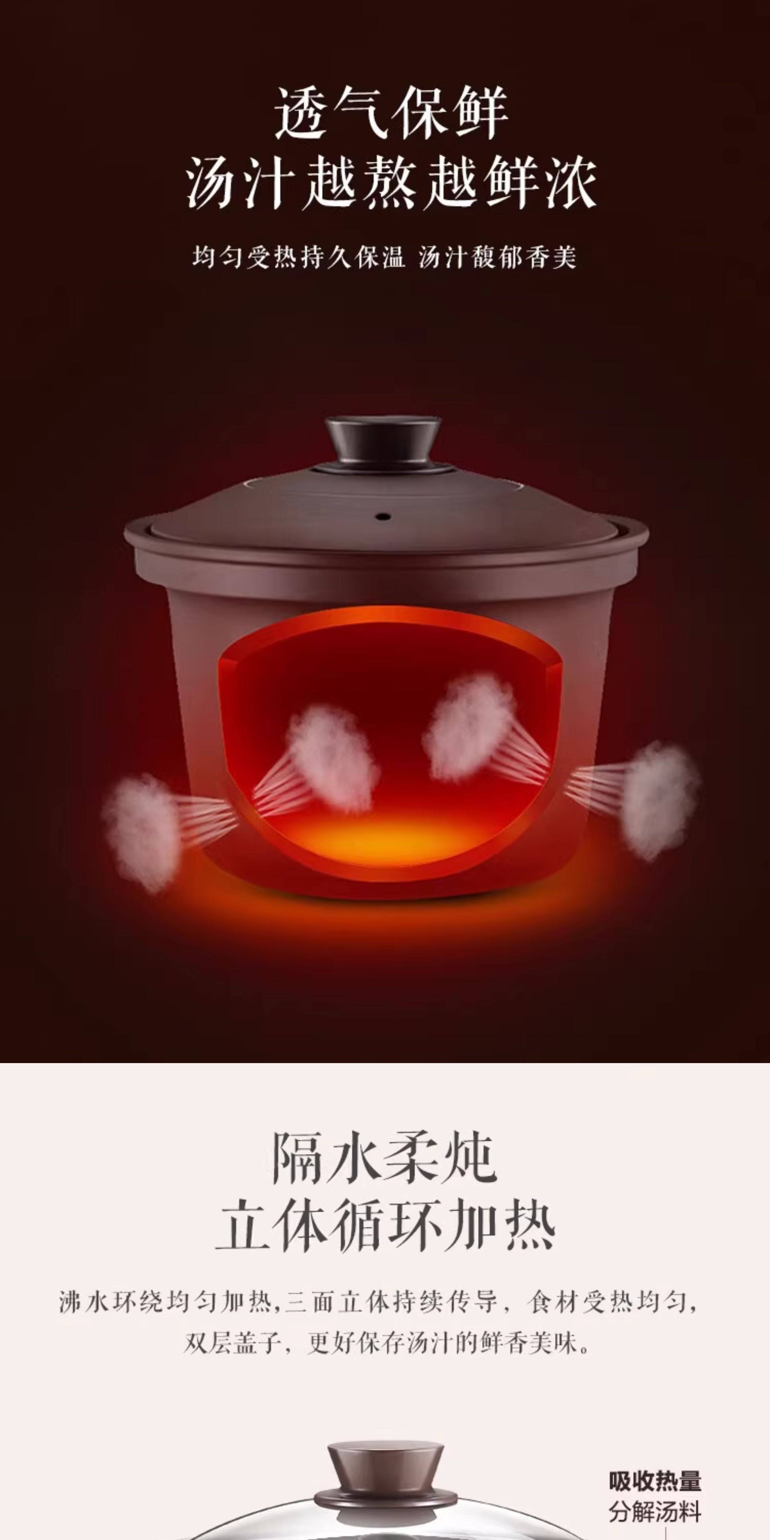 | Menu Function | Stewed/Braised Pork,Cook Multigrain Porridge,Stewed Fish Maw,Cooking Complementary Foods,Cook White Porridge,Make Nutritious Soup,Bird's Nest,Stewed Desserts |