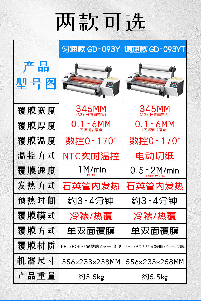 | Color Classification | Comparison of Parameters of Constant Speed Model/Speed Regulating Model,[A3+ Constant Speed Model] Laminating Machine (Bonus: 31Cm×50M Glossy Pre-Coated Film*2 Rolls),[A3+ Constant Speed Model] Laminating Machine + A4 Heavy-Duty Paper Cutter (Bonus: 31Cm×50M Glossy Pre-Coated Film*2 Rolls),[A3+ Constant Speed Model] Laminating Machine + Small Paper Cutter (Bonus: 31Cm×50M Glossy Pre-Coated Film*2 Rolls),[A3+ Constant Speed Model] Laminating Machine + A4 Creasing Machine (Bonus: 31Cm×50M Glossy Pre-Coated Film*2 Rolls),[A3+ Constant Speed Model] Laminating Machine (Bonus: 22Cm×100M Glossy Pre-Coated Film*2 Rolls),[A3+ Constant Speed Model] Laminating Machine (Bonus: 22Cm×100M Matte Pre-Coated Film*2 Rolls),[A3+ Constant Speed Model] Laminating Machine (Bonus: 30Cm×200M Glossy Pre-Coated Film*2 Rolls),[A3+ Constant Speed Model] Laminating Machine (Bonus: 30Cm×200M Matte Pre-Coated Film*2 Rolls),[A3+ Constant Speed Model] Laminating Machine (Bonus: 31Cm×200M Glossy Pre-Coated Film*2 Rolls),[A3+ Constant Speed Model] Laminating Machine (Bonus: 31Cm×200M Matte Pre-Coated Film*2 Rolls),[A3+ Constant Speed Model] Laminating Machine (Bonus: 22Cm×100M Pet Glossy Anti-Roll Film*2 Rolls),[A3+ Constant Speed Model] Laminating Machine (Bonus: 30Cm×200M Pet Glossy Anti-Roll Film*2 Rolls),[A3+ Constant Speed Model] Laminating Machine (Bonus: 31Cm×200M Pet Glossy Anti-Roll Film*2 Rolls),[A3+ Speed Adjustment Model] Laminating Machine (Bonus: 31Cm×50M Glossy Pre-Coated Film*2 Rolls),[A3+ Speed-Adjustable Model] Laminating Machine + A4 Heavy-Duty Paper Cutter (Bonus: 31Cm×50M Glossy Pre-Coated Film*2 Rolls),[A3+ Speed Adjustment Model] Laminating Machine + Small Paper Cutter (Bonus: 31Cm×50M Glossy Pre-Coated Film*2 Rolls),[A3+ Speed Adjustment Model] Laminating Machine + A4 Creasing Machine (Bonus: 31Cm×50M Glossy Pre-Coated Film*2 Rolls),[A3+ Speed Adjustment Model] Laminating Machine (Bonus: 22Cm×100M Glossy Pre-Coated Film*2 Rolls),[A3+ Speed Adjustment Model] Laminating Machine (Bonus: 22Cm×100M Matte Pre-Coated Film*2 Rolls),[A3+ Speed Adjustment Model] Laminating Machine (Bonus: 30Cm×200M Glossy Pre-Coated Film*2 Rolls),[A3+ Speed Adjustment Model] Laminating Machine (Bonus: 30Cm×200M Matte Pre-Coated Film*2 Rolls),[A3+ Speed Adjustment Model] Laminating Machine (Bonus: 31Cm×200M Glossy Pre-Coated Film*2 Rolls),[A3+ Speed Adjustment Model] Laminating Machine (Bonus: 31Cm×200M Matte Pre-Coated Film*2 Rolls),[A3+ Speed Adjustment Model] Laminating Machine (Bonus: 22Cm×100M Pet Glossy Anti-Roll Film*2 Rolls),[A3+ Speed Adjustment Model] Laminating Machine (Bonus: 30Cm×200M Pet Glossy Anti-Roll Film*2 Rolls),[A3+ Speed-Adjustable Model] Laminating Machine (Bonus: 31Cm×200M Pet Glossy Anti-Roll Film*2 Rolls) |
