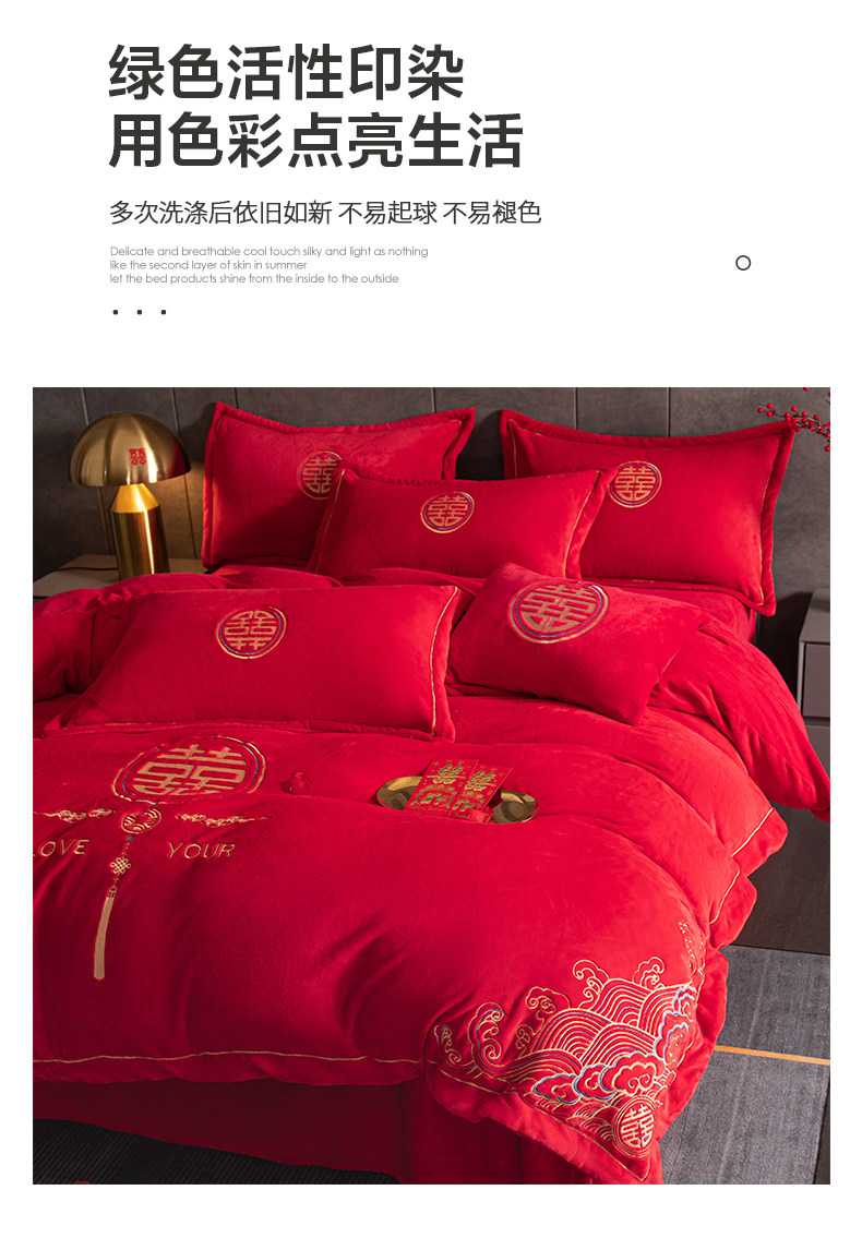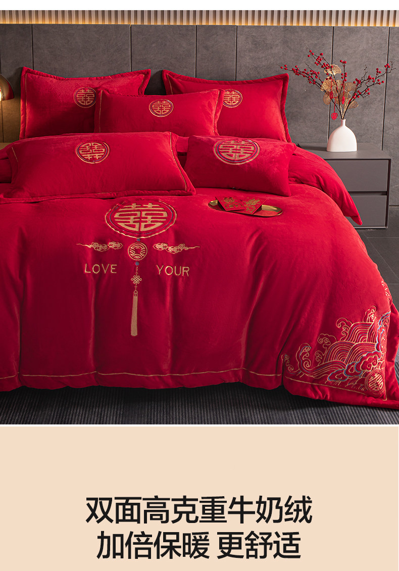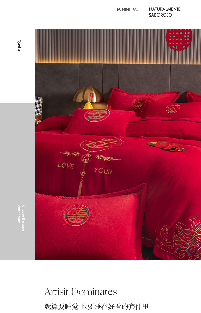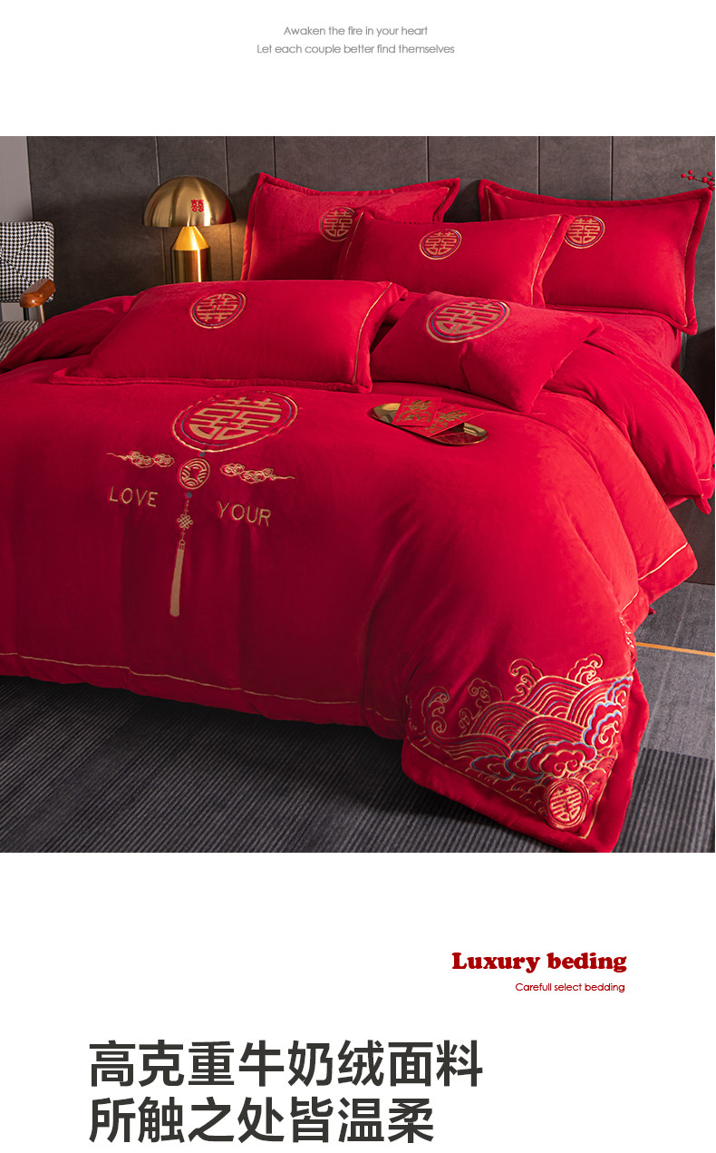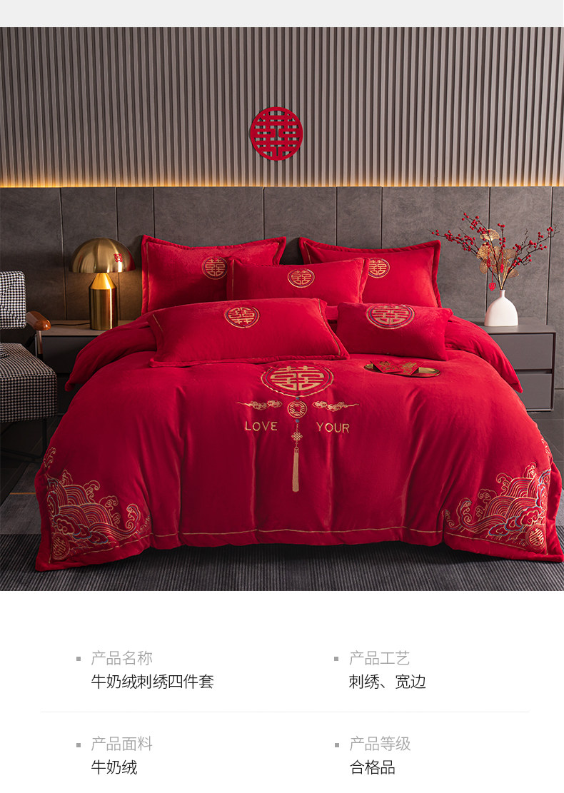 Wedding Milk Velvet Four-Piece Set, Winter Newlywed Celebration Quilt, Red Dowry, Coral Velvet Bed Sheet, Duvet Cover, Bedding