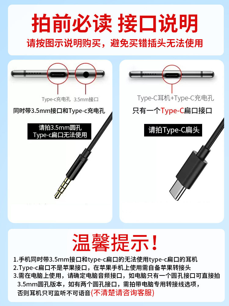 Wired In-Ear Gaming Headphones with Type-C Interface, High Sound Quality, Suitable for Oppo, Xiaomi, Vivo, Universal Round Hole