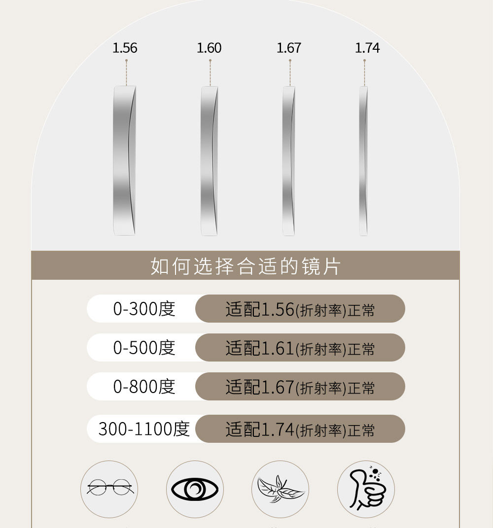 | Lens Refractive Index | Frame + 0 Degree Anti-Blue Light Lenses,1.56 Lightweight & Thin - Anti-Radiation Lenses [Suitable for 0-400 Degrees] Leave Prescription in Comments,1.61 Lightweight & Thin - Anti-Radiation Lenses [Suitable for 0-600 Degrees] Leave Prescription in Comments,1.67 Ultra-Thin Anti-Radiation Lenses [Suitable for 0-800 Degrees] Leave a Message for the Degree,1. 74 Ultra-Thin Anti-Radiation Lenses [Suitable for 0-1300 Degrees] - Leave Prescription in Comments,1.56 Ultra-Thin Blue Light Blocking Lenses [Suitable for 0-400 Degrees] - Leave Prescription in Comments,1.61 Lightweight & Thin - Blue Light Blocking Lenses [Suitable for 0-600 Degrees] Leave Prescription in Comments,1.67 Ultra-Thin Anti-Blue Light Lenses [Suitable for 0-800 Degrees] Leave a Message for the Degree,1. 74 Ultra-Thin Blue Light Blocking Lenses [Suitable for 0-1300 Degrees] - Leave Prescription in Comments,1.56 Ultra-Thin Anti-Fog & Blue Light Blocking Lenses [Suitable for 0-400 Degrees] - Leave Prescription in Comments,1.61 Lightweight Anti-Fog & Blue Light Blocking Lenses [Suitable for 0-600 Degrees] - Leave Prescription in Comments,1.67 Ultra-Thin Anti-Fog & Blue Light Blocking Lenses [Suitable for 0-800 Degrees] - Leave Prescription in Comments,1.56 Ultra-Thin-Wanxin Multi-Screen Anti-Blue Light Lenses under Essilor [Suitable for 0-400 Degrees],1.61 Thin and Light-Wanxin Multi-Screen Anti-Blue Light Lenses under Essilor [Suitable for 0-600 Degrees],1.67 Ultra-Thin - Essilor's Van New Multi-Screen Anti-Blue Light Lenses [Suitable for 0-800 Degrees],1.74 Ultra-Thin - Essilor's Varifocal Blue Light Blocking Lenses [Suitable for 0-1300 Degrees],Equipped with [Zeiss Vision] 1.56 Aspherical Lenses (Suitable for 0~400 Degrees),Equipped with [Zeiss Vision] 1.60 Aspherical Lenses (Suitable for 0~600 Degrees),Equipped with [Zeiss Vision] 1.67 Aspherical Lenses (Suitable for 0~800 Degrees),Equipped with [Zeiss Vision] 1.56 Anti-Blue Light Lenses (Suitable for 0~400 Degrees),Equipped with [Zeiss Vision] 1.60 Anti-Blue Light Lenses (Suitable for 0~600 Degrees),Equipped with [Zeiss Vision] 1.67 Anti-Blue Light Lenses (Suitable for 0~800 Degrees) |