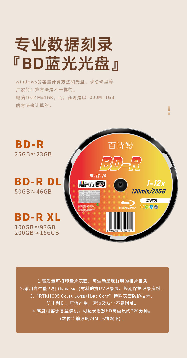 Baisiman Blu-Ray Printable Bd-R 25g Blu-Ray Disc Bd-R Dl 50g Burning Disc Blank Disc Taiwan Origin Large Capacity Disc 100G200G Burning Disc