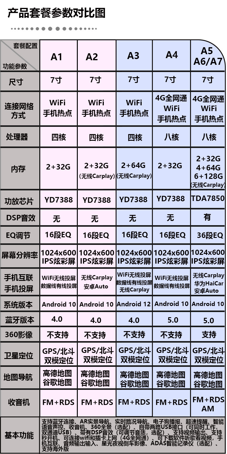 | Color Classification | A1: 7inch Wifi Version 2+32g (Basic Version),A2: 7inch Wifi Version 2+32G+Wireless Carplay (Basic Version),A3: 7inch Wifi Version 2+64G+Wireless Carplay (Upgraded Version),A4: 7-Inch 4g Version 2+32g (Upgraded Version),A5: 7-Inch 4g Version 2+32G+Wireless Carplay+Dsp (Flagship Version),A6: 7-Inch 4g Version 4+64G+Wireless Carplay+Dsp (Exclusive Version),A7: 7-Inch 4g Version 6+128G+Wireless Carplay+Dsp (Extreme Version) |