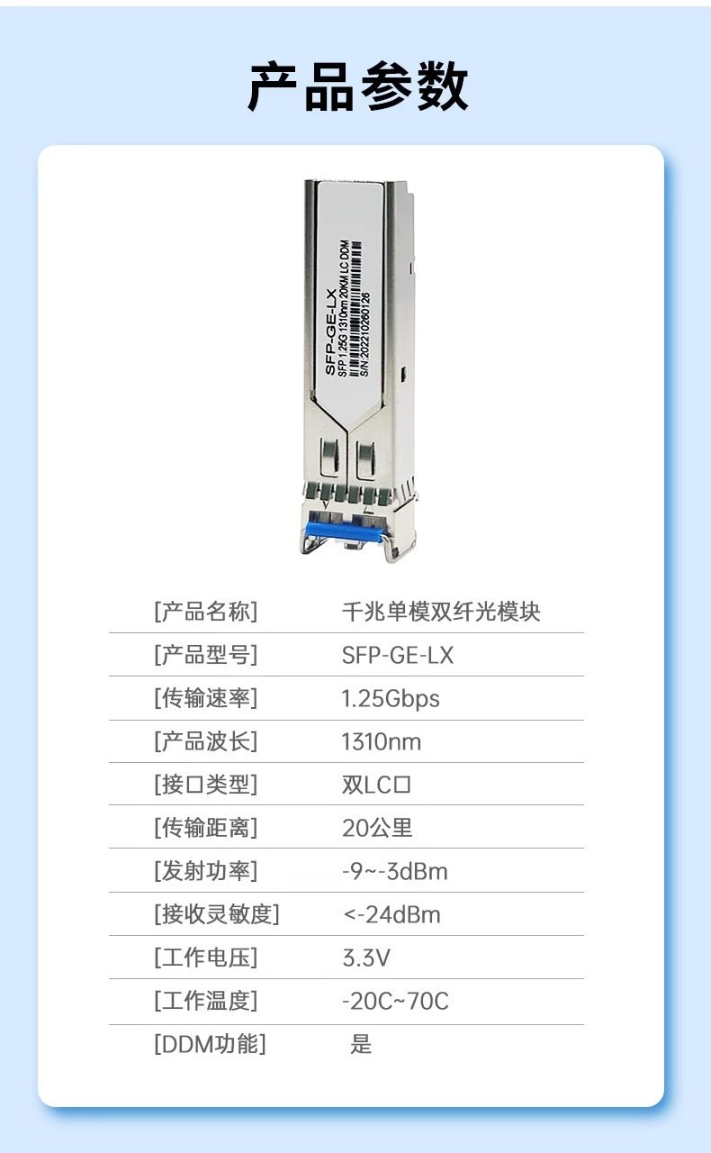 | Color Classification | 3Km Single Mode Dual Fiber/1.25G/1310Nm Lc Interface,20Km Single Mode Dual Fiber/1.25G/1310Nm Lc Interface,550m Multi-Mode Dual Fiber 850Nm Lc Interface |