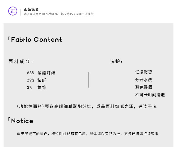 | Material Composition | Polyester Fiber 68% Viscose Fiber (Viscose Fiber) 29% Polyurethane Elastic Fiber (Spandex) 3% |