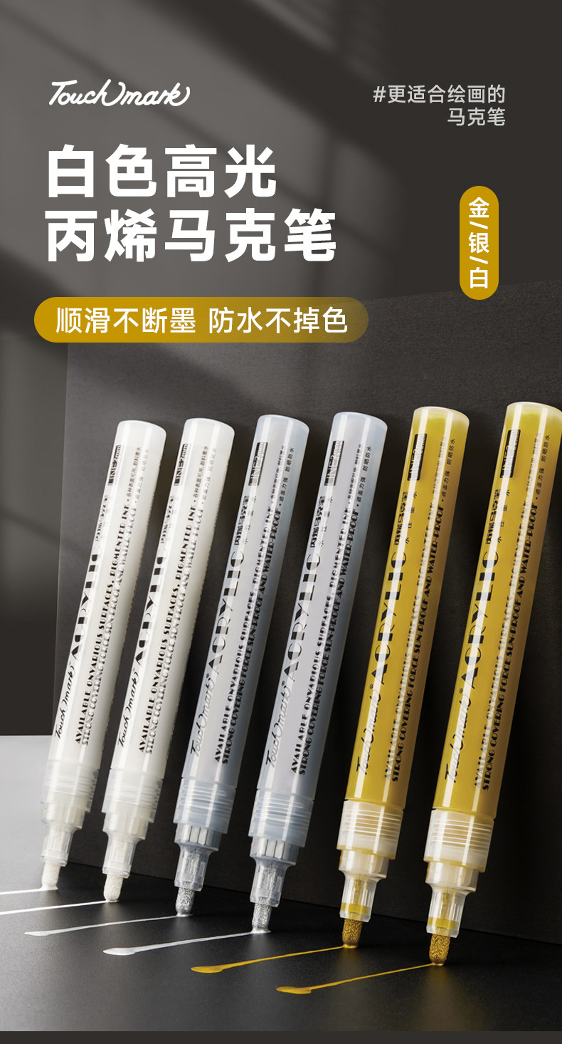 Touchmark White Highlighter Pen for Students' Art Use, Press-Type Acrylic Marker Pen, Waterproof Marker Pen, Black and Gold Album Photo Paper Graffiti Pen, Children's Clothing DIY