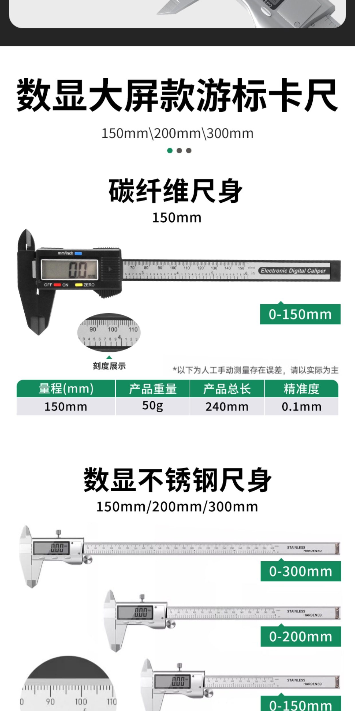 | Color Classification | Stainless Steel Digital Display 0-150mm,Stainless Steel Digital Display 0-200mm,Stainless Steel Digital Display 0-300mm,Carbon Steel Caliper 0-150mm (Without Digital Display),Carbon Steel Caliper 0-200mm (Without Digital Display),Carbon Steel Caliper 0-300mm (Without Digital Display),Ip54 Waterproof Stainless Steel Digital Display 0-150mm,Ip54 Waterproof Stainless Steel Digital Display 0-200mm,Ip54 Waterproof Stainless Steel Digital Display 0-300mm,High-Precision Luminous Stainless Steel Digital Display 0-150mm,High-Precision Luminous Stainless Steel Digital Display 0-200mm,High-Precision Luminous Stainless Steel Digital Display 0-300mm,Full Screen Stainless Steel Digital Display 0-150mm,Full Screen Stainless Steel Digital Display 0-200mm,Full Screen Stainless Steel Digital Display 0-300mm,Plastic Digital Caliper 0-150mm (Boxed),Plastic Digital Caliper 0-150mm (Bulk) |