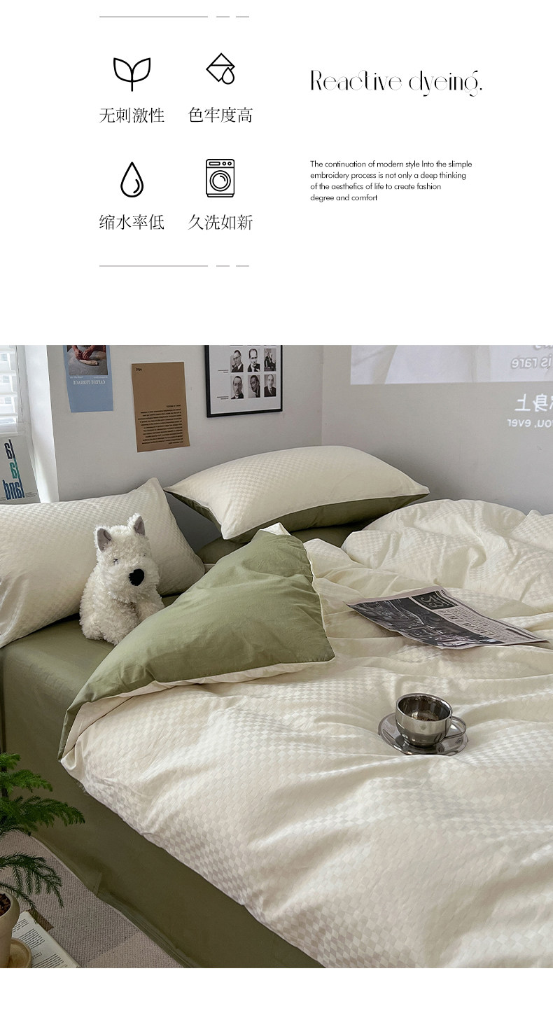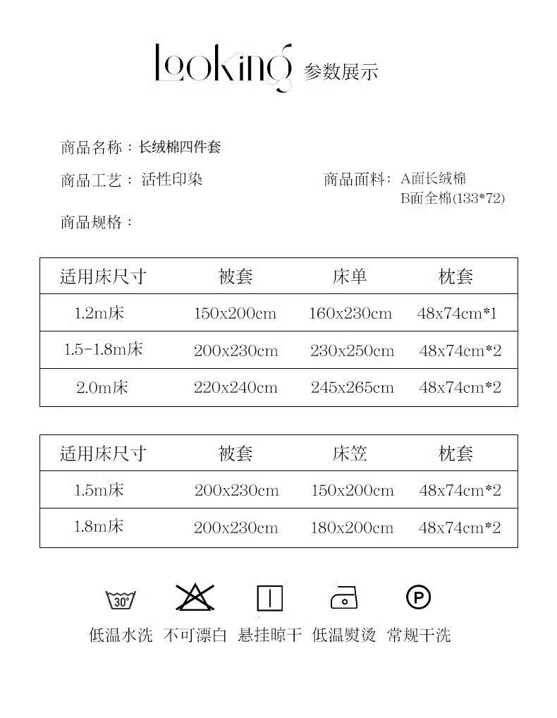 | Applicable Bed Size | 1.2m Bed Sheet Three-Piece Set [Sheet*1+Quilt Cover*1+Pillowcase*1],1.5m Bed Sheet Four-Piece Set [Sheet*1+Quilt Cover*1+Pillowcase*2],1.8m Bed Sheet Four-Piece Set [Sheet*1+Quilt Cover*1+Pillowcase*2],2.0m Bed Sheet Four-Piece Set [Sheet*1+Quilt Cover*1+Pillowcase*2],1.5m Fitted Sheet Set of Four [Fitted Sheet*1+Quilt Cover*1+Pillowcase*2],1.8m Fitted Sheet Set of Four [Fitted Sheet*1+Quilt Cover*1+Pillowcase*2] |