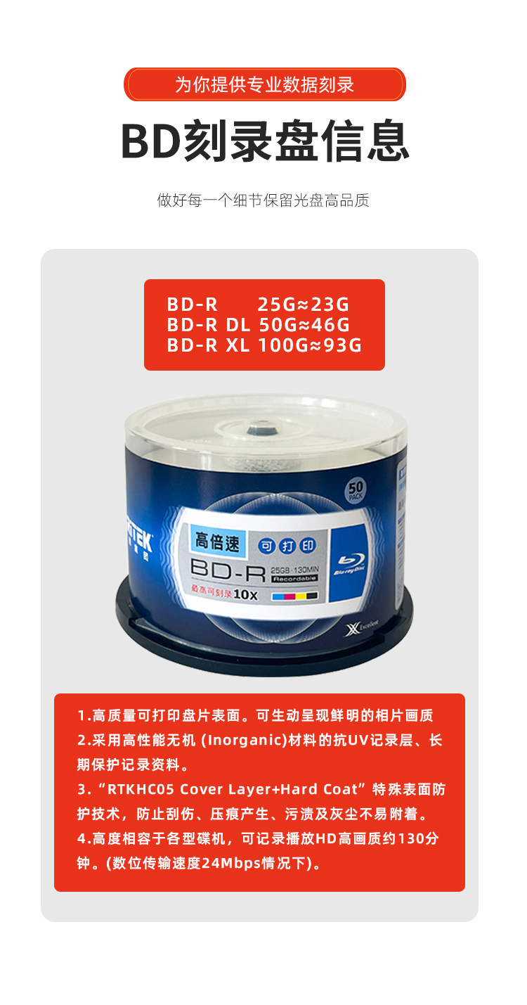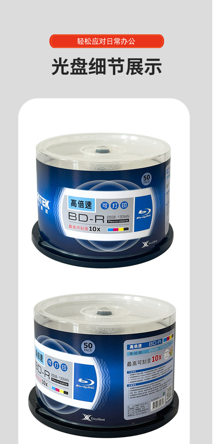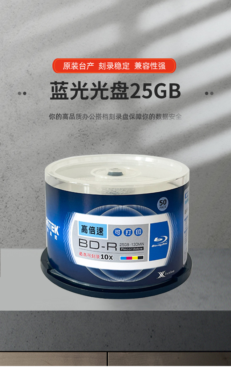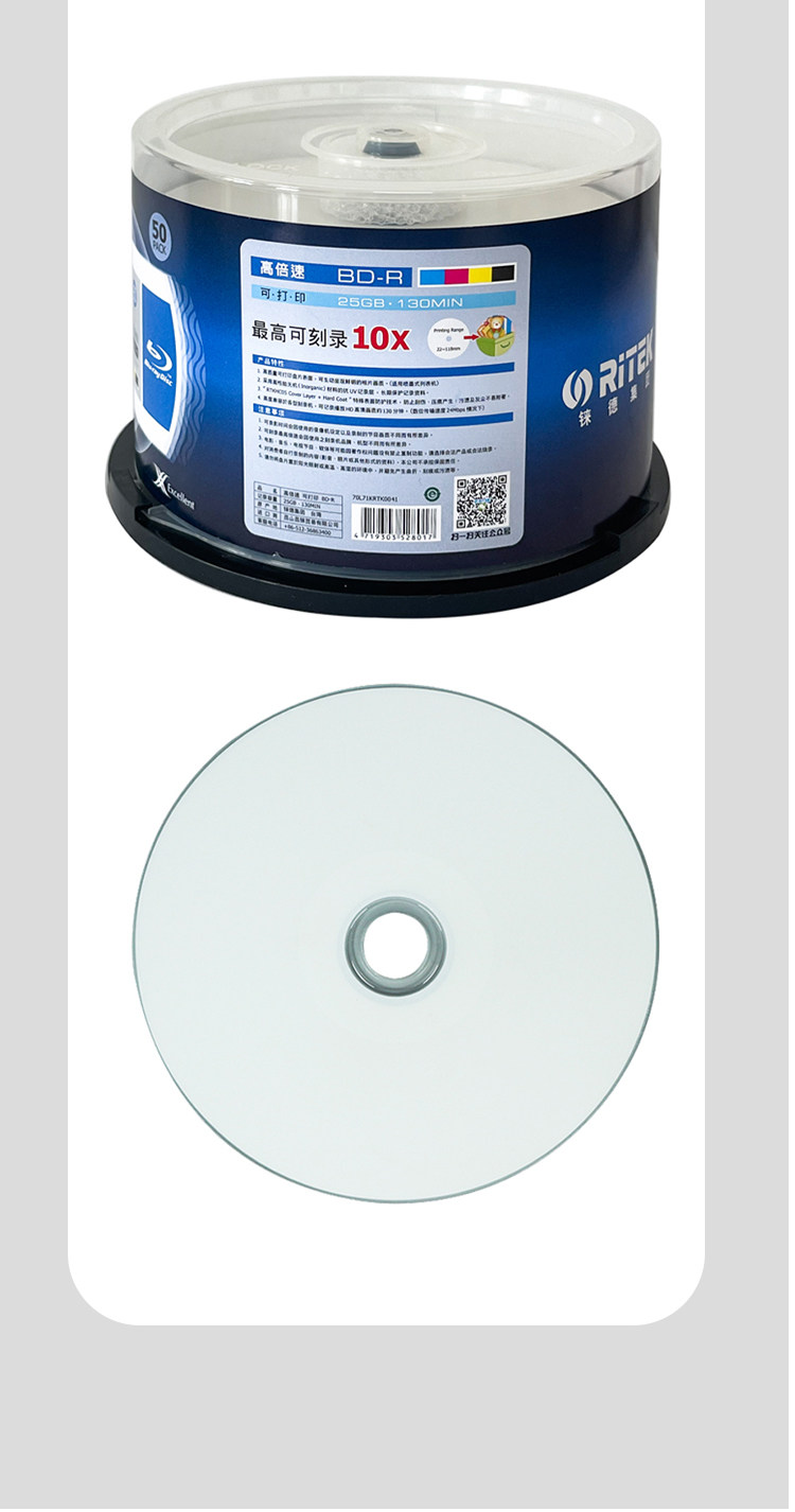Ritek Blu-Ray 25g Burning Disc Bd-R Large Capacity Printable Disc 1-10X High-Speed Blank Disc 50 Pieces in a Barrel
