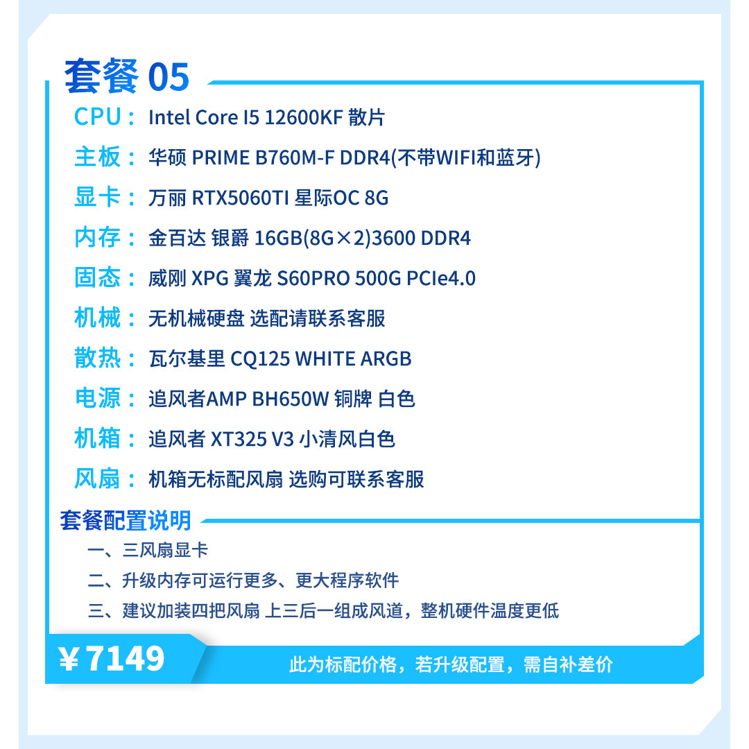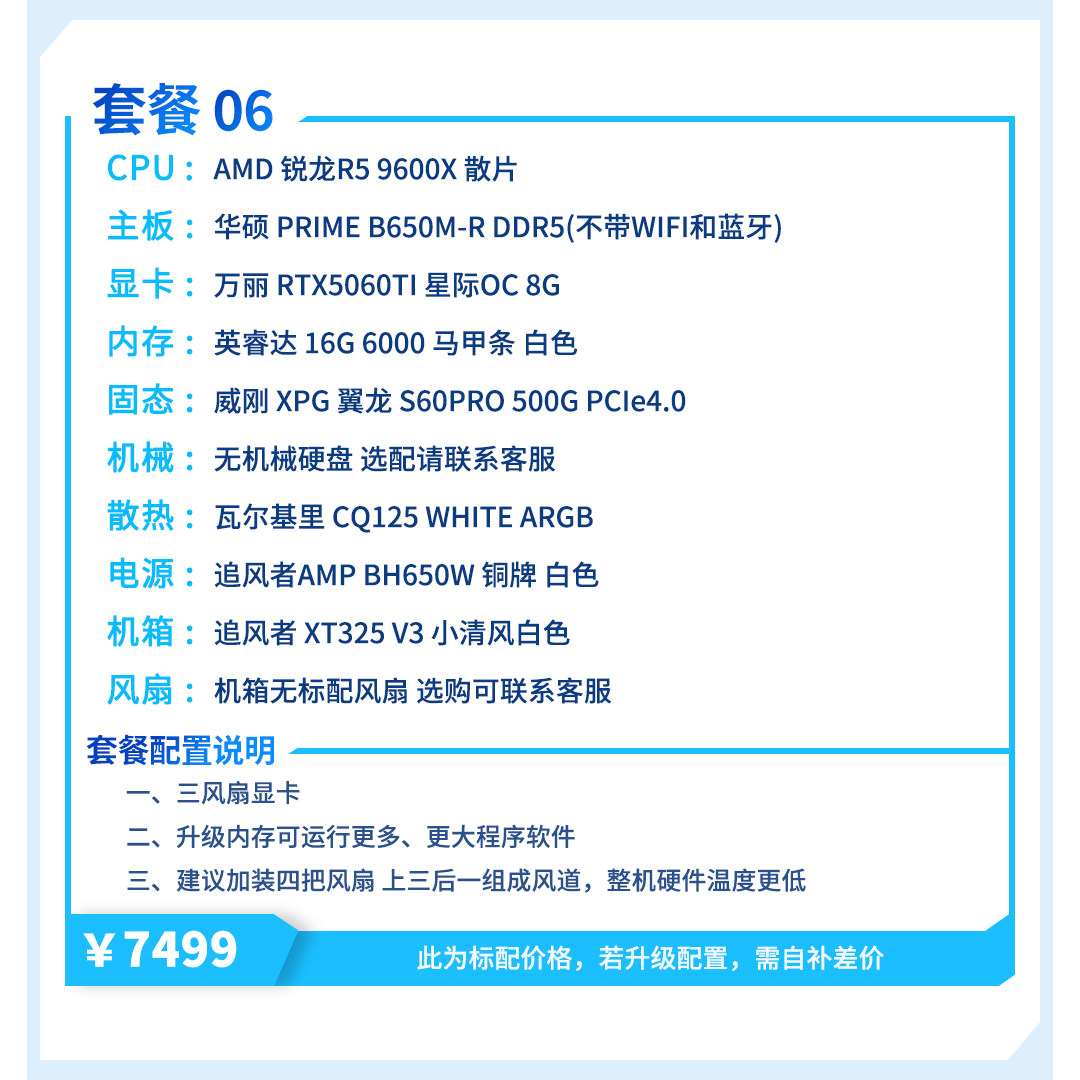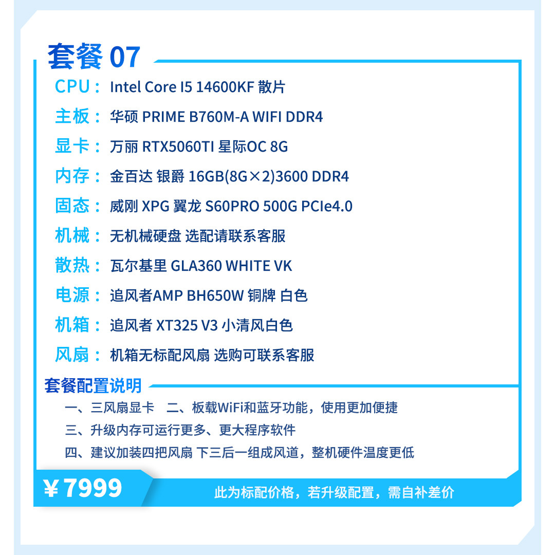 | Package Type | Package 1 (R5 5600+Rtx5060Ti),Package 2 (I5 12400F+Rtx5060Ti),Package Three (R7 5700X+Rtx5060Ti),Package 4 (R5 7500F+Rtx5060Ti),Package 5 (I5 12600Kf+Rtx5060Ti),Package 6 (R5 9600X+Rtx5060Ti),Package 7 (I5 14600Kf+Rtx5060Ti),Package 8 (I5 14600Kf+Rtx5060Ti),Package 9 (R7 9700X+Rtx5060Ti),Package 10 (R7 7800X3D+Rtx5060Ti) |