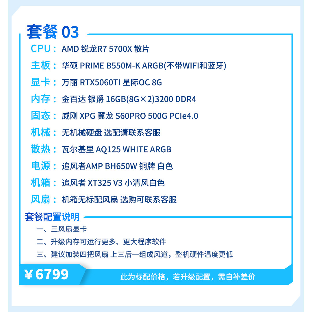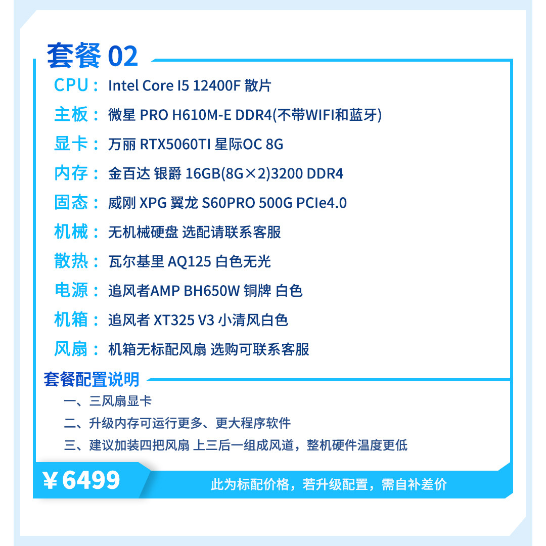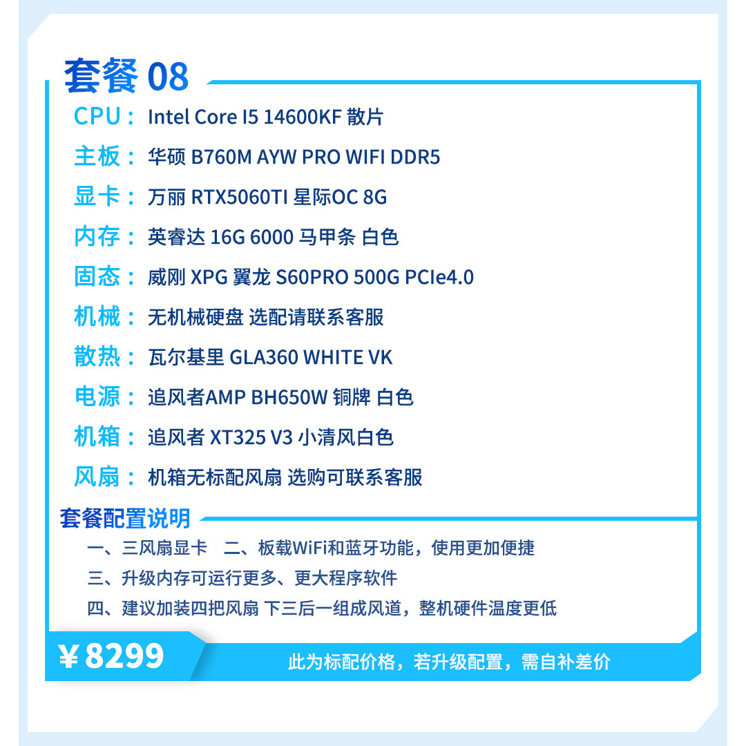 | Package Type | Package 1 (R5 5600+Rtx5060Ti),Package 2 (I5 12400F+Rtx5060Ti),Package Three (R7 5700X+Rtx5060Ti),Package 4 (R5 7500F+Rtx5060Ti),Package 5 (I5 12600Kf+Rtx5060Ti),Package 6 (R5 9600X+Rtx5060Ti),Package 7 (I5 14600Kf+Rtx5060Ti),Package 8 (I5 14600Kf+Rtx5060Ti),Package 9 (R7 9700X+Rtx5060Ti),Package 10 (R7 7800X3D+Rtx5060Ti) |