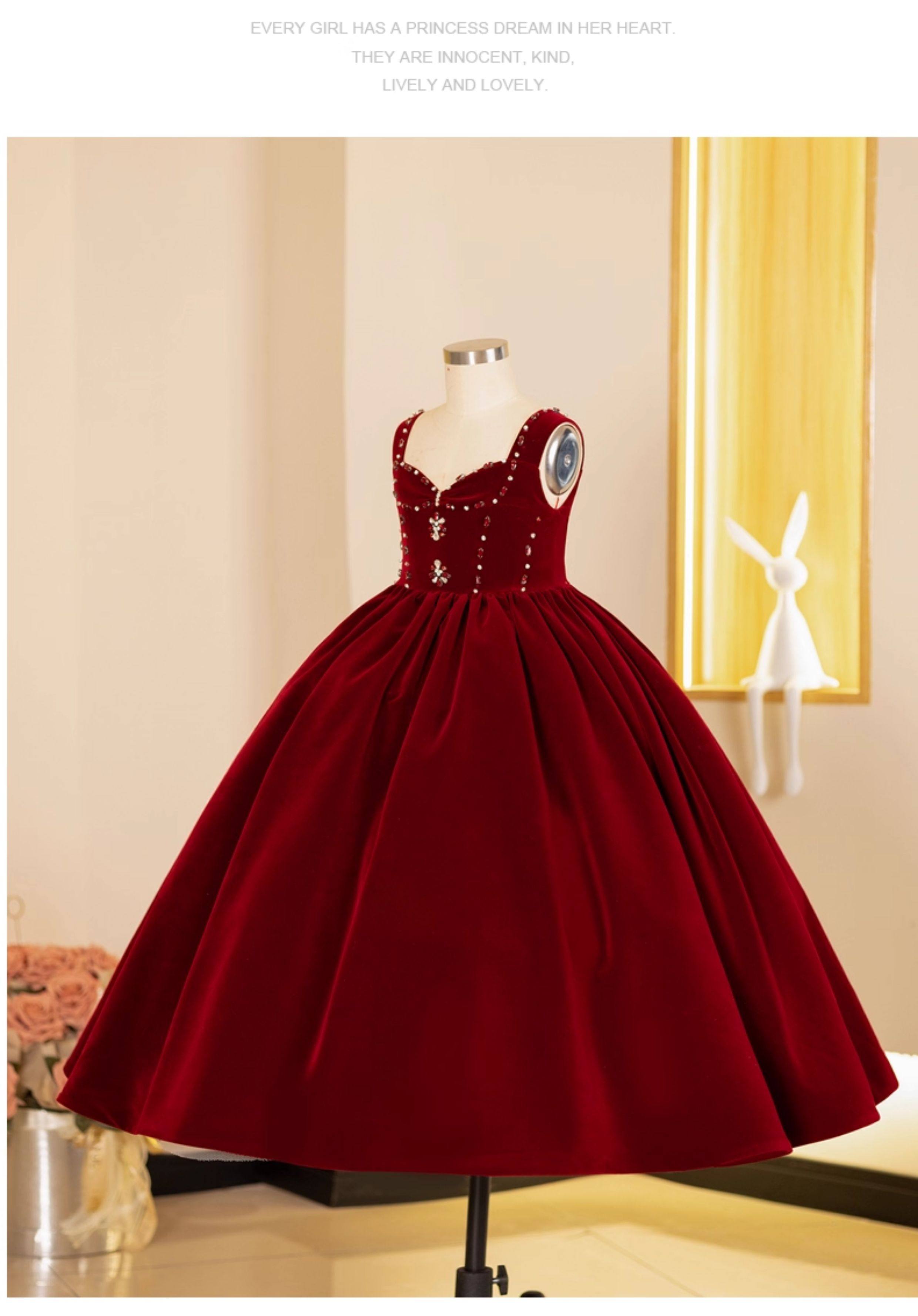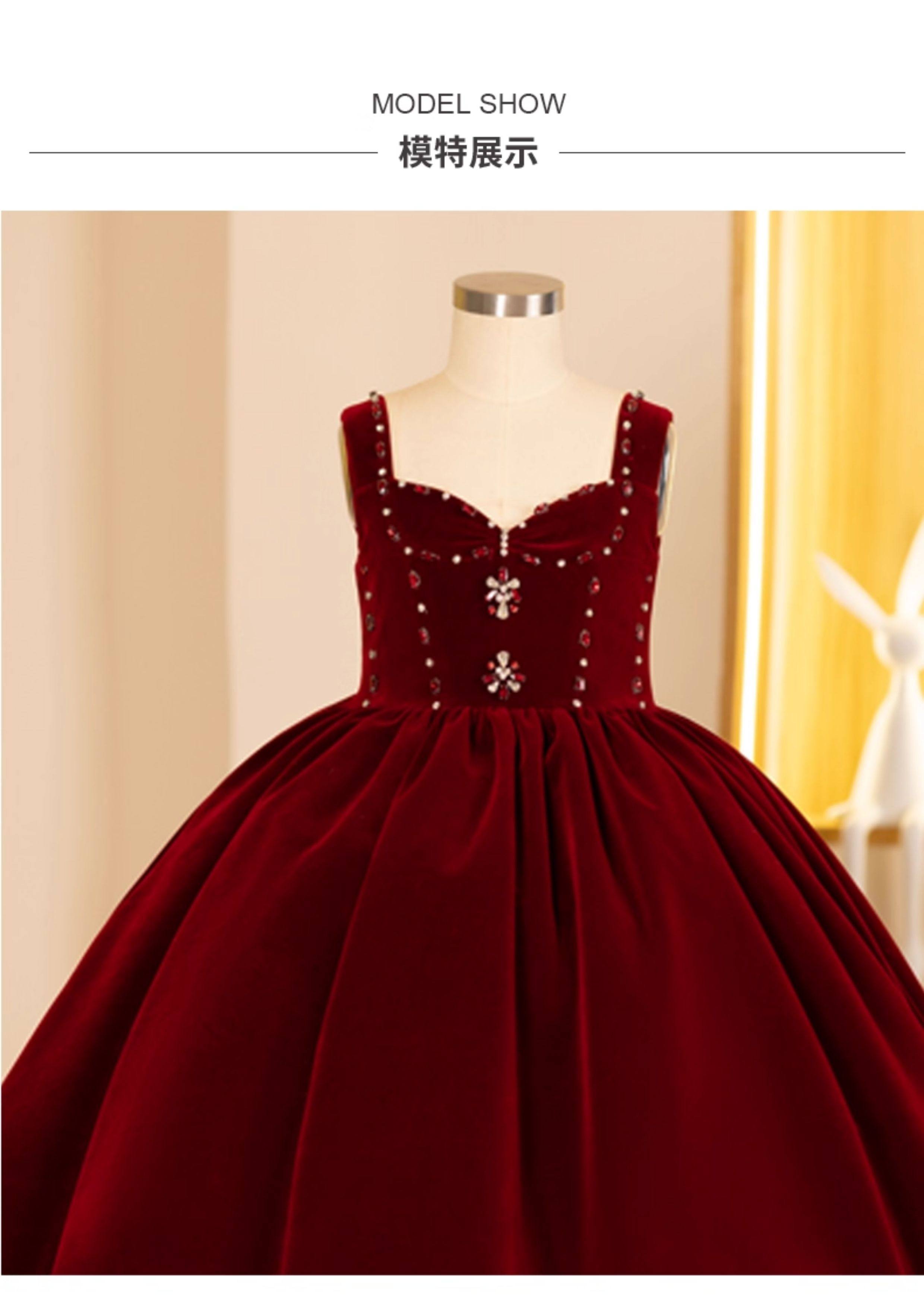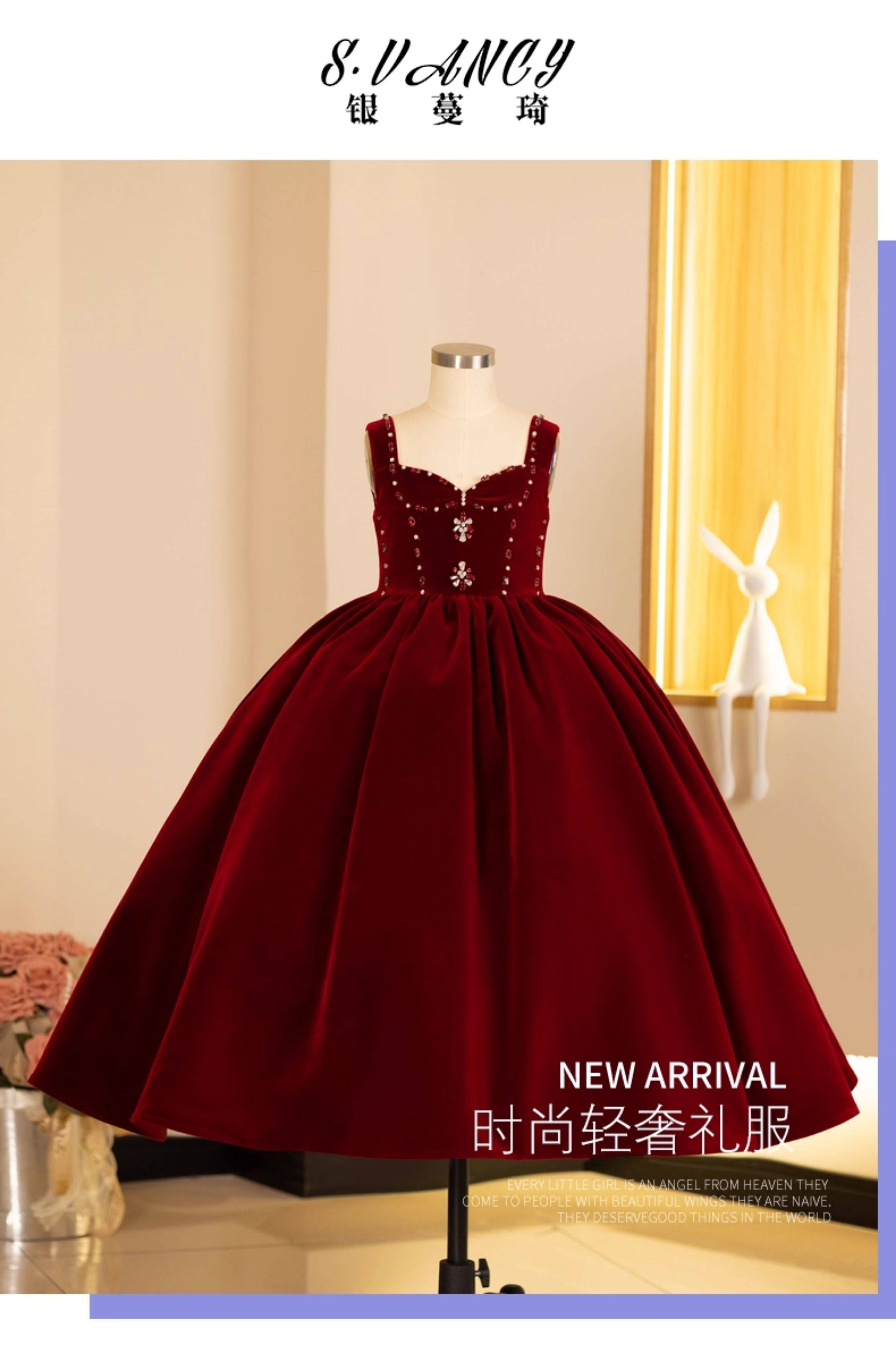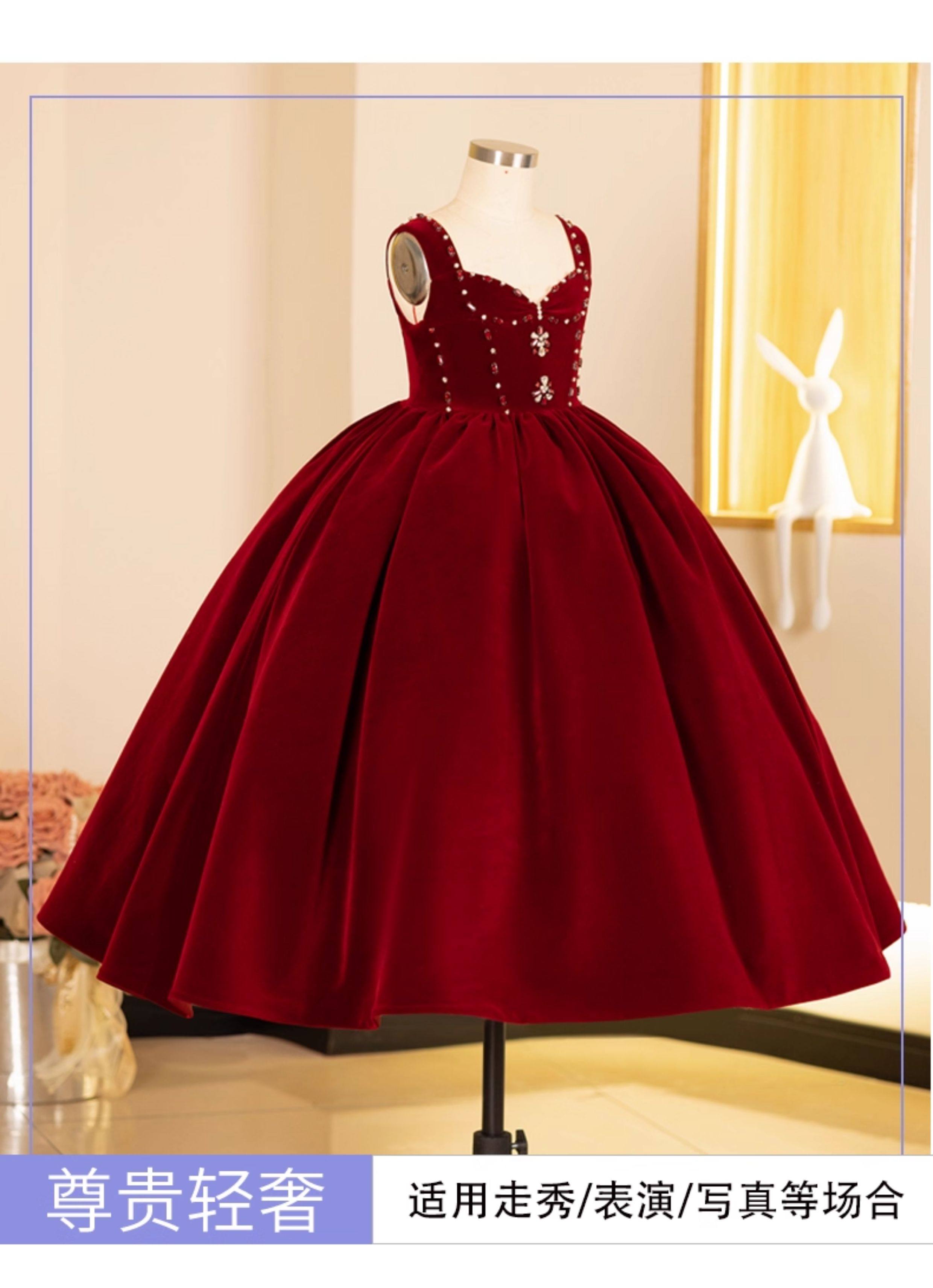 Girls' Dress, Light Luxury, Niche, High-End Flower Girl Wedding Red Princess Dress, Autumn and Winter Velvet Host Piano Performance Dress