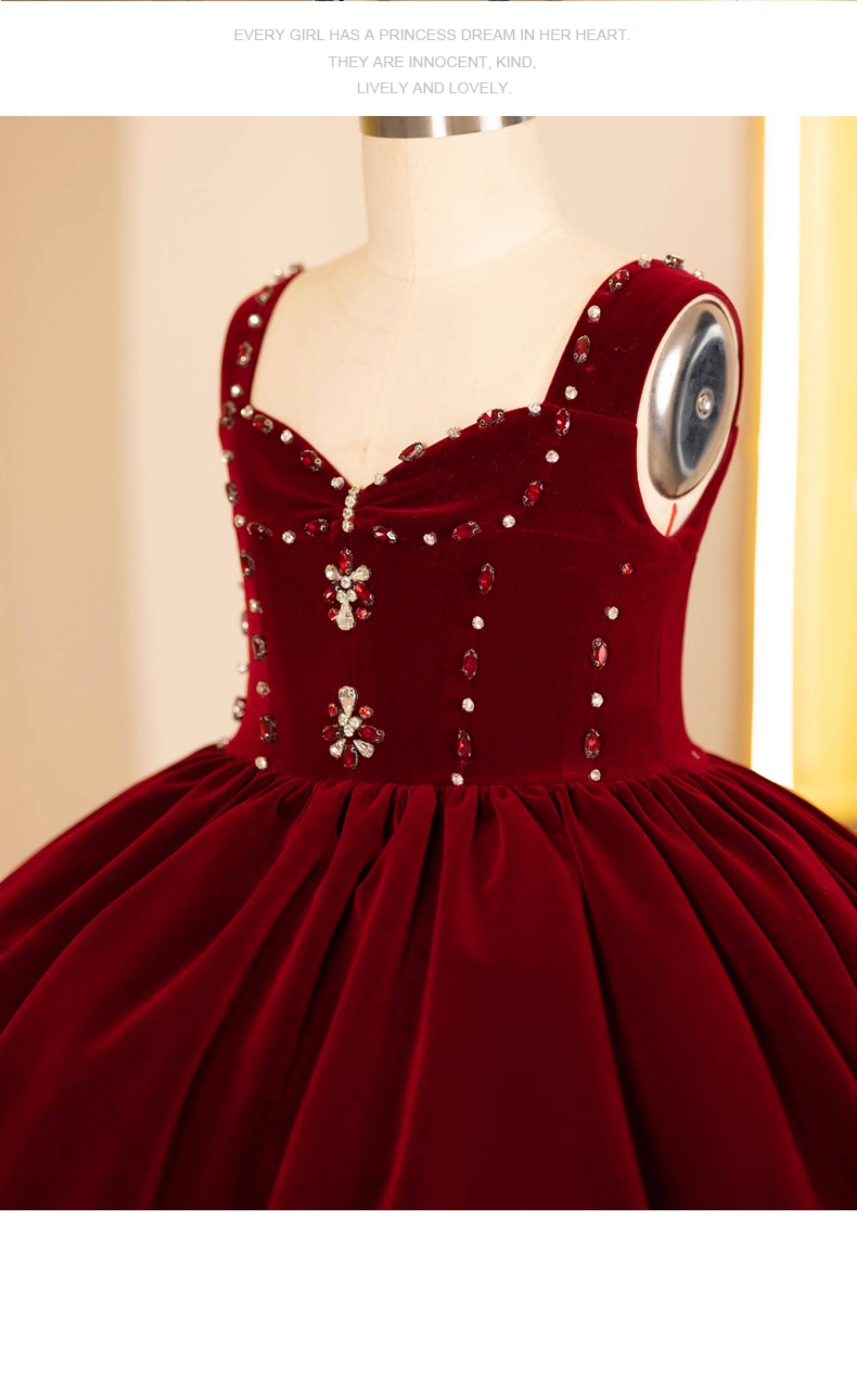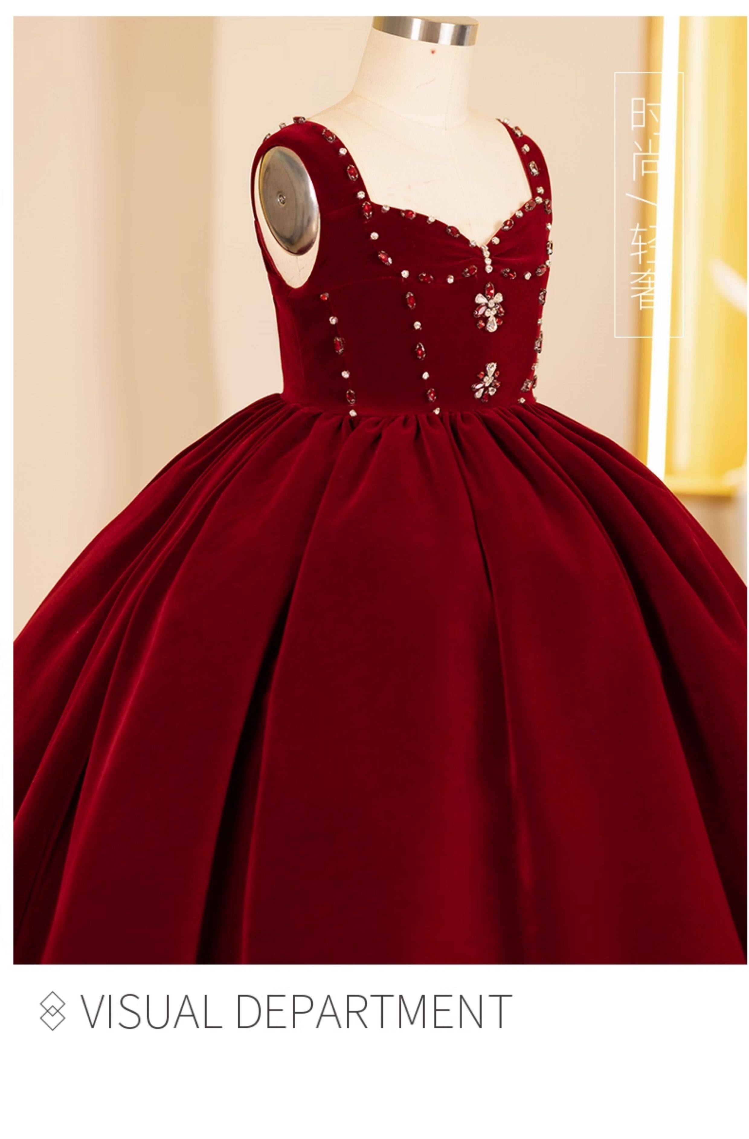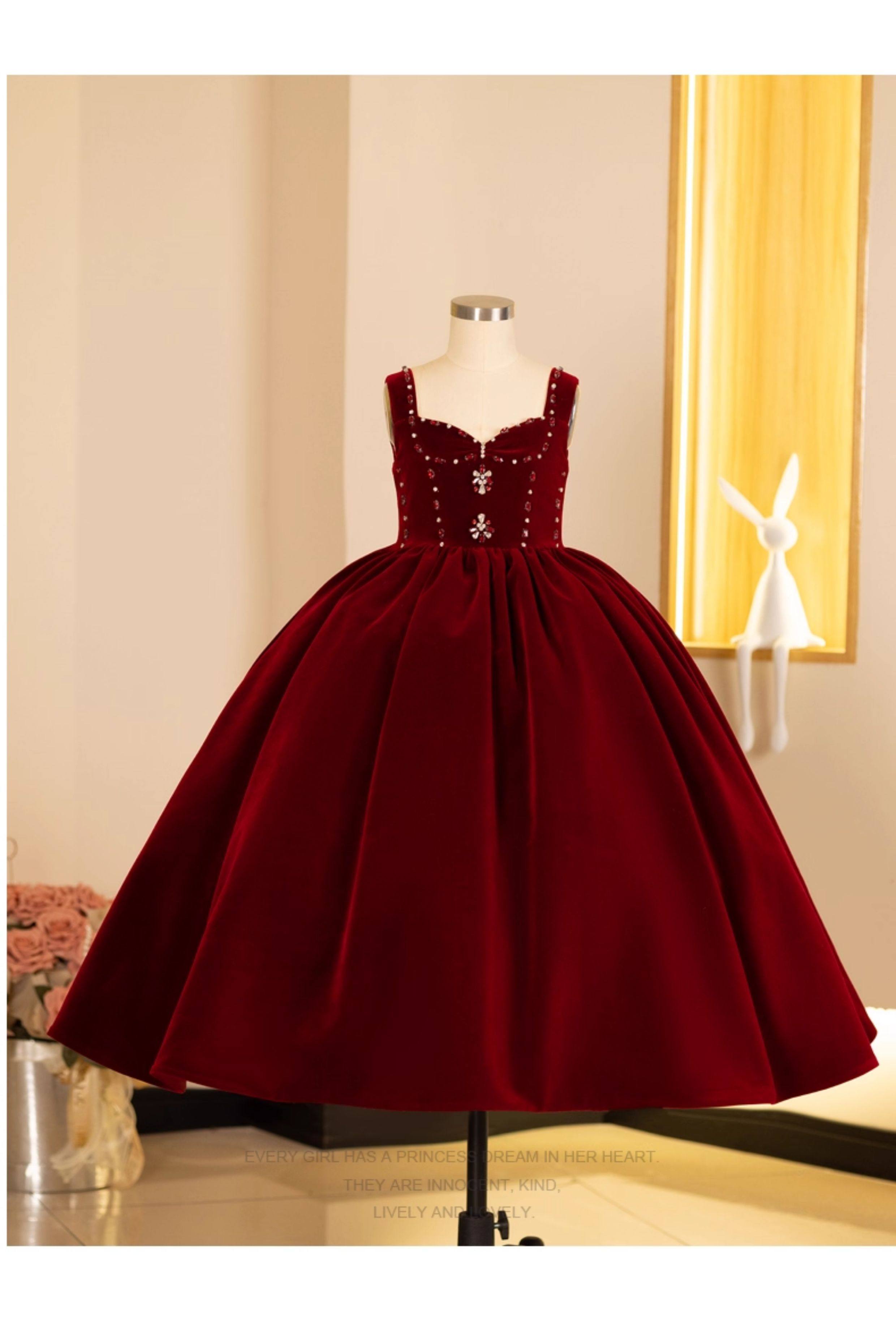 Girls' Dress, Light Luxury, Niche, High-End Flower Girl Wedding Red Princess Dress, Autumn and Winter Velvet Host Piano Performance Dress