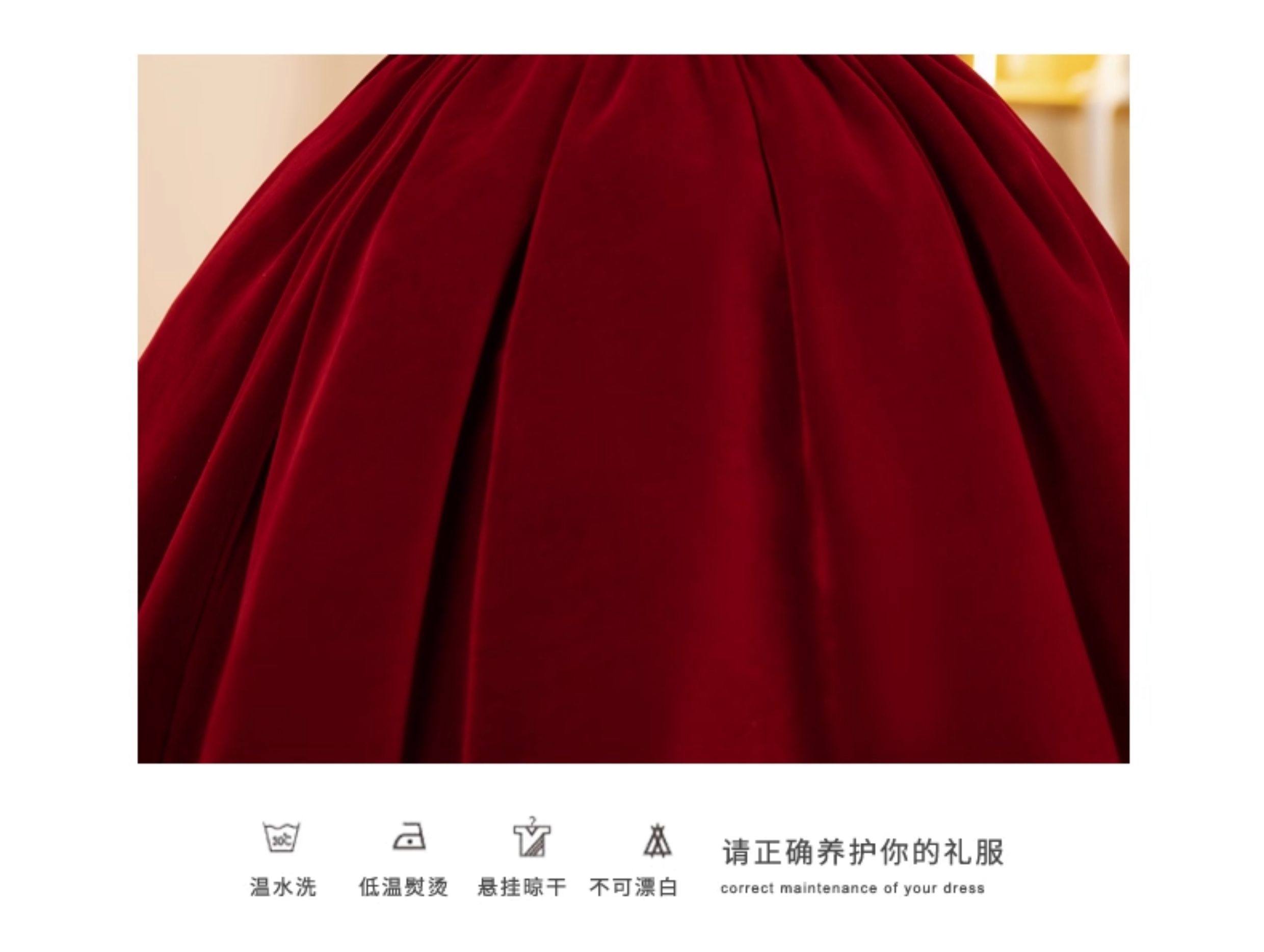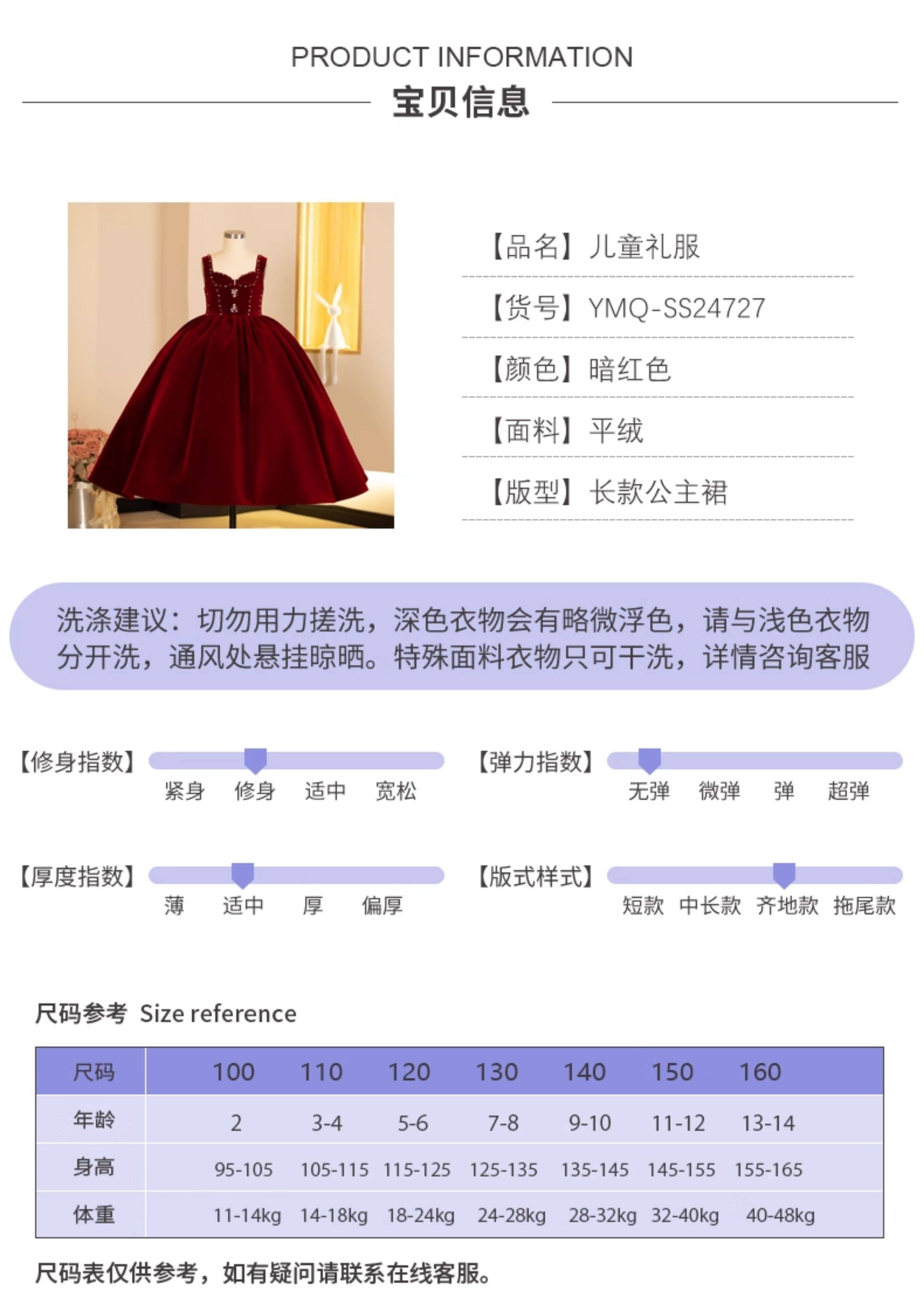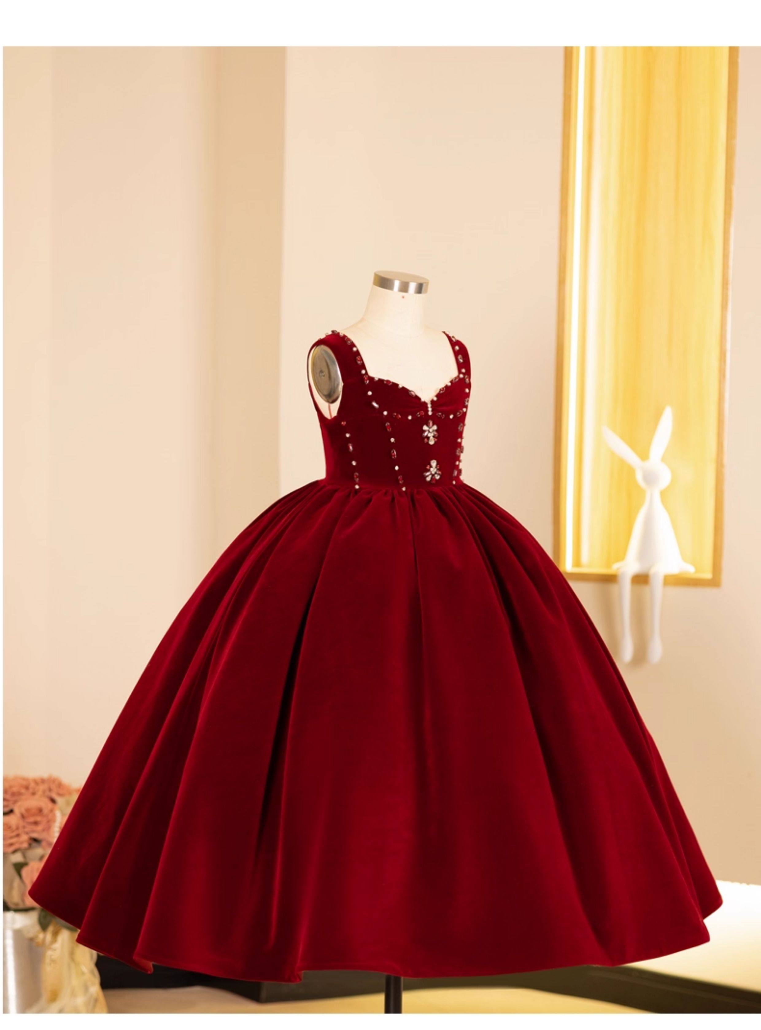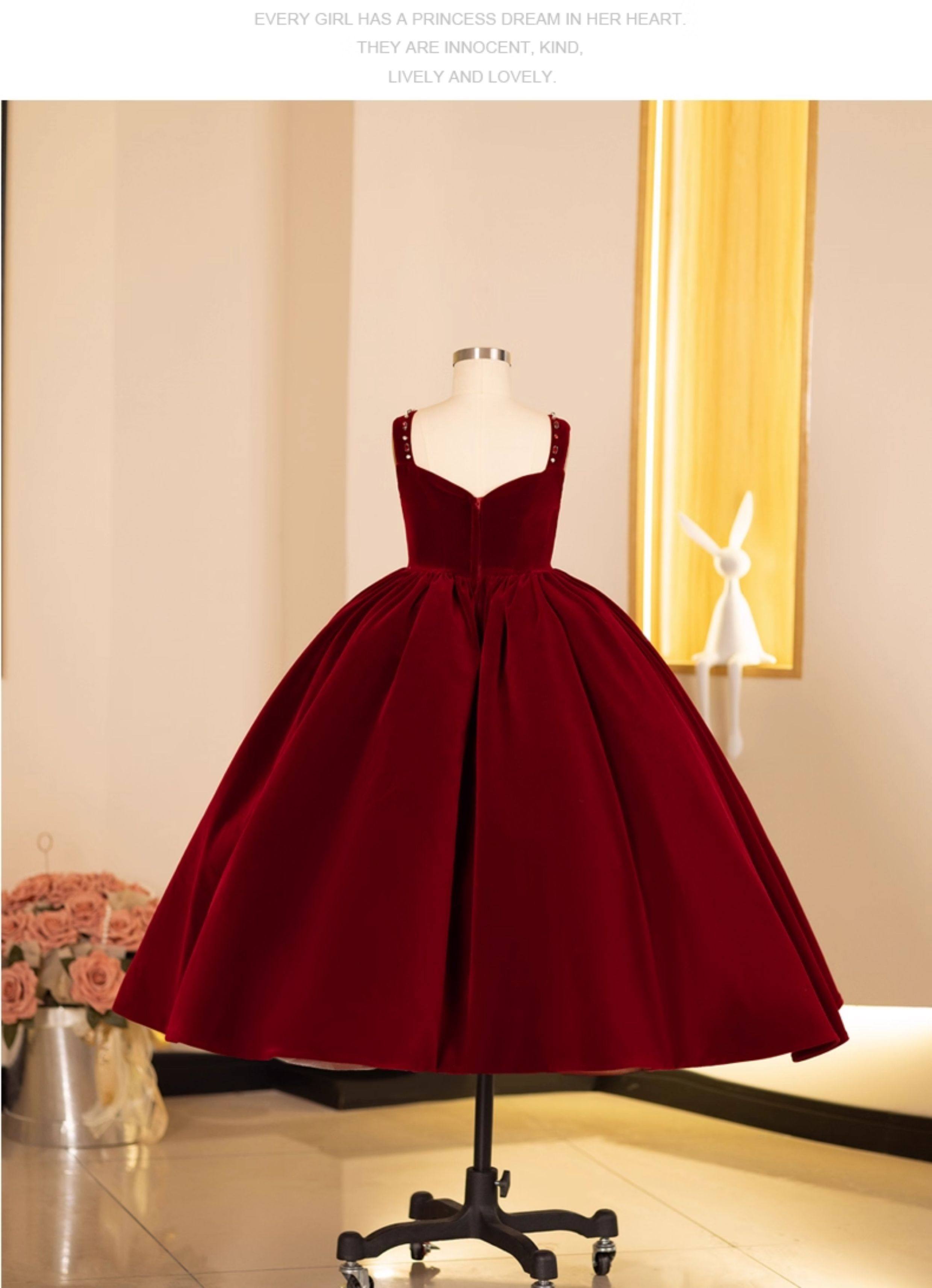 Girls' Dress, Light Luxury, Niche, High-End Flower Girl Wedding Red Princess Dress, Autumn and Winter Velvet Host Piano Performance Dress
