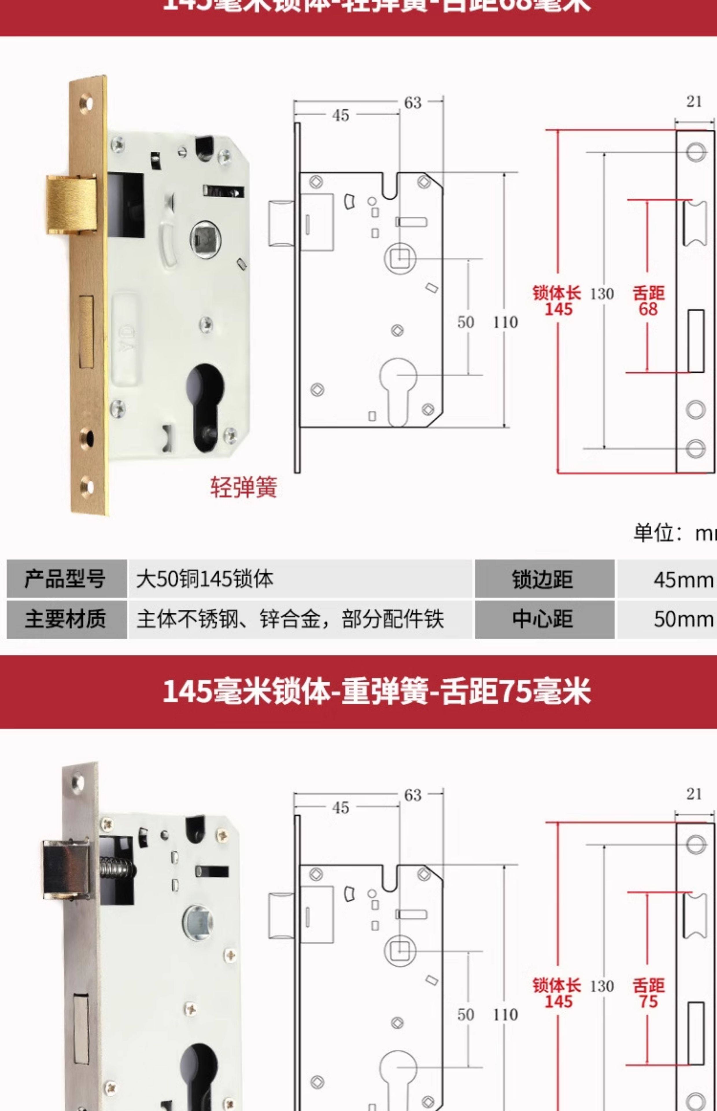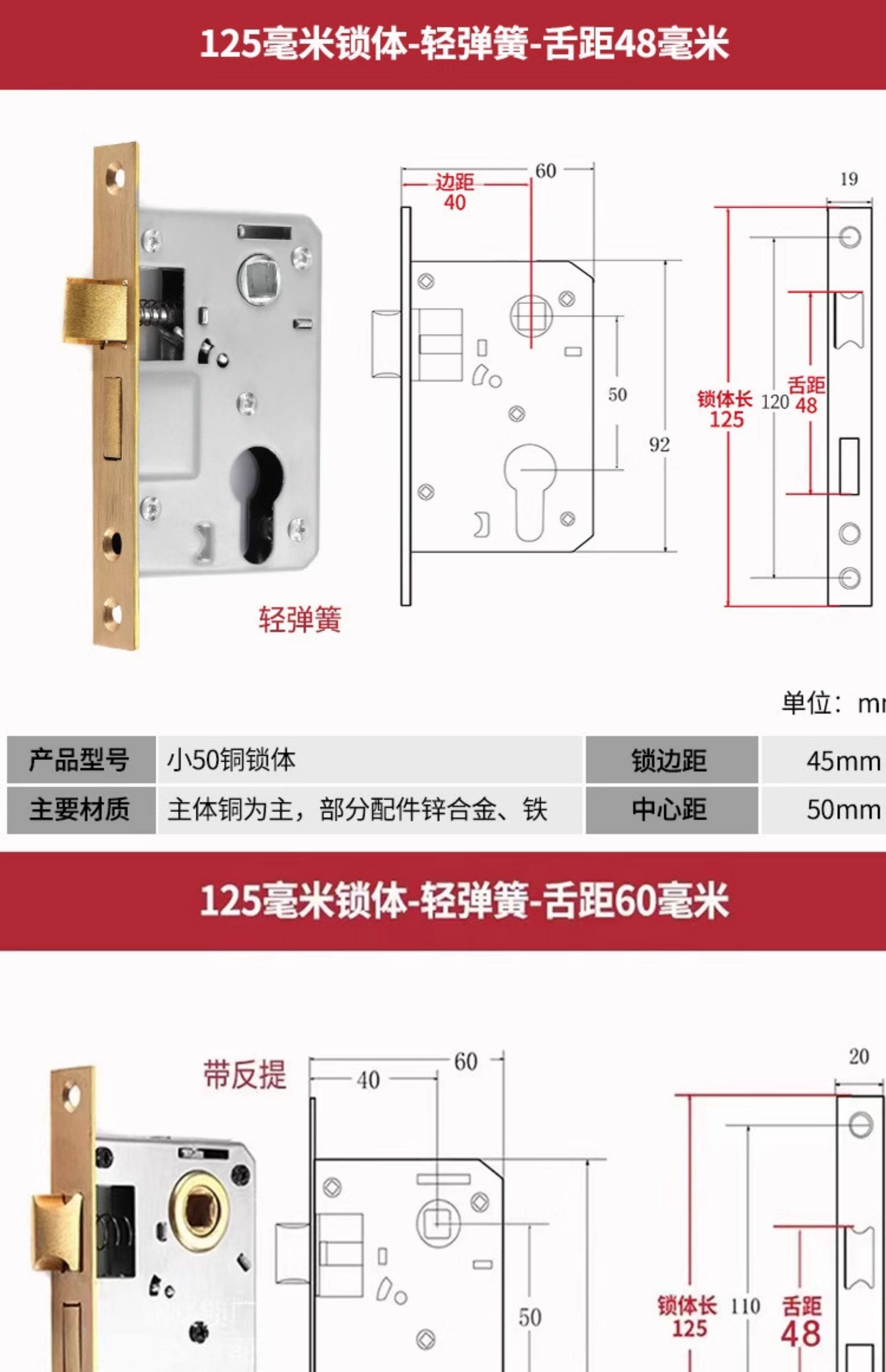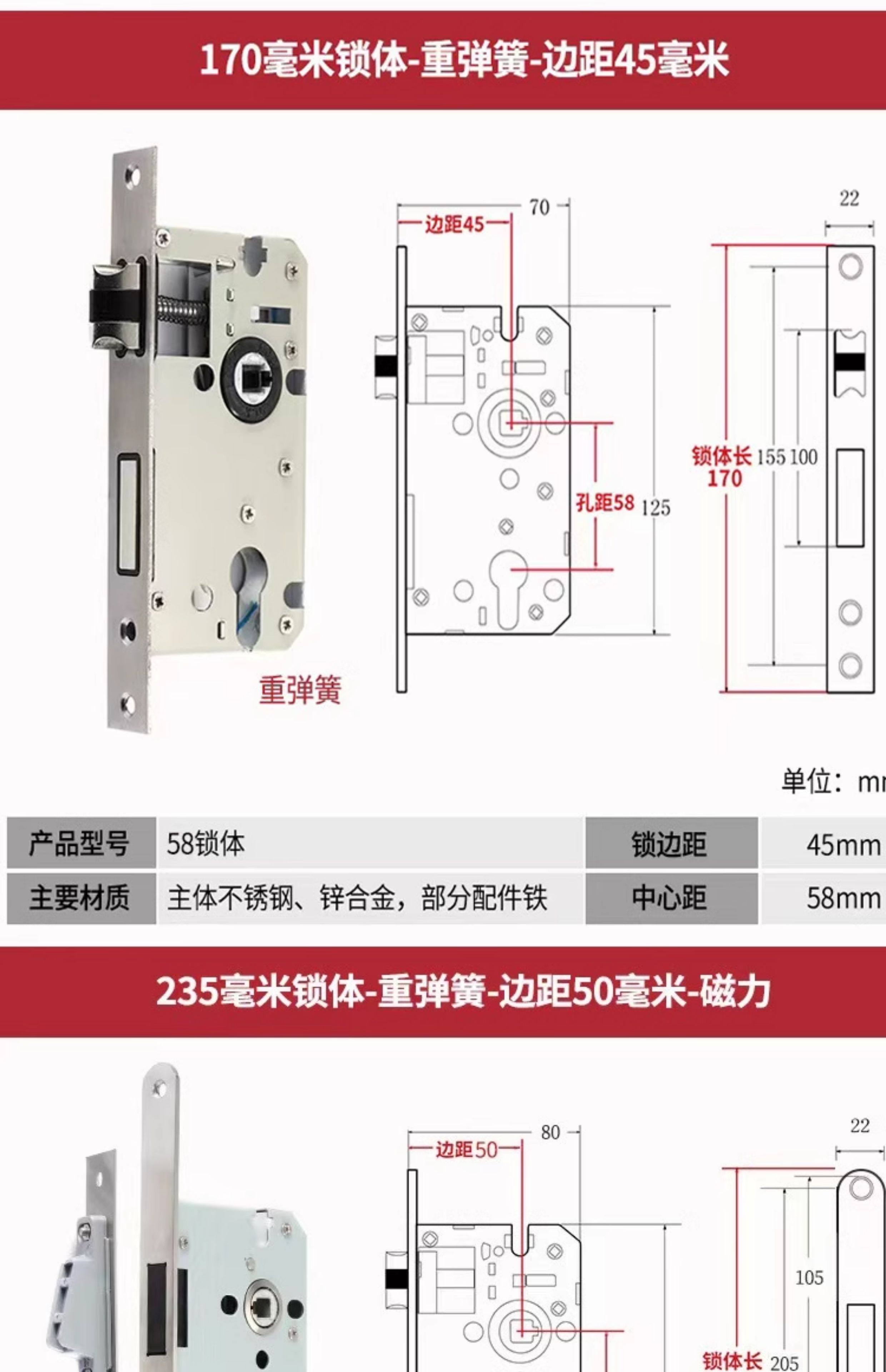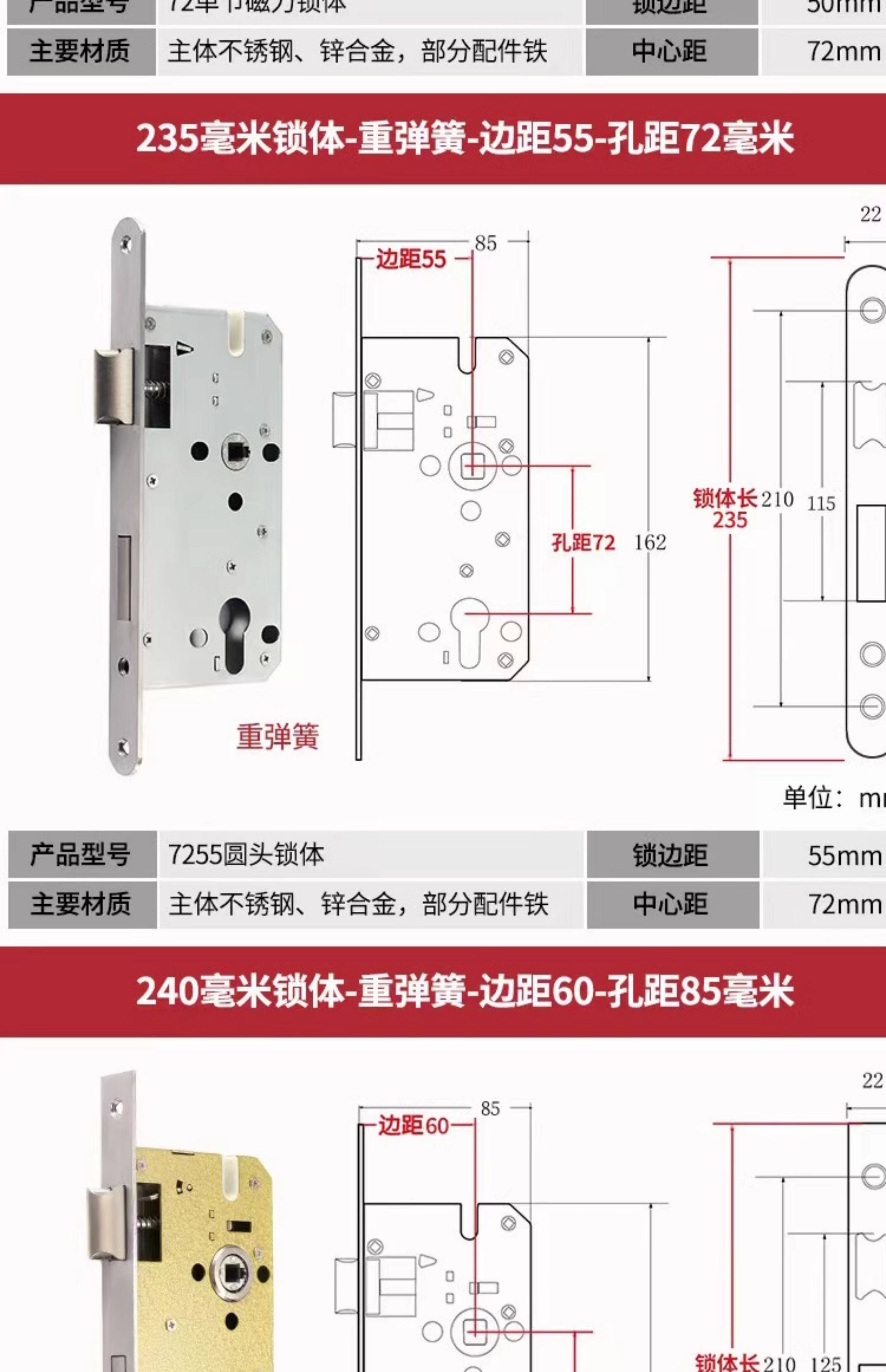 | Color Classification | Small 70 Stainless Steel Color One Copper Lock Core/Copper Key,Small 70 Black One Copper Lock Core/Copper Key,Small 70 Gold One Copper Lock Core/Copper Key,Small 70 Pure Copper Lock Cylinder One Copper Lock Cylinder/Copper Key,125 Small 50 Old-Fashioned - Light Spring - Tongue Distance 48,125 Small 50 Copper--Light Spring-Tongue Distance 48,125 Small 50 Copper Reverse Lift-Light Spring-Tongue Distance 48,125 Small 50 Bearing-Light Spring-Tongue Distance 60,125 Small 50 Silent Double Tongue-Light Spring-Tongue Distance 60,Reverse Lift 125 Small 50 Silent - Light Spring - Tongue Distance 60,135 Small 50 Copper-Light Spring-Tongue Distance 48,138 Old-Fashioned Large 50-Light Spring-Tongue Distance 60,145 Small 50 Copper-Light Spring-Tongue Distance 48,145 Old-Fashioned Large 50-Light Spring-Tongue Distance 65,145 Copper Large 50-Light Spring-Tongue Distance 68,145 Old Style Large 50-Light Spring-Tongue Distance 75,148 Old-Fashioned Large 50-Light Spring-Tongue Distance 65,148 Old-Fashioned Large 50-Light Spring-Tongue Distance 75,155 Old-Fashioned Large 50-Light Spring-Tongue Distance 65,155 Old-Fashioned Large 50-Light Spring-Tongue Distance 80,160 Large 50 Linkage-Key Door Opening-Light Spring-Tongue Distance 80,Reverse Lift 160 Large 50 Silent - Light Spring - Tongue Distance 85,Reverse Lift 160 Large 50 Bearing-Light Spring-Tongue Distance 85,160 Large 50 Silent-Light Spring-Tongue Distance 85,160 Large 50 Silent-Heavy Spring-Tongue Distance 85,Reverse Lift 160 Large 50 Three-Prong Silent High-End - Light Spring - Tongue Distance 85,160 High-End Large 50 Magnetic-Light Spring-Tongue Distance 88,165 High-End Old-Fashioned 58-Heavy Spring-Tongue Distance 93,170 Large 50 Silent Three-Prong-Light Spring-Tongue Distance 85,170 High-End Old-Fashioned 58-Heavy Spring-Tongue Distance 93,170 Long 58 Silent-Heavy Spring-Tongue Distance 93,170 High-End 58 Silent Three-Prong-Heavy Spring-Tongue Distance 95,Anti-Lift 170 High-End 58 Silent Three-Prong-Heavy Spring-Tongue Distance 95,170 High-End One Section 58 Magnetic - Heavy Spring - Tongue Distance 40,170 High-End Two-Section 58 Magnetic-Heavy Spring-Tongue Distance 93,178 Round Head 5845-Heavy Spring-Tongue Distance 93,180 Round Head 5845-Heavy Spring-Tongue Distance 95,180 Square Head High-End 58 Silent Three-Prong-Heavy Spring-Tongue Distance 95,180 Rectangular Head 7250-Heavy Spring-Small Hoist Hole,190 Long 7250-Heavy Spring-Small Hoist Hole,190 Long Round Head 7250-Heavy Spring-Small Hoist Hole,235 Long Round Head 7250-Heavy Spring-Small Hoist Hole,235 Long 72 Magnetic Section - Small Gourd,235 Long 7260 Round Head-Heavy Spring-Tongue Distance 115,240 Long 7255-Heavy Spring-Tongue Distance 115,240 Long 8550-Heavy Spring-Tongue Distance 125,240 Long 8560-Heavy Spring-Tongue Distance 125,Small 70 Stainless Steel Lock Cylinder with Zinc Core/Steel Key |