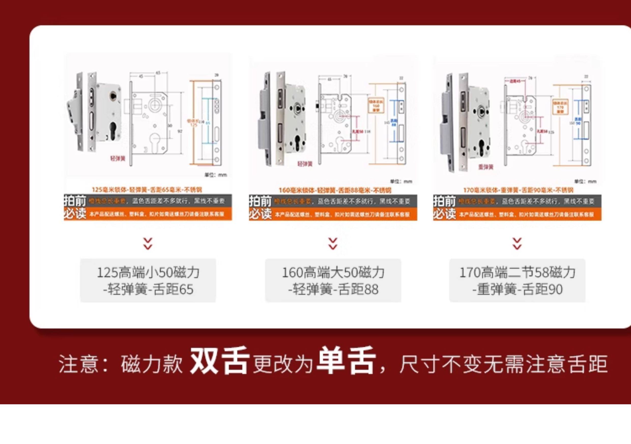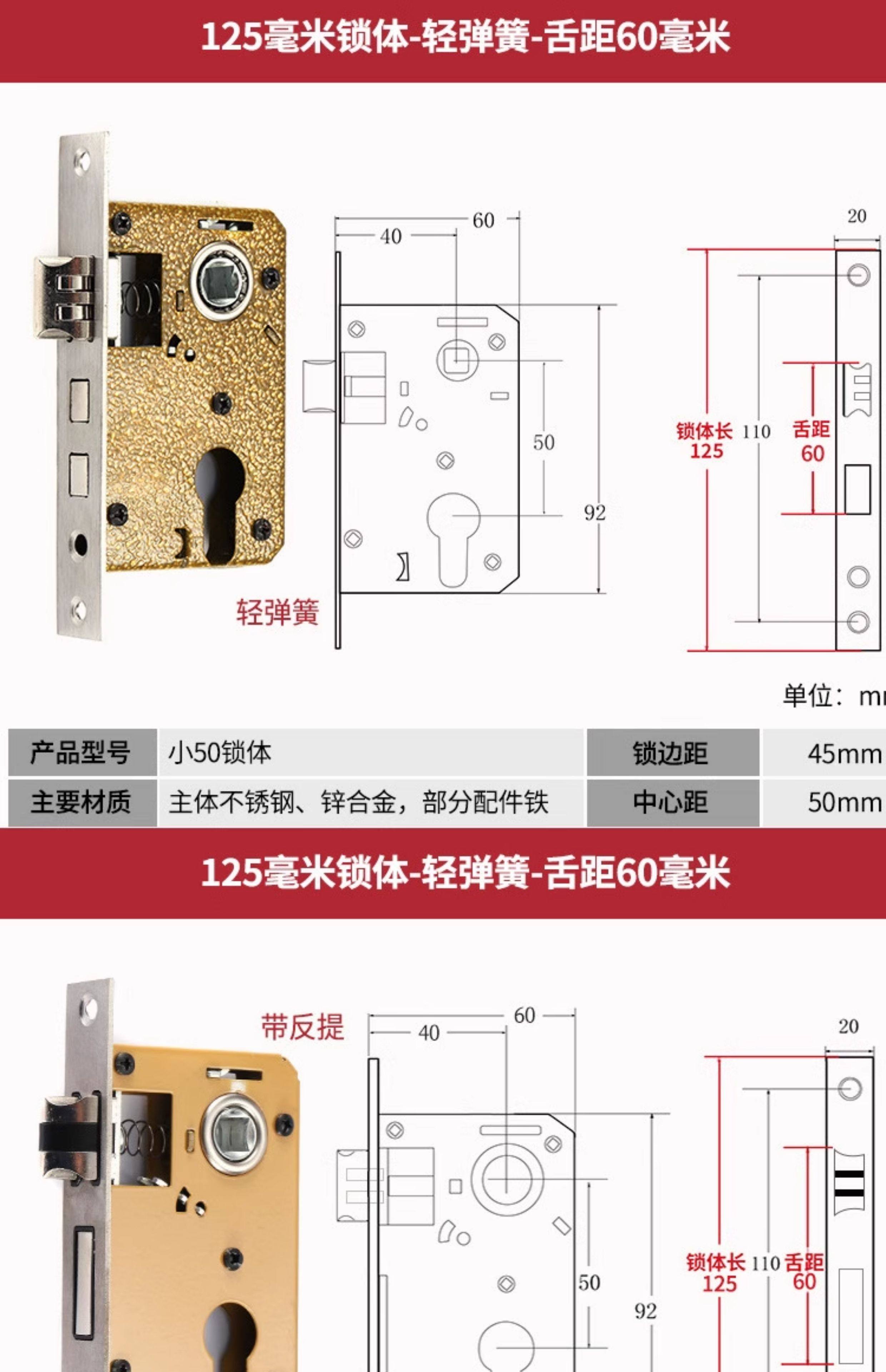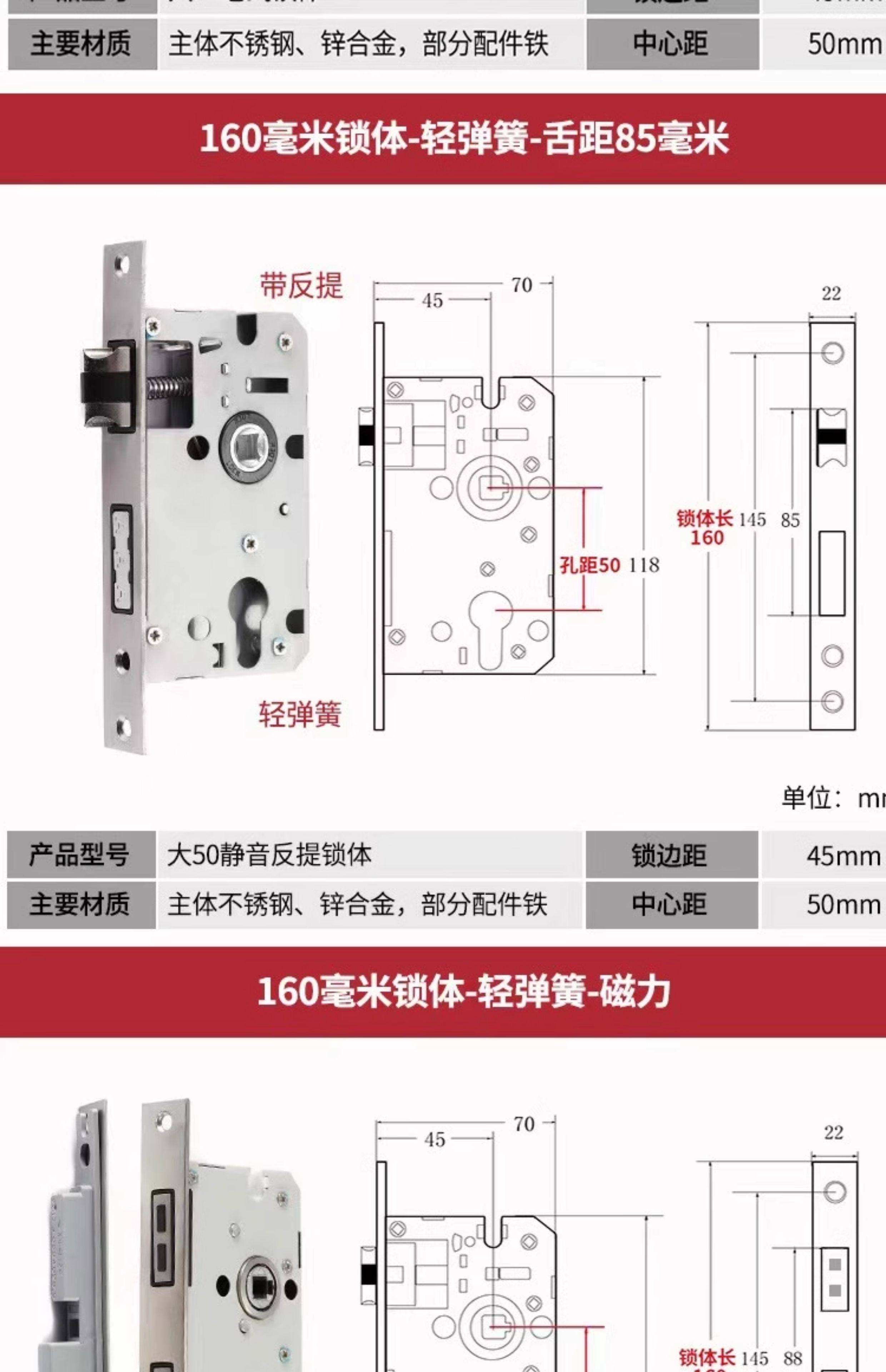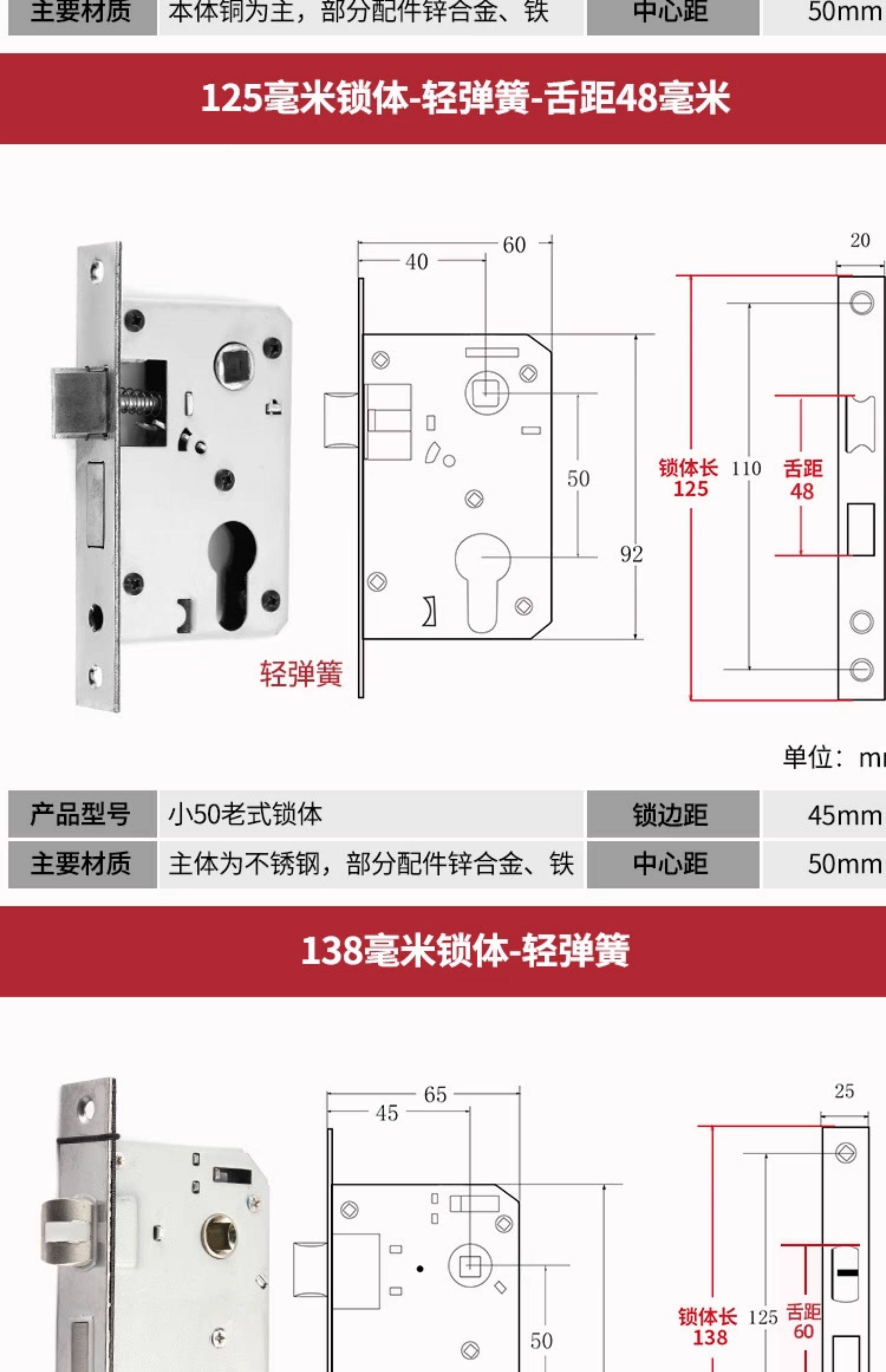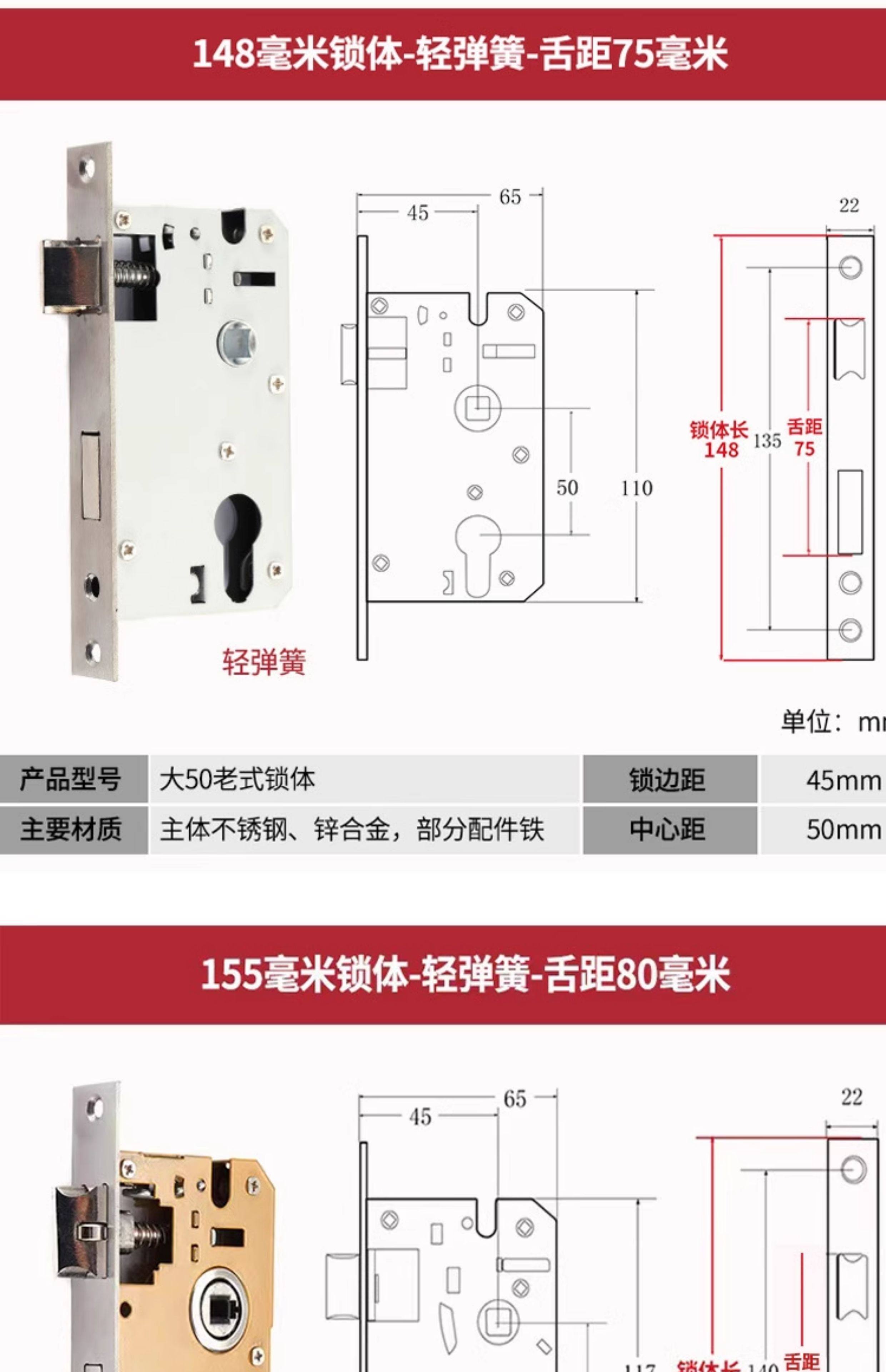 | Color Classification | Small 70 Stainless Steel Color One Copper Lock Core/Copper Key,Small 70 Black One Copper Lock Core/Copper Key,Small 70 Gold One Copper Lock Core/Copper Key,Small 70 Pure Copper Lock Cylinder One Copper Lock Cylinder/Copper Key,125 Small 50 Old-Fashioned - Light Spring - Tongue Distance 48,125 Small 50 Copper--Light Spring-Tongue Distance 48,125 Small 50 Copper Reverse Lift-Light Spring-Tongue Distance 48,125 Small 50 Bearing-Light Spring-Tongue Distance 60,125 Small 50 Silent Double Tongue-Light Spring-Tongue Distance 60,Reverse Lift 125 Small 50 Silent - Light Spring - Tongue Distance 60,135 Small 50 Copper-Light Spring-Tongue Distance 48,138 Old-Fashioned Large 50-Light Spring-Tongue Distance 60,145 Small 50 Copper-Light Spring-Tongue Distance 48,145 Old-Fashioned Large 50-Light Spring-Tongue Distance 65,145 Copper Large 50-Light Spring-Tongue Distance 68,145 Old Style Large 50-Light Spring-Tongue Distance 75,148 Old-Fashioned Large 50-Light Spring-Tongue Distance 65,148 Old-Fashioned Large 50-Light Spring-Tongue Distance 75,155 Old-Fashioned Large 50-Light Spring-Tongue Distance 65,155 Old-Fashioned Large 50-Light Spring-Tongue Distance 80,160 Large 50 Linkage-Key Door Opening-Light Spring-Tongue Distance 80,Reverse Lift 160 Large 50 Silent - Light Spring - Tongue Distance 85,Reverse Lift 160 Large 50 Bearing-Light Spring-Tongue Distance 85,160 Large 50 Silent-Light Spring-Tongue Distance 85,160 Large 50 Silent-Heavy Spring-Tongue Distance 85,Reverse Lift 160 Large 50 Three-Prong Silent High-End - Light Spring - Tongue Distance 85,160 High-End Large 50 Magnetic-Light Spring-Tongue Distance 88,165 High-End Old-Fashioned 58-Heavy Spring-Tongue Distance 93,170 Large 50 Silent Three-Prong-Light Spring-Tongue Distance 85,170 High-End Old-Fashioned 58-Heavy Spring-Tongue Distance 93,170 Long 58 Silent-Heavy Spring-Tongue Distance 93,170 High-End 58 Silent Three-Prong-Heavy Spring-Tongue Distance 95,Anti-Lift 170 High-End 58 Silent Three-Prong-Heavy Spring-Tongue Distance 95,170 High-End One Section 58 Magnetic - Heavy Spring - Tongue Distance 40,170 High-End Two-Section 58 Magnetic-Heavy Spring-Tongue Distance 93,178 Round Head 5845-Heavy Spring-Tongue Distance 93,180 Round Head 5845-Heavy Spring-Tongue Distance 95,180 Square Head High-End 58 Silent Three-Prong-Heavy Spring-Tongue Distance 95,180 Rectangular Head 7250-Heavy Spring-Small Hoist Hole,190 Long 7250-Heavy Spring-Small Hoist Hole,190 Long Round Head 7250-Heavy Spring-Small Hoist Hole,235 Long Round Head 7250-Heavy Spring-Small Hoist Hole,235 Long 72 Magnetic Section - Small Gourd,235 Long 7260 Round Head-Heavy Spring-Tongue Distance 115,240 Long 7255-Heavy Spring-Tongue Distance 115,240 Long 8550-Heavy Spring-Tongue Distance 125,240 Long 8560-Heavy Spring-Tongue Distance 125,Small 70 Stainless Steel Lock Cylinder with Zinc Core/Steel Key |
