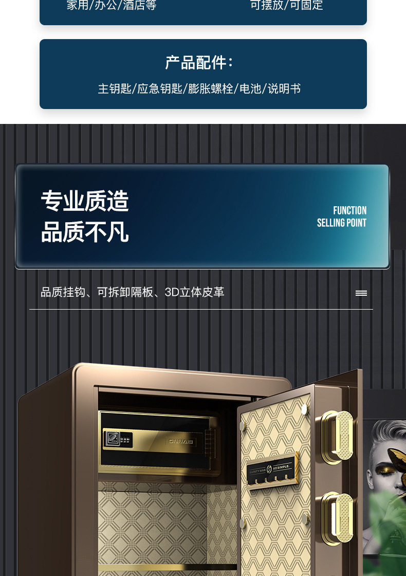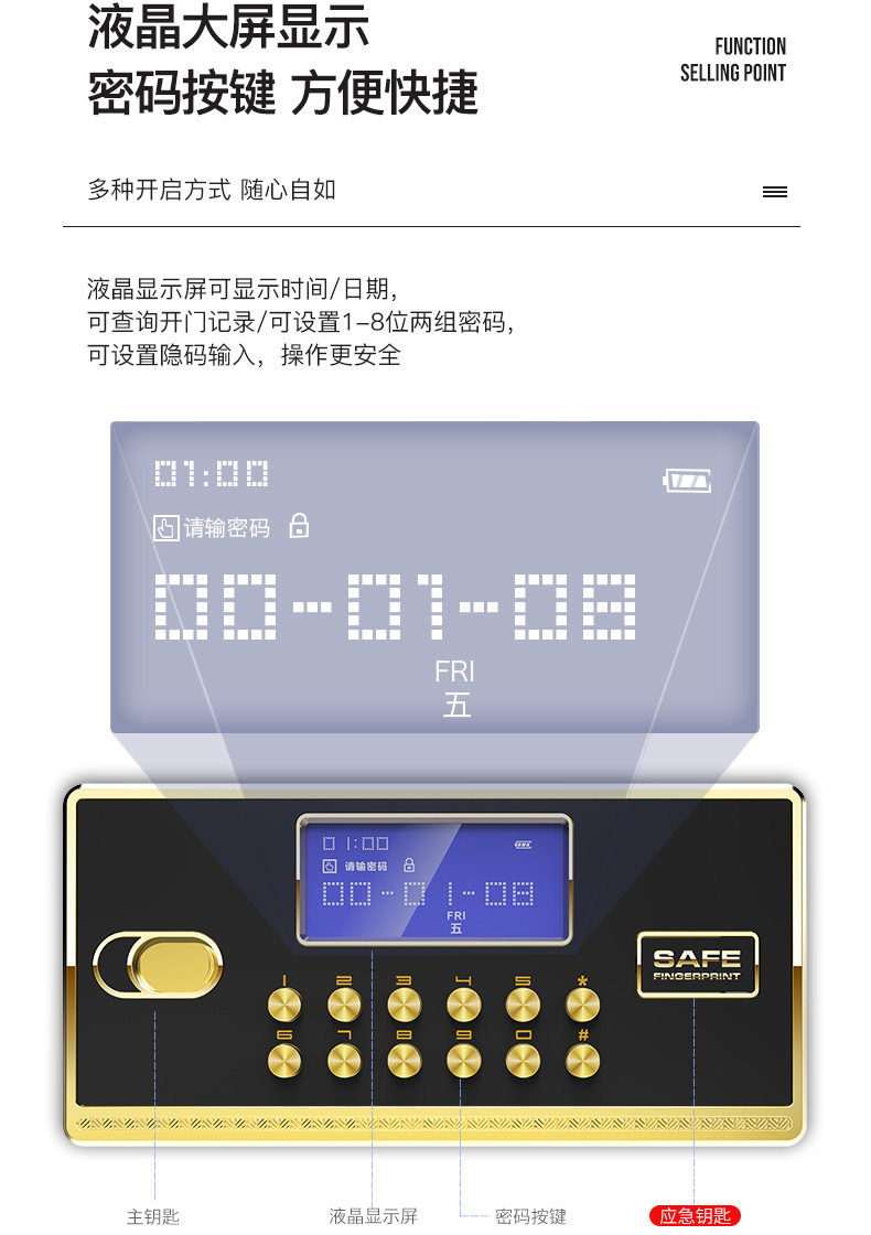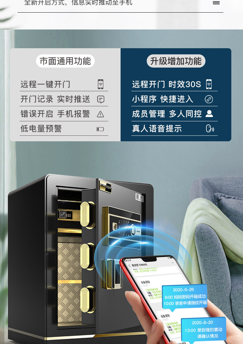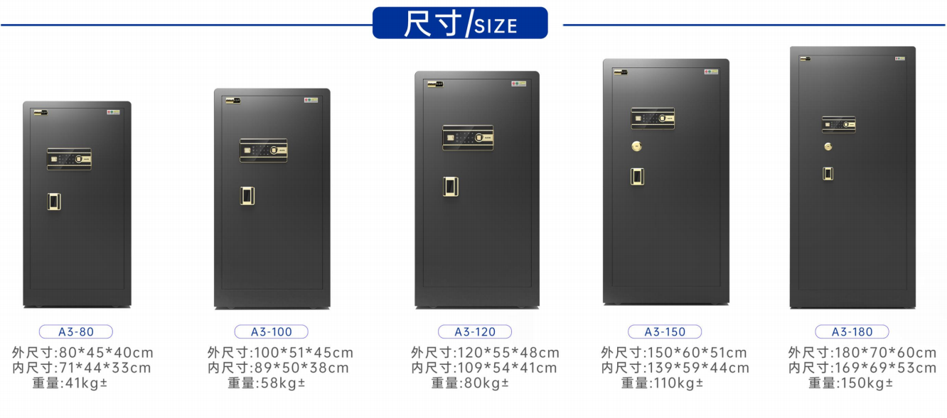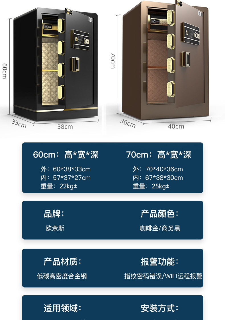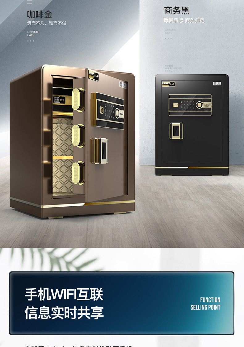 | Color Classification | [25CM]Brown Electronic Password + Key,[25CM]Noble Black Electronic Password + Key,[25CM]Brown Fingerprint + Electronic Password + Key (Remote Authorization),[25CM]Noble Black Fingerprint + Electronic Password + Key (Remote Authorization),[25CM]Noble Black Fingerprint + Electronic Password + Wifi + Key (Remote Unlocking),[30CM]Noble Black Electronic Password + Key (Double Insurance),[30CM]Coffee Gold Electronic Code + Key (Double Security),[30CM]Noble Black Fingerprint + Electronic Password + Key (Double Insurance),[30CM]Coffee Gold Fingerprint + Electronic Password + Key (Double Security),[30CM]Noble Black Upgraded Wifi Version + Key + Fingerprint Password,[40CM]Noble Black Electronic Password + Key (Double Insurance),[40CM]Coffee Gold Electronic Code + Key (Double Security),[40CM]Noble Black Fingerprint + Electronic Password + Key (Double Insurance),[40CM]Coffee Gold Fingerprint + Electronic Password + Key (Double Security),[40CM]Noble Black Upgraded Wifi Version + Fingerprint Password + Key (Double Insurance),[45CM]Noble Black Electronic Password Three-Layer Space (Lcd Display),[45CM]Coffee Gold Electronic Combination Lock Three-Tier Storage (Lcd Display),[45CM]Premium Black Electronic Combination Lock (Remote Authorization) with Interior Cabinet,[45CM]Coffee Gold Electronic Combination Lock (Remote Authorization) with Interior Cabinet,[45CM]Noble Black Fingerprint Password (Remote Authorization),[45CM]Coffee Gold Fingerprint Password (Remote Authorization),[45CM]Noble Black Fingerprint Password + Wifi (Remote Unlocking),[60CM]Noble Black Electronic Password Three-Layer Space (Lcd Display),[60CM]Coffee Gold Electronic Combination Lock Three-Tier Storage (Lcd Display),[60CM]Coffee Gold Electronic Combination Lock (Remote Authorization) with Interior Cabinet,[60CM]Premium Black Electronic Combination Lock (Remote Authorization) with Interior Cabinet,[60CM]Noble Black Fingerprint Password (Remote Authorization),[60CM]Coffee Gold Fingerprint Password (Remote Authorization),[60CM]Noble Black Fingerprint + Electronic Password + Wifi (Remote Unlocking),[70CM]Noble Black Electronic Password (Lcd Display),[70CM]Noble Black Fingerprint + Electronic Password (Remote Authorization),[70CM]Noble Black Fingerprint + Electronic Password + Wifi (Remote Unlocking),[80CM]Coffee Gold Electronic Safe (Combination Lock + Hidden Code Function),[80CM]Business Black Electronic Safe (Combination Lock + Hidden Code Function),[80CM]Coffee Gold Fingerprint + Electronic Password (Remote Authorization + Dual Alarm),[80CM]Business Black Fingerprint + Electronic Password (Remote Unlocking + Double Alarm),[80CM]Business Black Fingerprint + Electronic Password + Wifi (Remote Unlock + Dual Alarm),[100CM]Coffee Gold Electronic Safe (Combination Lock + Hidden Code Function),[100CM]Business Black Electronic Safe (Combination Lock + Hidden Code Function),[100CM]Coffee Gold Fingerprint + Electronic Password (Remote Authorization + Dual Alarm),[100CM]Business Black Fingerprint + Electronic Password (Remote Unlocking + Double Alarm),[100CM]Business Black Fingerprint + Electronic Password + Wifi (Remote Unlock + Dual Alarm) |