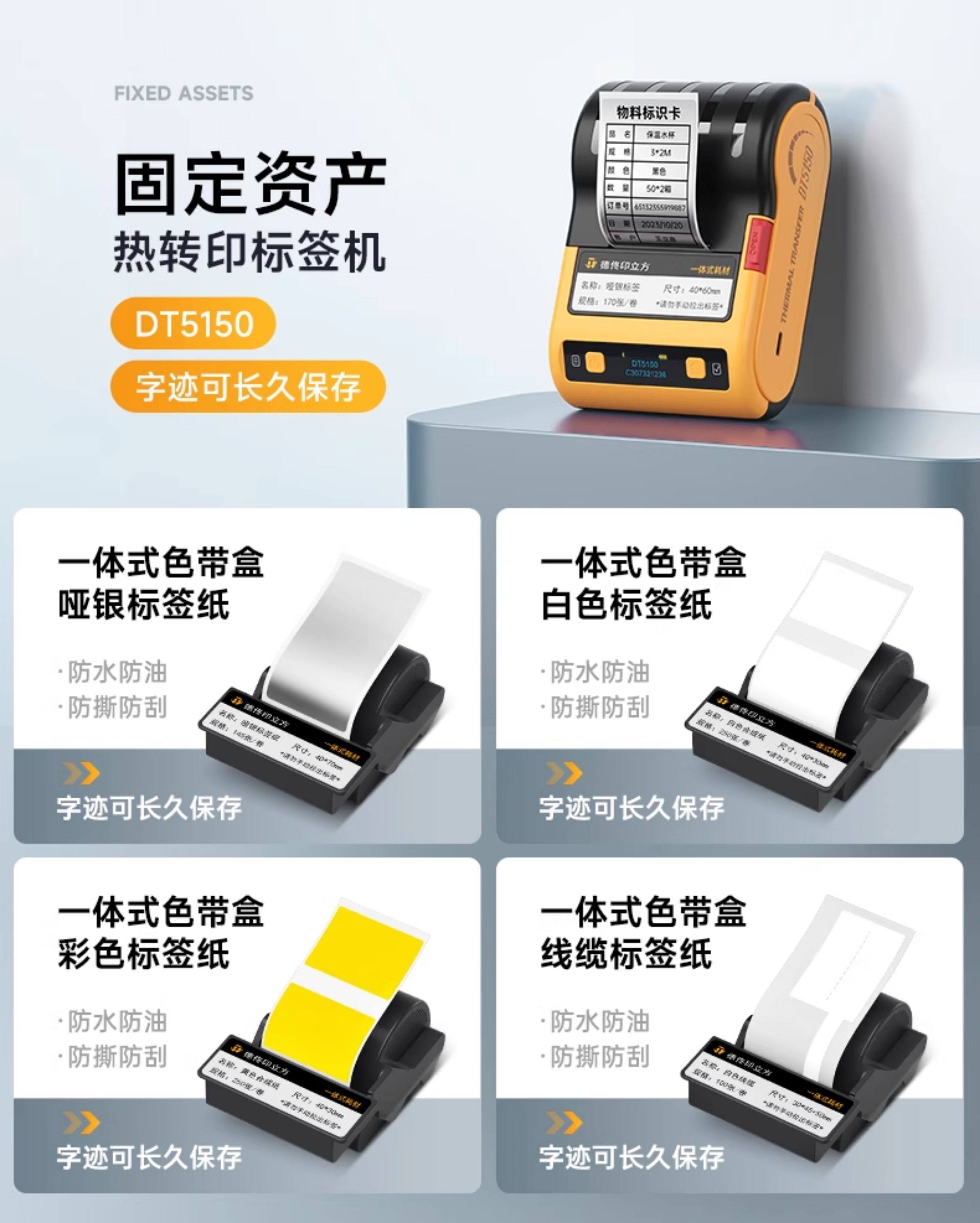 Detong Office Dt5150 Thermal Transfer Label Printer, Small Smart Portable Fixed Asset Qr Code Waterproof Matte Silver Equipment, Handheld Ribbon Label Machine, Multi-Functional