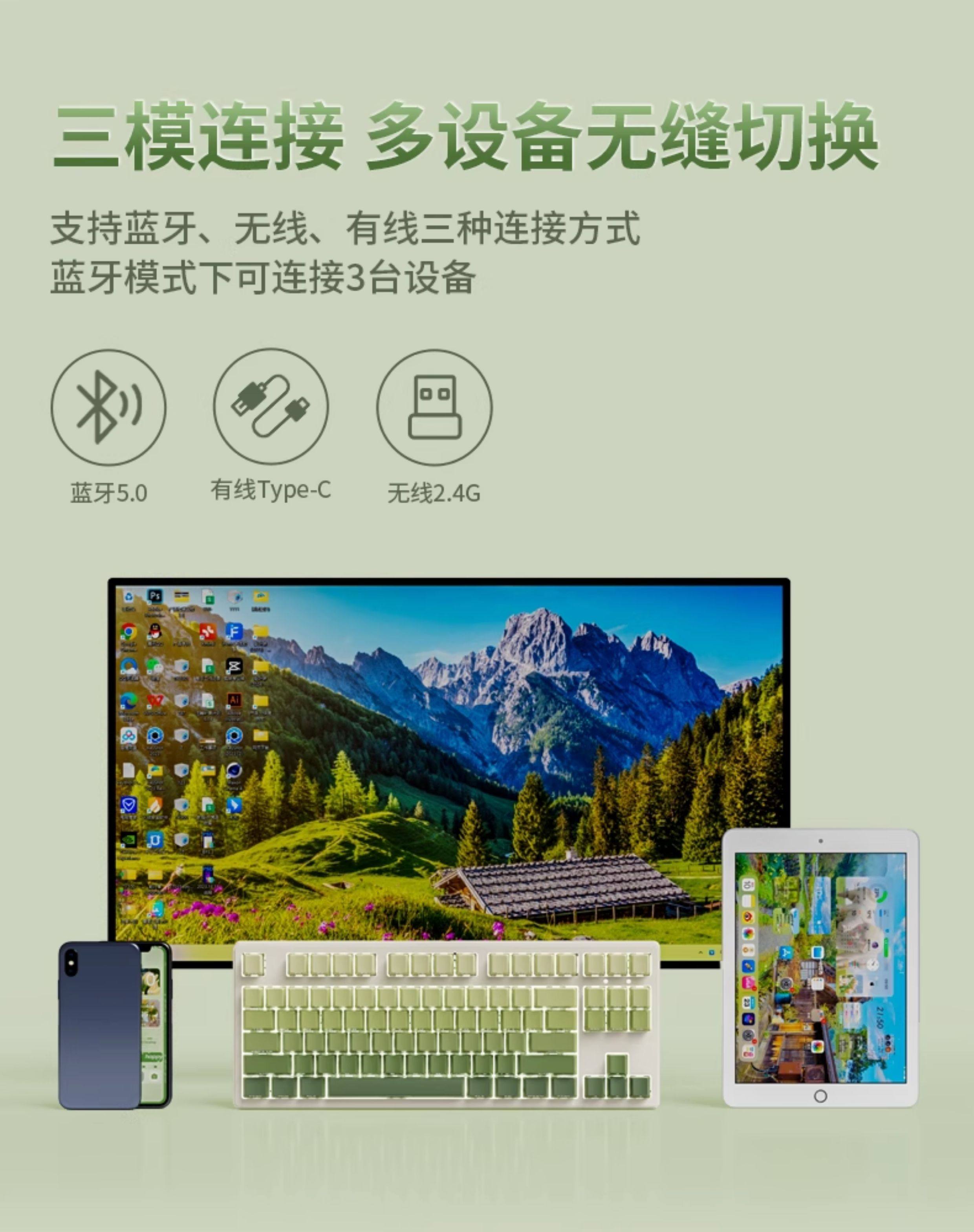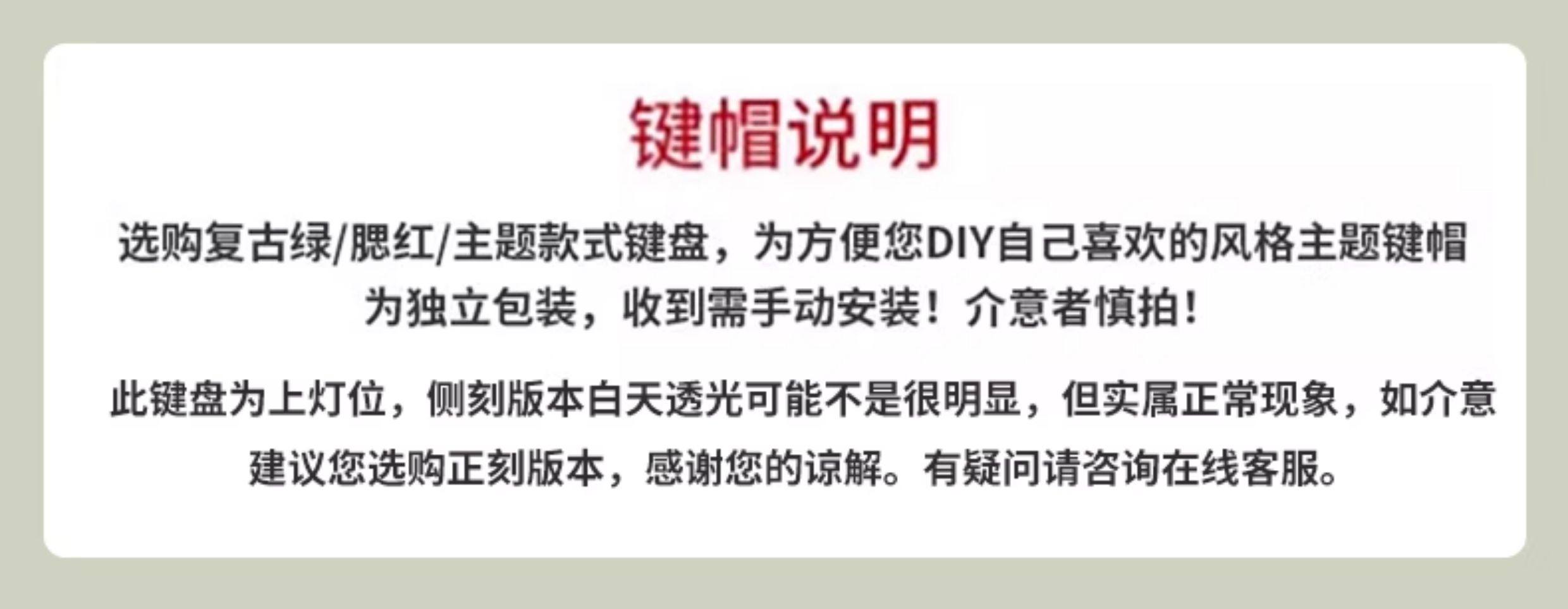 | Color Classification | Switch Buying Guide,Contact Customer Service to Get a Large Table Mat,White 87 Keys[White Light]Wireless Bluetooth Three-Mode,Retro Green 87 Keys[White Light - Side Engraving]Wireless Bluetooth Three-Mode,Blush 87-Key[White Light-Positive Engraving]Wireless Bluetooth Three-Mode,Blush 87-Key[White Light - Side Engraving]Wireless Bluetooth Three-Mode.,White 108 Keys[White Light]Wireless Bluetooth Three-Mode,Retro Green 108 Keys[White Light - Side Engraving]Wireless Bluetooth Three-Mode,Blush 108 Keys[White Light-Positive Engraving]Wireless Bluetooth Three-Mode,Blush 108 Keys[White Light - Side Engraving]Wireless Bluetooth Three-Mode,--Wireless Kit Options Available--,Retro Green 87 Keys[White Light - Side Engraving]Wireless Bluetooth Three-Mode + Wireless Bluetooth Mouse,Blush 87-Key[White Light - Side Engraving]Wireless Bluetooth Three-Mode + Wireless Bluetooth Mouse,Blush 87-Key[White Light-Positive Engraving]Wireless Bluetooth Three-Mode + Wireless Bluetooth Mouse,Retro Green 108 Keys[White Light - Side Engraving]Wireless Bluetooth Three-Mode + Wireless Bluetooth Mouse,Blush 108 Keys[White Light - Side Engraving]Wireless Bluetooth Three-Mode + Wireless Bluetooth Mouse,Blush 108 Keys[White Light-Positive Engraving]Wireless Bluetooth Three-Mode + Wireless Bluetooth Mouse |