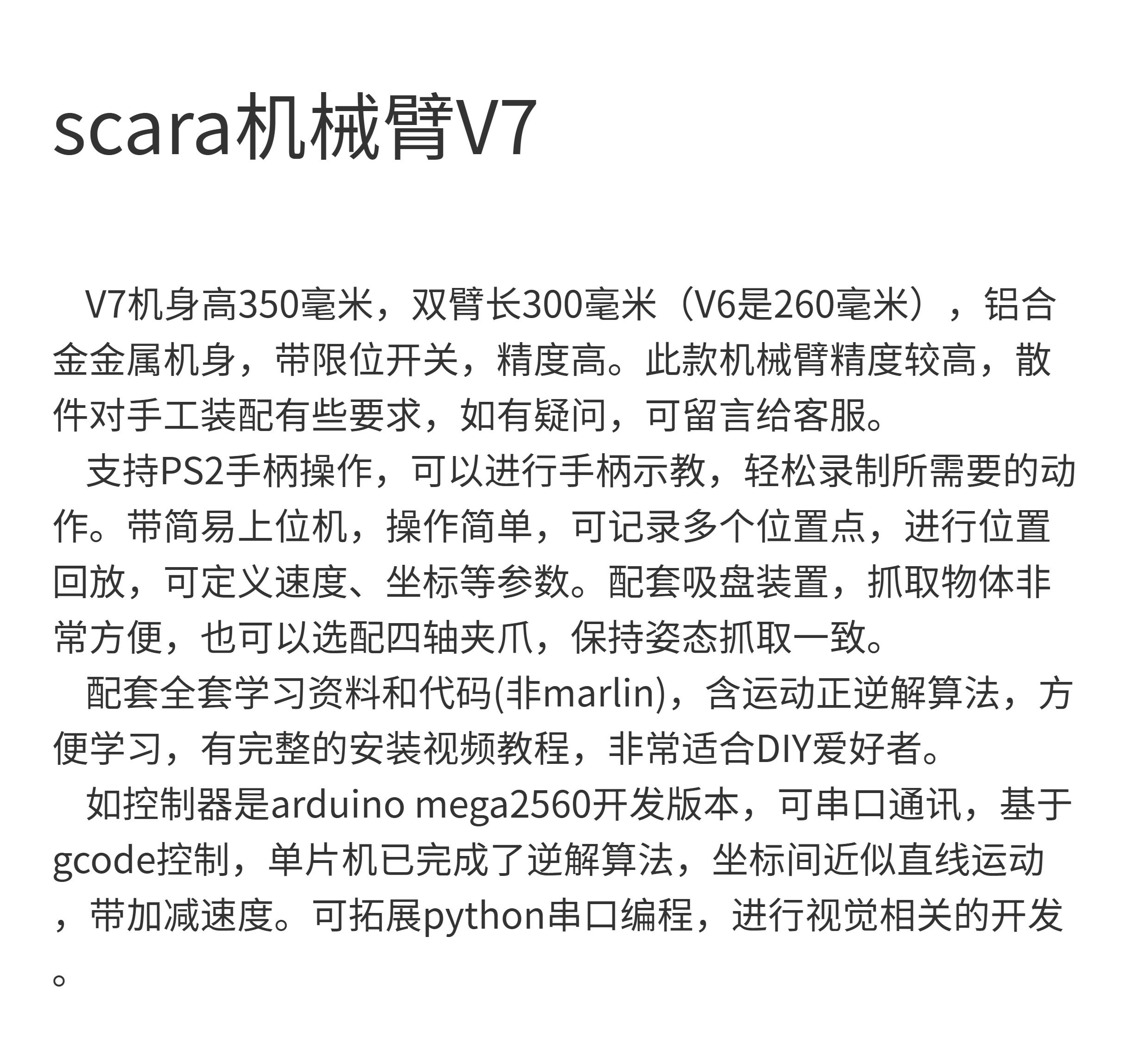 | Color Classification | Parts a (Printed Parts + Aluminum Alloy + Screw + Bearing + Synchronous Wheel + Screw),Spare Parts B (Printed Parts + Aluminum Alloy + Screw + Bearing + Synchronous Wheel + Screw + Three 42 Motors + Limit Switch),Parts C (Full Set of Parts + Controller Arduino Mega2560 + Suction Cup Kit + Ps2 Handle + A4988 Driver),Cost a (Unit Installed,Without Controller),Recommended Finished Product B (Main Unit + Arduino Mega 2560 Controller + Suction Cup Kit + Ps2 Controller + A4988 Driver),Finished Product C (Body + Controller Arduino Mega2560 + Four-Axis Automatic Rotating Claw + Ps2 Handle + A4988 Driver),Finished D Closed Loop (Closed Loop Driver + Body + Controller Arduino Mega2560 + Suction Cup Kit + Ps2 Handle) Recommended,Accessory 1 (Finished Product-Suction Cup Kit,Includes Power Supply and Air Pump),Accessory 2 (Finished Product - Four-Axis Rotating Clamp,Contains Two Servos),Accessory 3 (Camera + Bracket),Accessory 4 (E.G., if the Network Lacks Baidu Cloud Storage),Optional Kingston 64g USB Flash Drive Complete Set of Information,Need to Purchase Matching Products) |