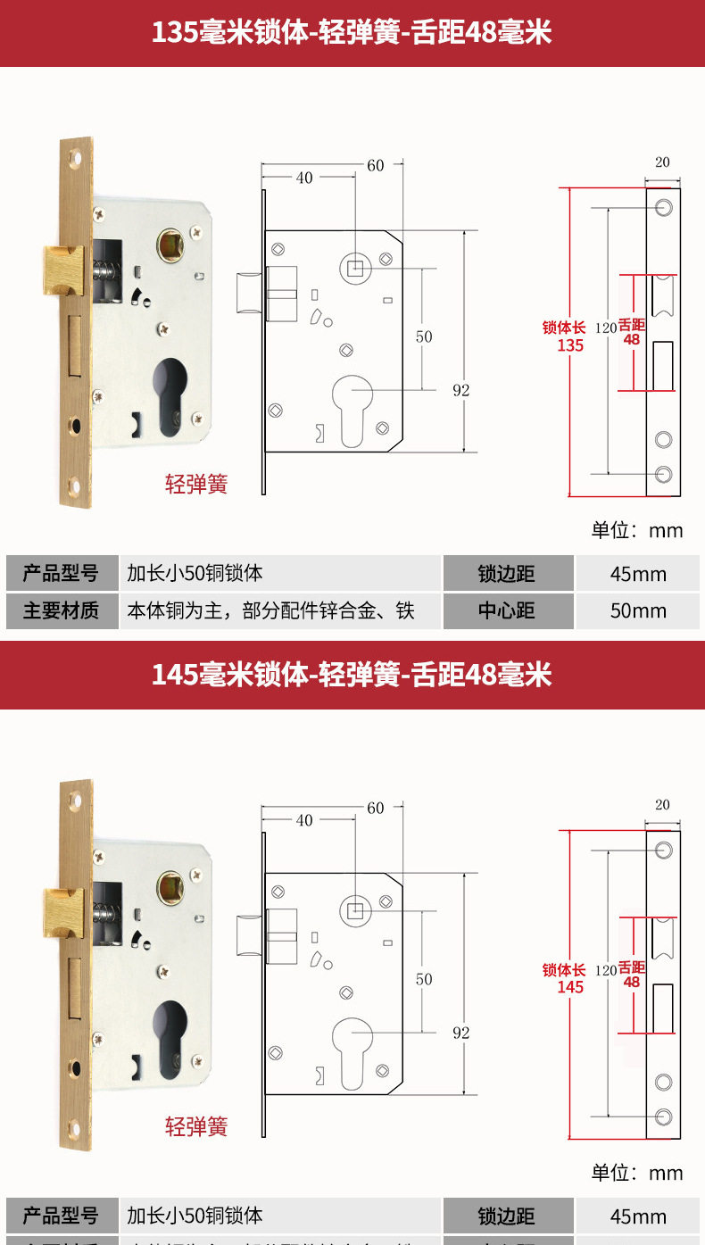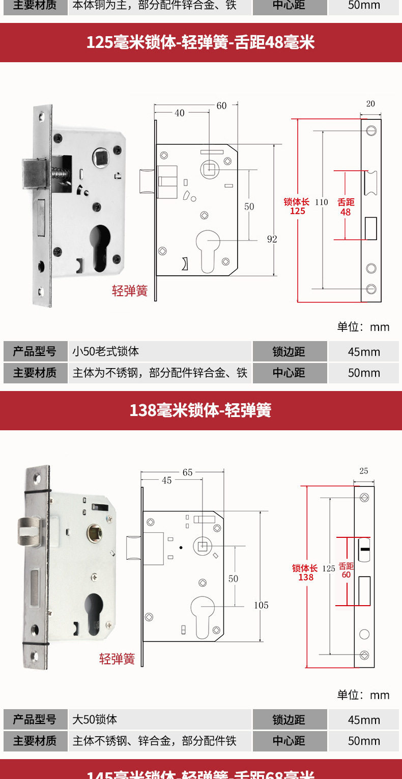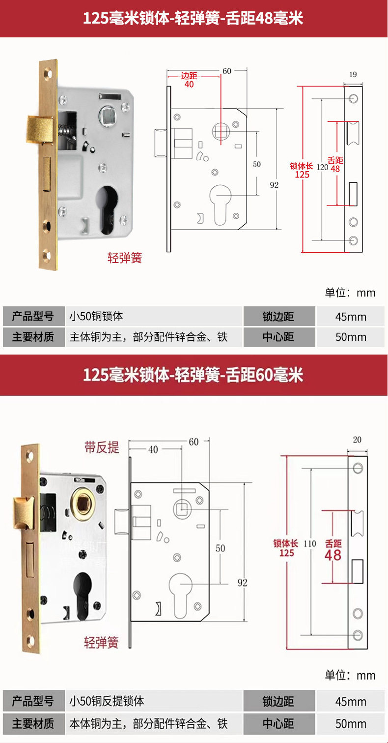 | Color Classification | 125 Small 50 Lock Body + Lock Cylinder[Copper Beads/Copper Keys/Copper Cores],[Upgrade Quality]125 Small 50 Copper-Tongue Distance 48+Lock Core[Copper Beads/Copper Keys/Copper Cores],[Upgrade Quality]125 Small 50 Copper Reverse Lift - Tongue Distance 48 + Lock Core[Copper Beads/Copper Keys/Copper Cores],125 Small 50 Silent Double Tongue-Tongue Distance 60+ Lock Core[Copper Beads/Copper Keys/Copper Cores],125 Small 50 Silencer Bearing-Tongue Distance 60+Lock Core[Copper Beads/Copper Keys/Copper Cores],125 Small 50 Silent Reverse Lift - Tongue Distance 60 + Lock Core[Copper Beads/Copper Keys/Copper Cores],125 Small 50 High-End Magnet-Single Tongue + Lock Core[Copper Beads/Copper Keys/Copper Cores],125 Small 50 Copper-Tongue Distance 48+Lock Core[Copper Beads/Copper Key/Zinc Core],125 Small 50 Copper Reverse Lift - Tongue Distance 48 + Lock Core[Copper Beads/Copper Key/Zinc Core],-----The Following Styles Do Not Include Lock Cylinders------,135 Small 50 Copper-Light Spring-Tongue Distance 48,138 Old-Fashioned Large 50-Light Spring-Tongue Distance 60,145 Small 50 Copper-Light Spring-Tongue Distance 48,145 Old-Fashioned Large 50-Light Spring-Tongue Distance 65,145 Copper Large 50-Light Spring-Tongue Distance 68,145 Old Style Large 50-Light Spring-Tongue Distance 75,148 Old-Fashioned Large 50-Light Spring-Tongue Distance 65,155 Old-Fashioned Large 50-Light Spring-Tongue Distance 65,155 Old-Fashioned Large 50-Light Spring-Tongue Distance 80,160 Large 50 Linkage-Key Door Opening-Light Spring-Tongue Distance 80,Reverse Lift 160 Large 50 Bearing-Light Spring-Tongue Distance 85,160 Large 50 Silent-Light Spring-Tongue Distance 85,160 Large 50 Silent-Heavy Spring-Tongue Distance 85,Reverse Lift 160 Large 50 Three-Prong Silent High-End - Light Spring - Tongue Distance 85,160 High-End Large 50 Magnetic-Light Spring-Tongue Distance 88,165 High-End Old-Fashioned 58-Heavy Spring-Tongue Distance 95,170 Large 50 Silent Three-Prong-Light Spring-Tongue Distance 85,170 High-End Old-Fashioned 58-Heavy Spring-Tongue Distance 95,170 Long 58 Silent-Heavy Spring-Tongue Distance 95,170 High-End 58 Silent Three-Prong-Heavy Spring-Tongue Distance 95,Anti-Lift 170 High-End 58 Silent Three-Prong-Heavy Spring-Tongue Distance 95,170 High-End One Section 58 Magnetic - Heavy Spring - Tongue Distance 40,170 High-End Two-Section 58 Magnetic-Heavy Spring-Tongue Distance 90,178 Round Head 5845-Heavy Spring-Tongue Distance 92,180 Round Head 5845-Heavy Spring-Tongue Distance 92,180 Square Head High-End 58 Silent Three-Prong-Heavy Spring-Tongue Distance 95,180 Rectangular Head 7250-Heavy Spring-Small Hoist Hole,190 Long 7250-Heavy Spring-Small Hoist Hole,190 Long Round Head 7250-Heavy Spring-Small Hoist Hole,235 Long Round Head 7250-Heavy Spring-Small Hoist Hole,235 Long 72 Magnetic Section - Small Gourd,235 Long 7255 Round Head-Heavy Spring-Tongue Distance 115,235 Long 7260 Round Head-Heavy Spring-Tongue Distance 115,240 Long 7255-Heavy Spring-Tongue Distance 115,240 Long 8560-Heavy Spring-Tongue Distance 125 |