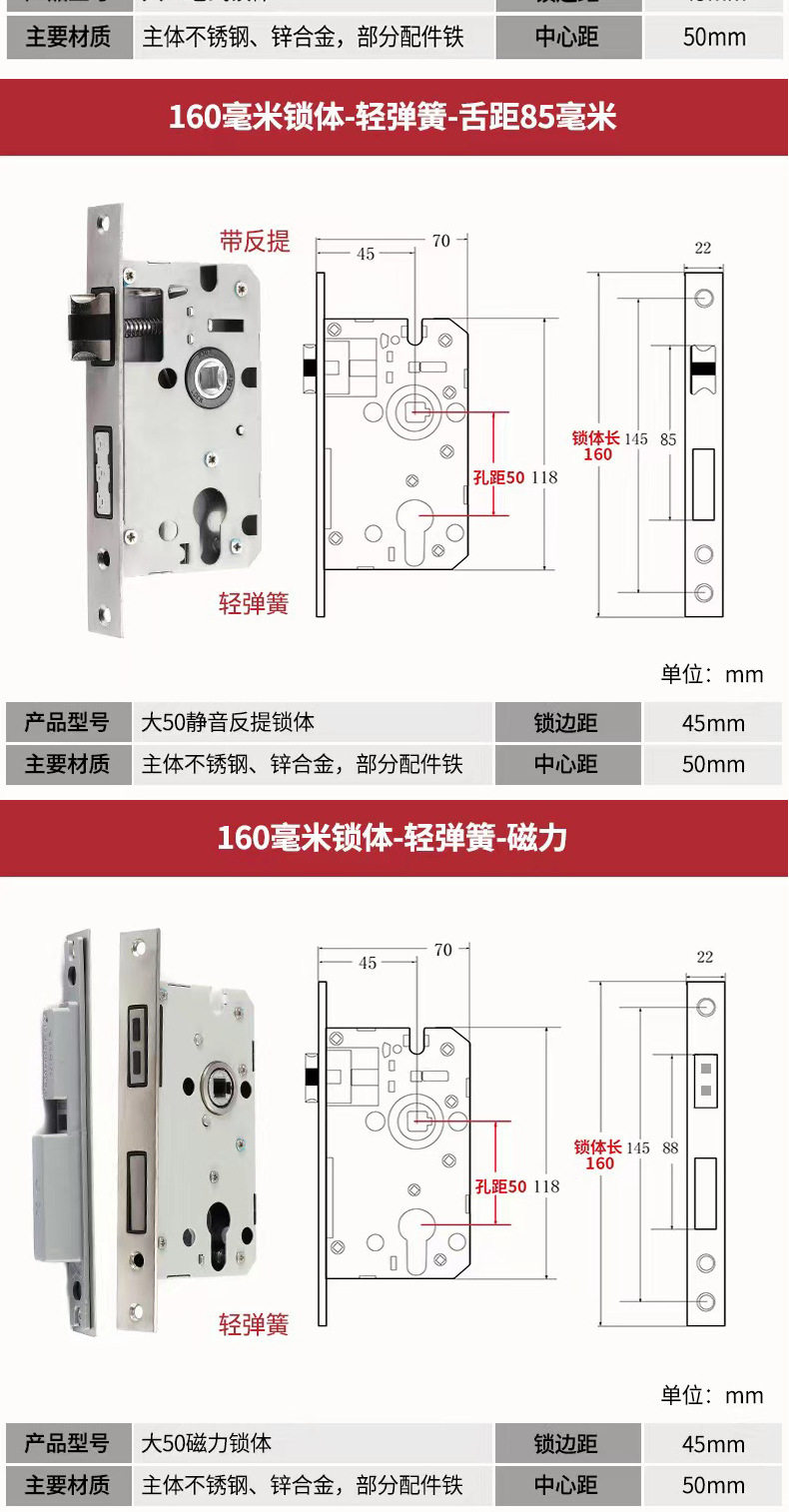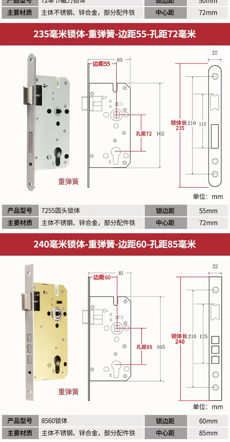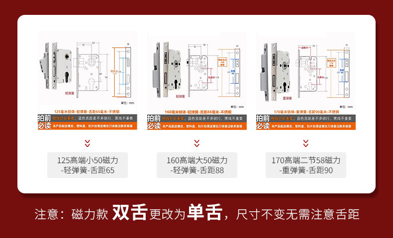 | Color Classification | 125 Small 50 Lock Body + Lock Cylinder[Copper Beads/Copper Keys/Copper Cores],[Upgrade Quality]125 Small 50 Copper-Tongue Distance 48+Lock Core[Copper Beads/Copper Keys/Copper Cores],[Upgrade Quality]125 Small 50 Copper Reverse Lift - Tongue Distance 48 + Lock Core[Copper Beads/Copper Keys/Copper Cores],125 Small 50 Silent Double Tongue-Tongue Distance 60+ Lock Core[Copper Beads/Copper Keys/Copper Cores],125 Small 50 Silencer Bearing-Tongue Distance 60+Lock Core[Copper Beads/Copper Keys/Copper Cores],125 Small 50 Silent Reverse Lift - Tongue Distance 60 + Lock Core[Copper Beads/Copper Keys/Copper Cores],125 Small 50 High-End Magnet-Single Tongue + Lock Core[Copper Beads/Copper Keys/Copper Cores],125 Small 50 Copper-Tongue Distance 48+Lock Core[Copper Beads/Copper Key/Zinc Core],125 Small 50 Copper Reverse Lift - Tongue Distance 48 + Lock Core[Copper Beads/Copper Key/Zinc Core],-----The Following Styles Do Not Include Lock Cylinders------,135 Small 50 Copper-Light Spring-Tongue Distance 48,138 Old-Fashioned Large 50-Light Spring-Tongue Distance 60,145 Small 50 Copper-Light Spring-Tongue Distance 48,145 Old-Fashioned Large 50-Light Spring-Tongue Distance 65,145 Copper Large 50-Light Spring-Tongue Distance 68,145 Old Style Large 50-Light Spring-Tongue Distance 75,148 Old-Fashioned Large 50-Light Spring-Tongue Distance 65,155 Old-Fashioned Large 50-Light Spring-Tongue Distance 65,155 Old-Fashioned Large 50-Light Spring-Tongue Distance 80,160 Large 50 Linkage-Key Door Opening-Light Spring-Tongue Distance 80,Reverse Lift 160 Large 50 Bearing-Light Spring-Tongue Distance 85,160 Large 50 Silent-Light Spring-Tongue Distance 85,160 Large 50 Silent-Heavy Spring-Tongue Distance 85,Reverse Lift 160 Large 50 Three-Prong Silent High-End - Light Spring - Tongue Distance 85,160 High-End Large 50 Magnetic-Light Spring-Tongue Distance 88,165 High-End Old-Fashioned 58-Heavy Spring-Tongue Distance 95,170 Large 50 Silent Three-Prong-Light Spring-Tongue Distance 85,170 High-End Old-Fashioned 58-Heavy Spring-Tongue Distance 95,170 Long 58 Silent-Heavy Spring-Tongue Distance 95,170 High-End 58 Silent Three-Prong-Heavy Spring-Tongue Distance 95,Anti-Lift 170 High-End 58 Silent Three-Prong-Heavy Spring-Tongue Distance 95,170 High-End One Section 58 Magnetic - Heavy Spring - Tongue Distance 40,170 High-End Two-Section 58 Magnetic-Heavy Spring-Tongue Distance 90,178 Round Head 5845-Heavy Spring-Tongue Distance 92,180 Round Head 5845-Heavy Spring-Tongue Distance 92,180 Square Head High-End 58 Silent Three-Prong-Heavy Spring-Tongue Distance 95,180 Rectangular Head 7250-Heavy Spring-Small Hoist Hole,190 Long 7250-Heavy Spring-Small Hoist Hole,190 Long Round Head 7250-Heavy Spring-Small Hoist Hole,235 Long Round Head 7250-Heavy Spring-Small Hoist Hole,235 Long 72 Magnetic Section - Small Gourd,235 Long 7255 Round Head-Heavy Spring-Tongue Distance 115,235 Long 7260 Round Head-Heavy Spring-Tongue Distance 115,240 Long 7255-Heavy Spring-Tongue Distance 115,240 Long 8560-Heavy Spring-Tongue Distance 125 |