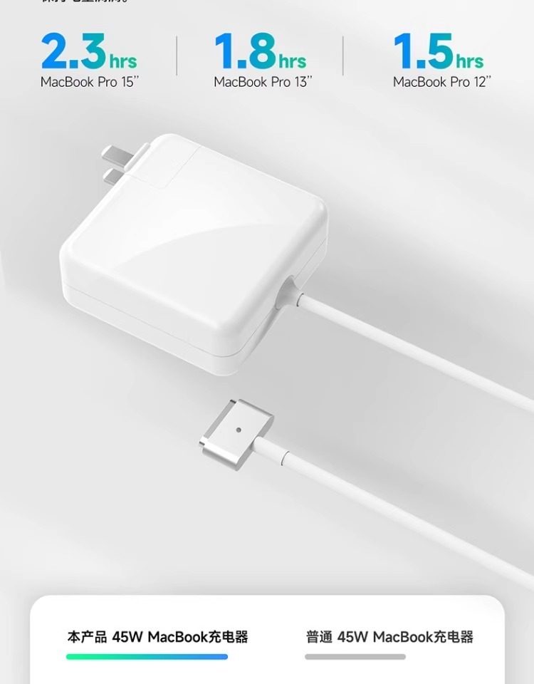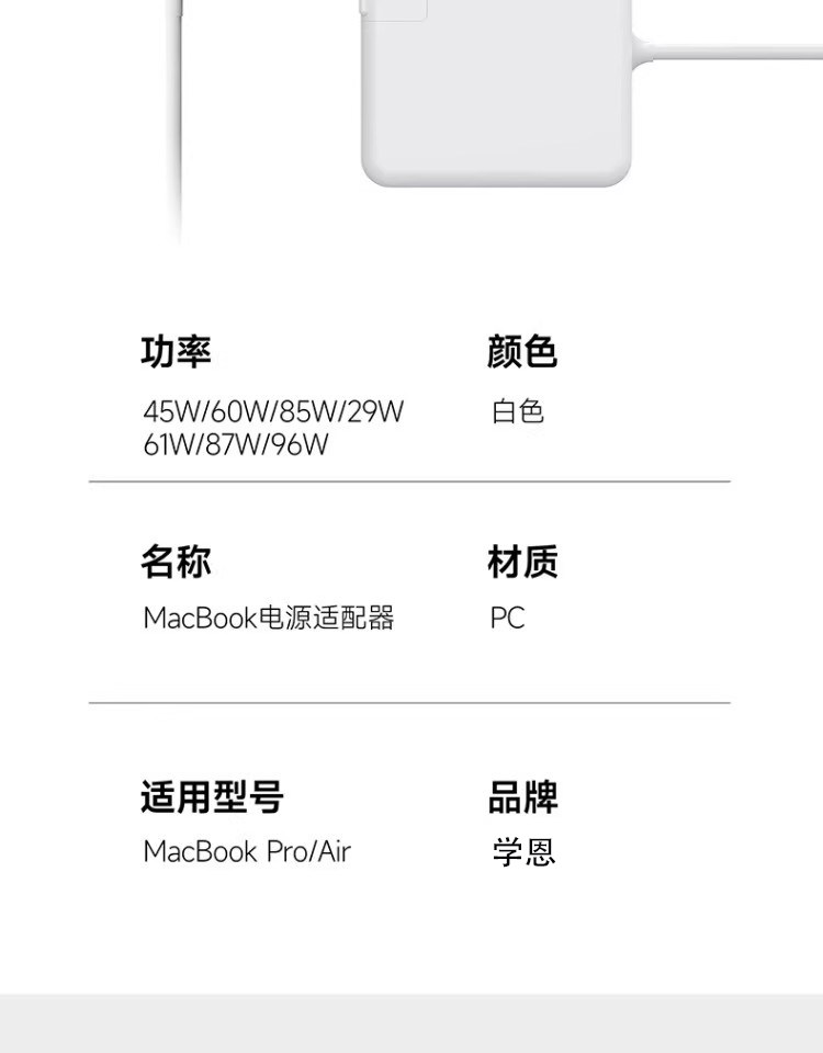 | Color Classification | 45W 14.5V3.1A Generation/L-Head[National 3C Certificationâ 3 Years Warranty],45W 14.85V3.05A Second Generation/T Head[National 3C Certificationâ 3 Years Warranty],60W 16.5V3.65A Generation/L Head[National 3C Certificationâ 3 Years Warranty],60W 16.5V3.65A Second Generation/T Head[National 3C Certificationâ 3 Years Warranty],85W 18.5V4.6A Generation/L Head[National 3C Certificationâ 3 Years Warranty],85W 20V4.25A. Second Generation/T Head[National 3C Certificationâ 3 Years Warranty],29W 14.5V2.0A Type-C[National 3C Certificationâ 3 Years Warranty],61W 20.3V3.0A Type-C[National 3C Certificationâ 3 Years Warranty],87W 20.2V4.3A Type-C[National 3C Certificationâ 3 Years Warranty],96W 20.5V4.7A Type-C[National 3C Certificationâ 3 Years Warranty],[87W Set]A2442 A2681.âď¸Official Certification|Magsafe 3â,[96W Set]A2779âď¸Official Certification|Magsafe 3â,3-Year Warranty, Replace if Broken |